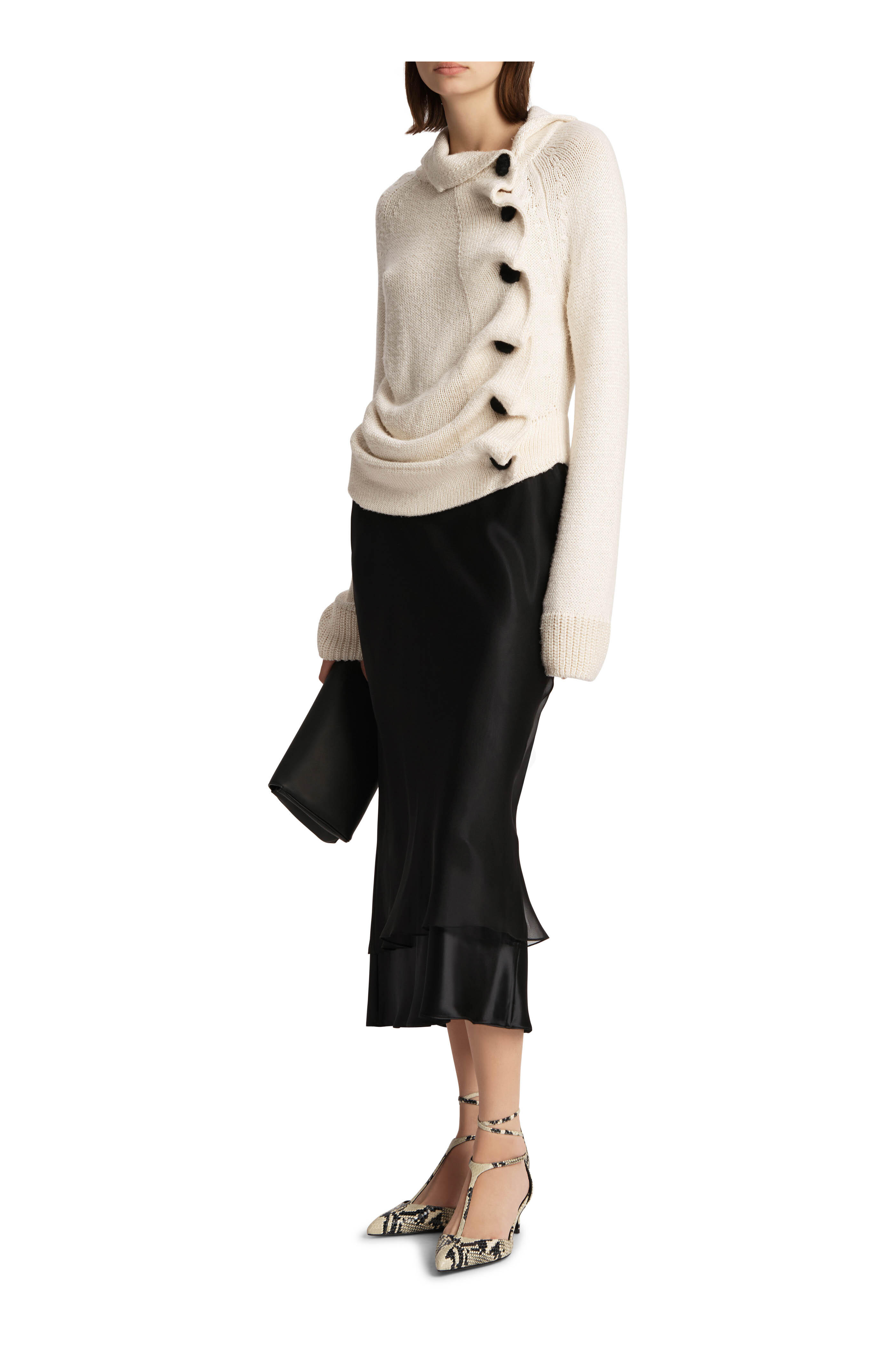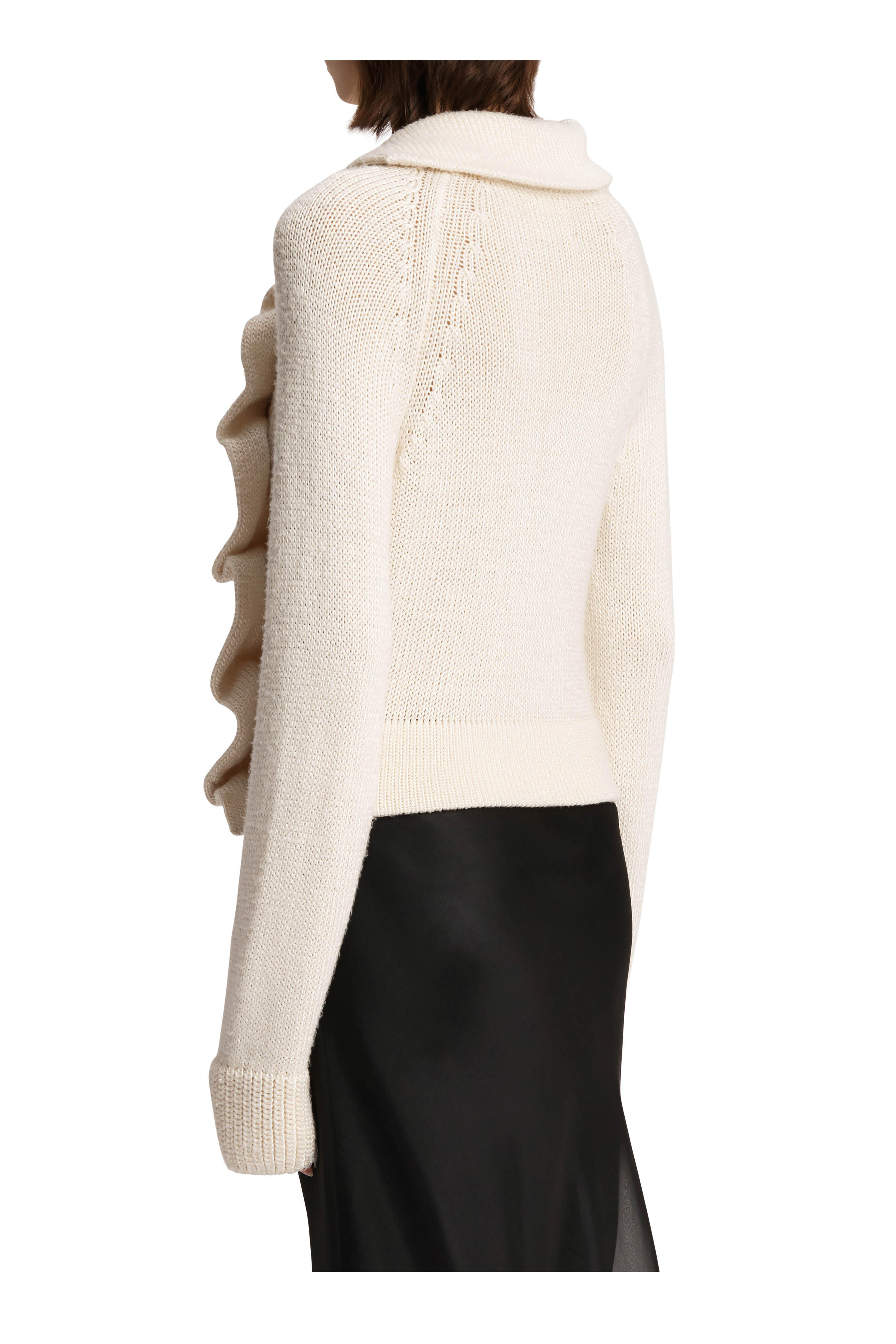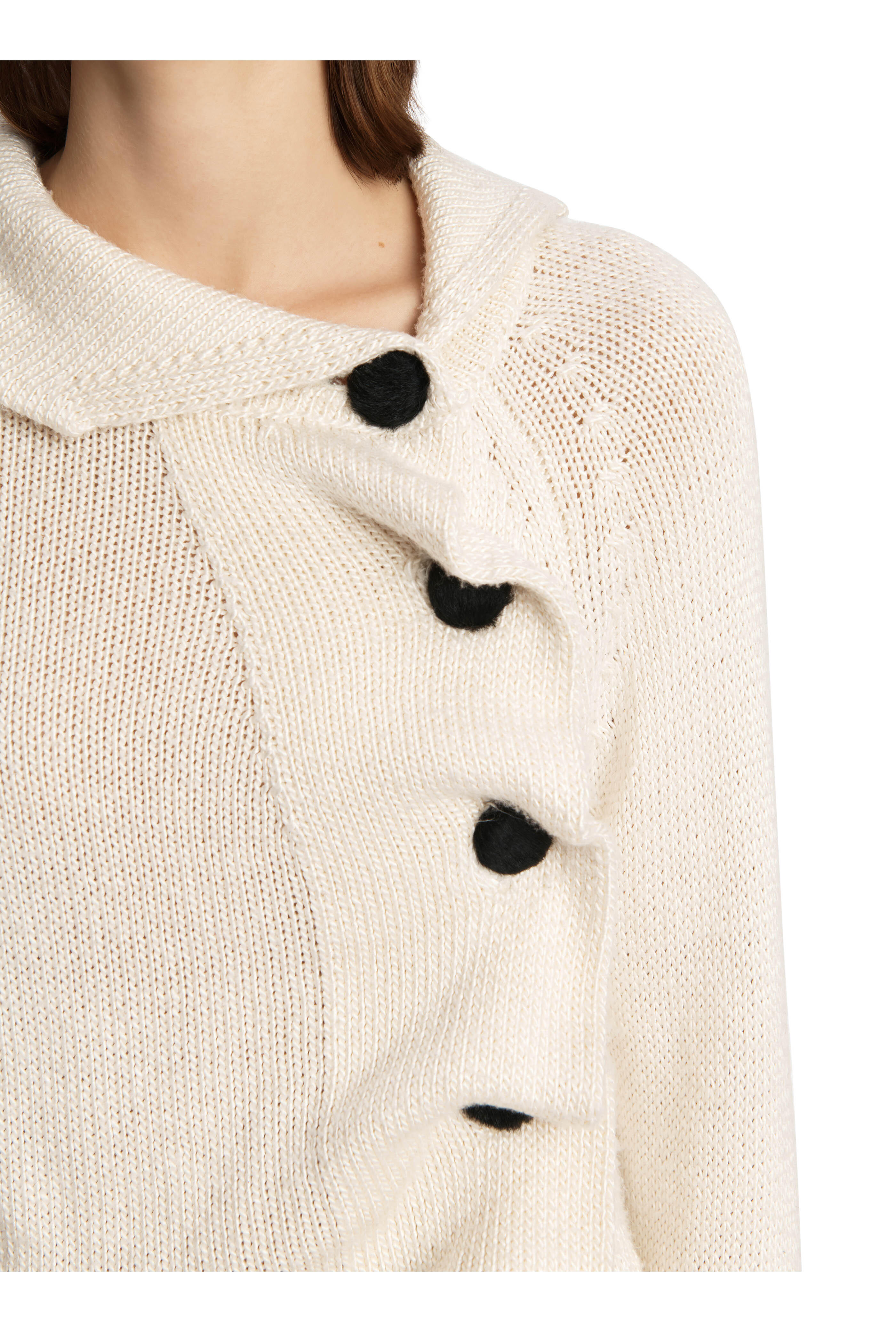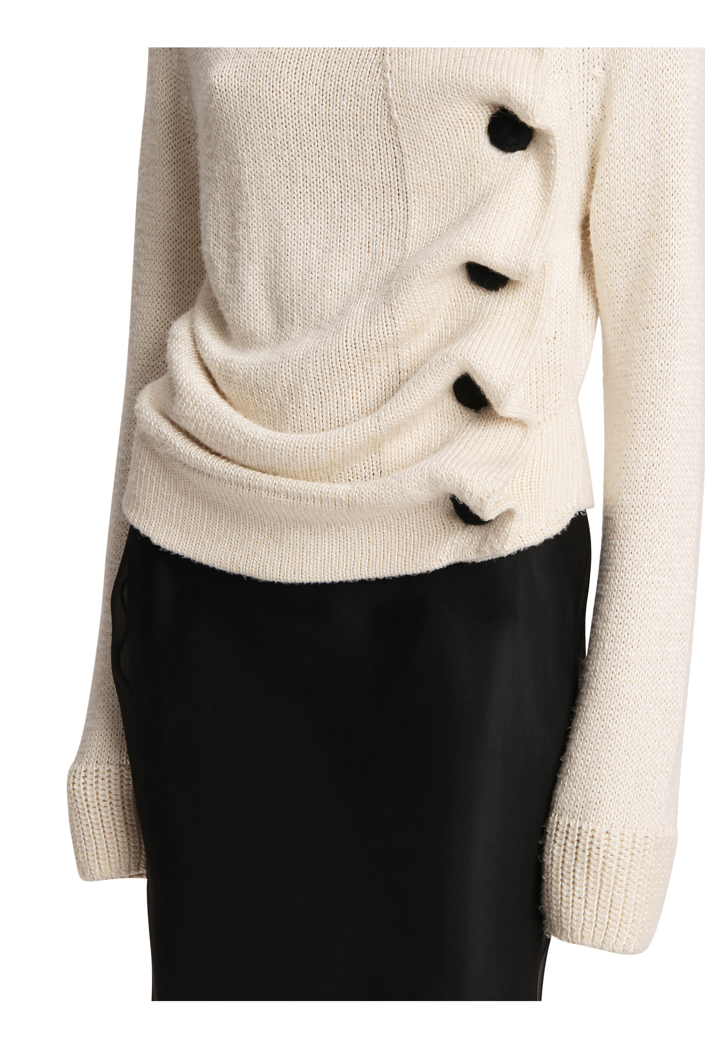 Draped collar. Off center button placket. Calf-hair buttons. Ribbed knit trim. Soft pleats when buttoned. Hand knit in New York. Made in the USA. 100% silk. Dry clean.