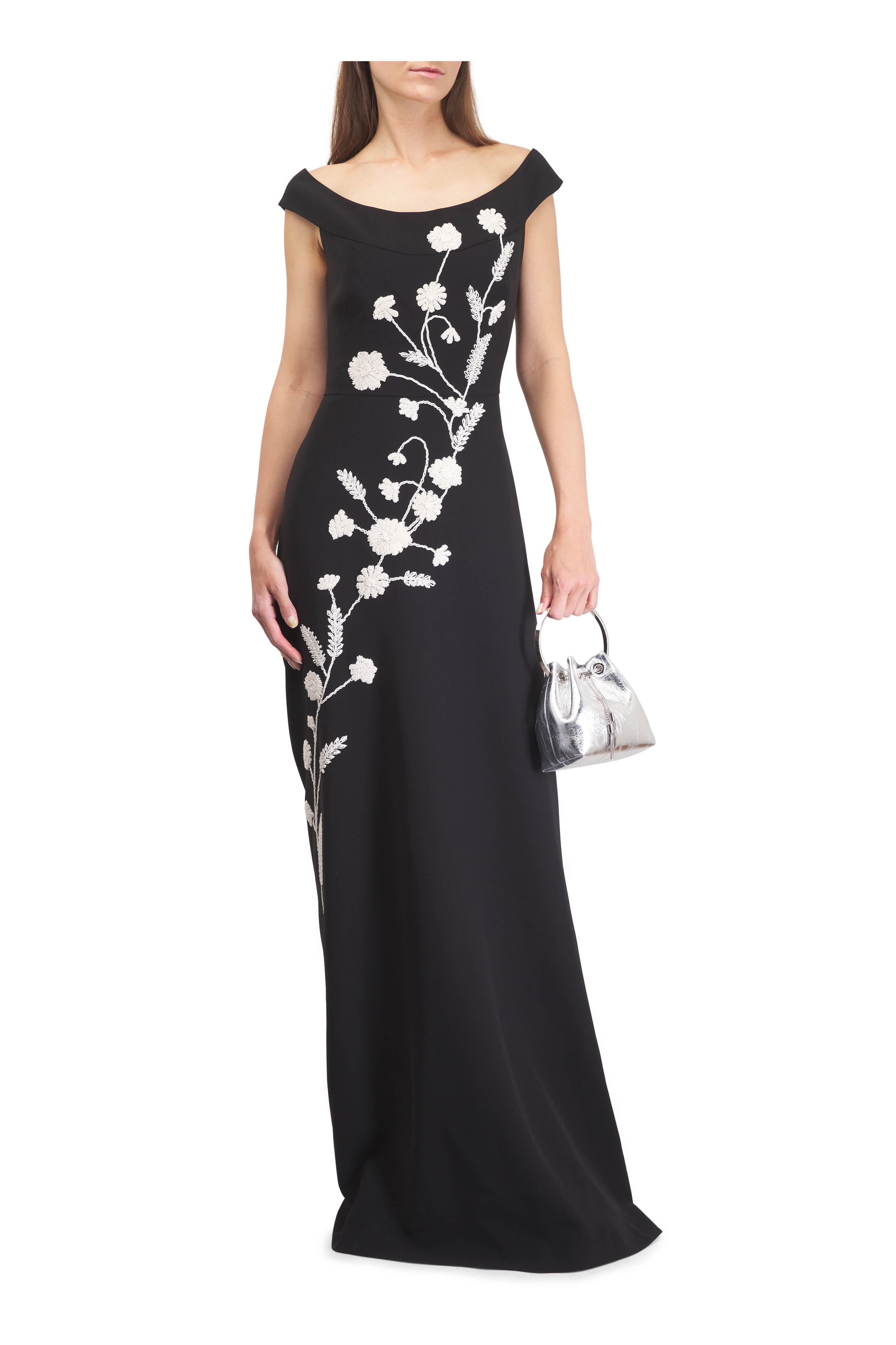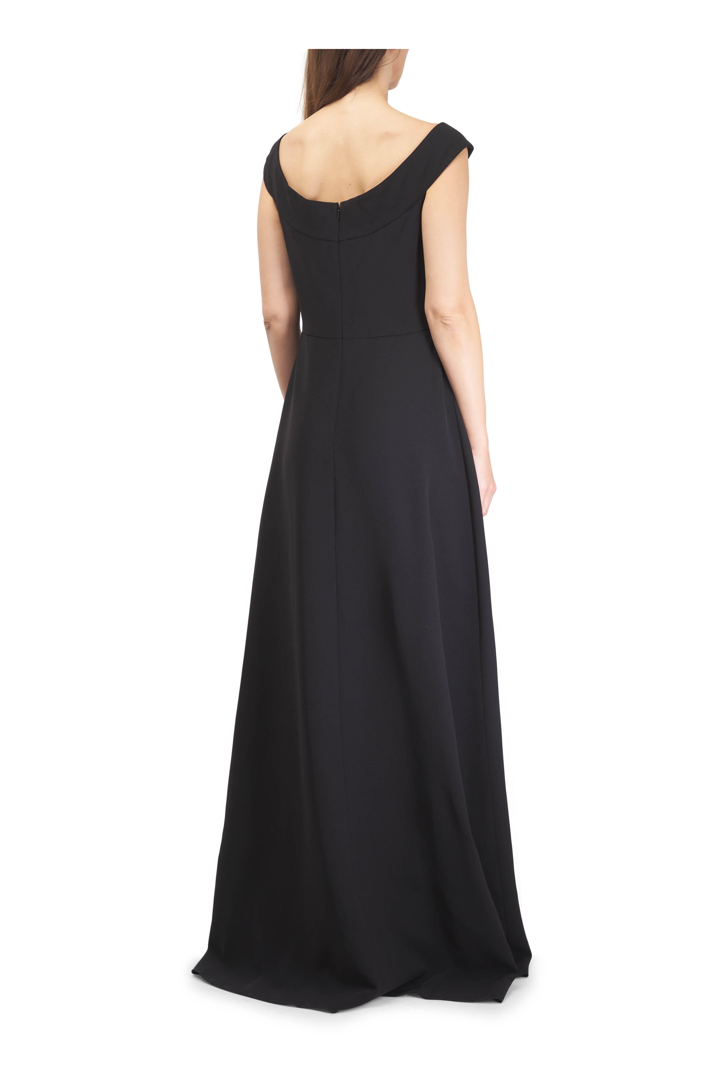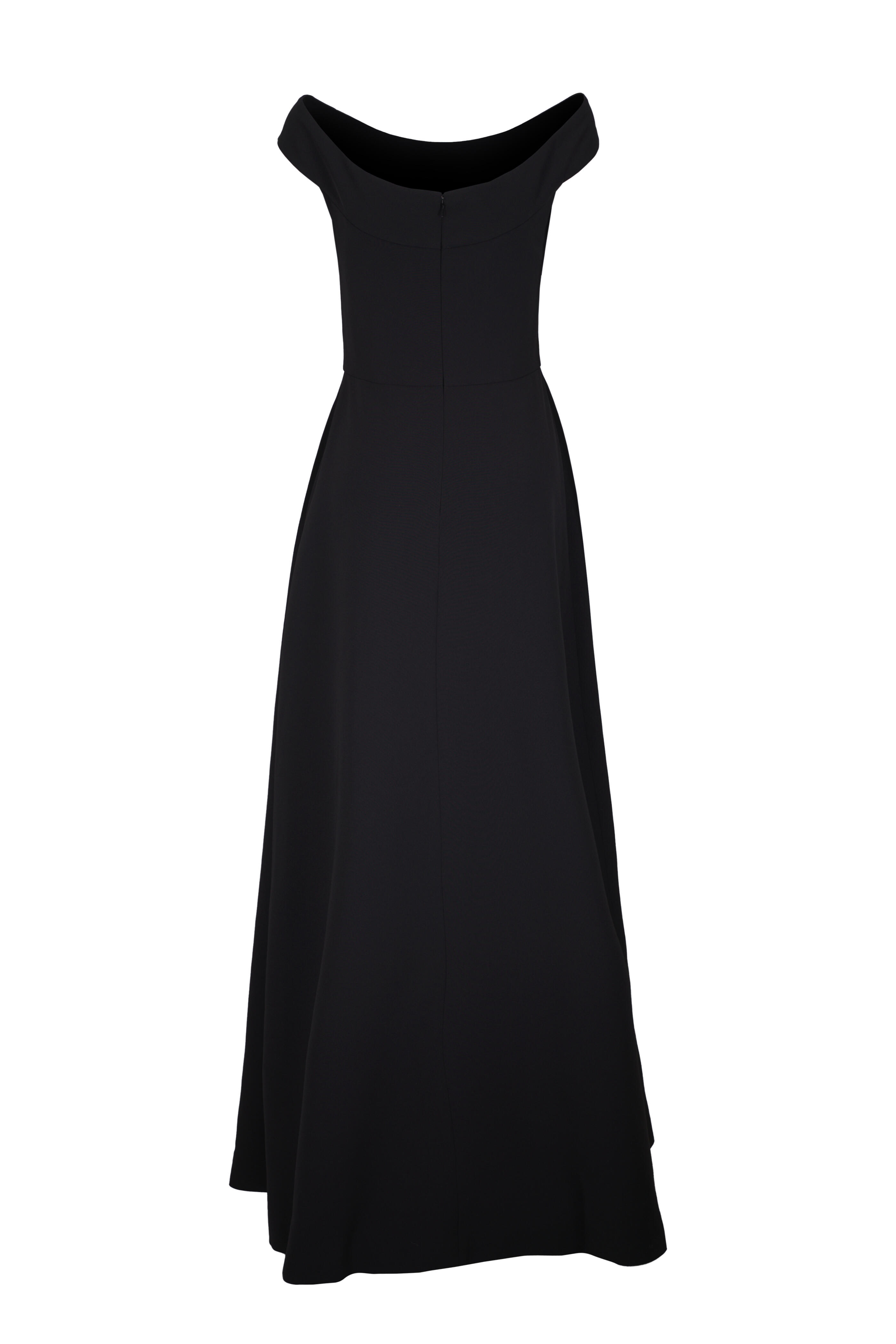 Off the shoulder neckline. Concealed back zip. Imported. 63" shoulder to hem. 94% polyester, 6% elastane; lined: 100% polyester. Dry clean.