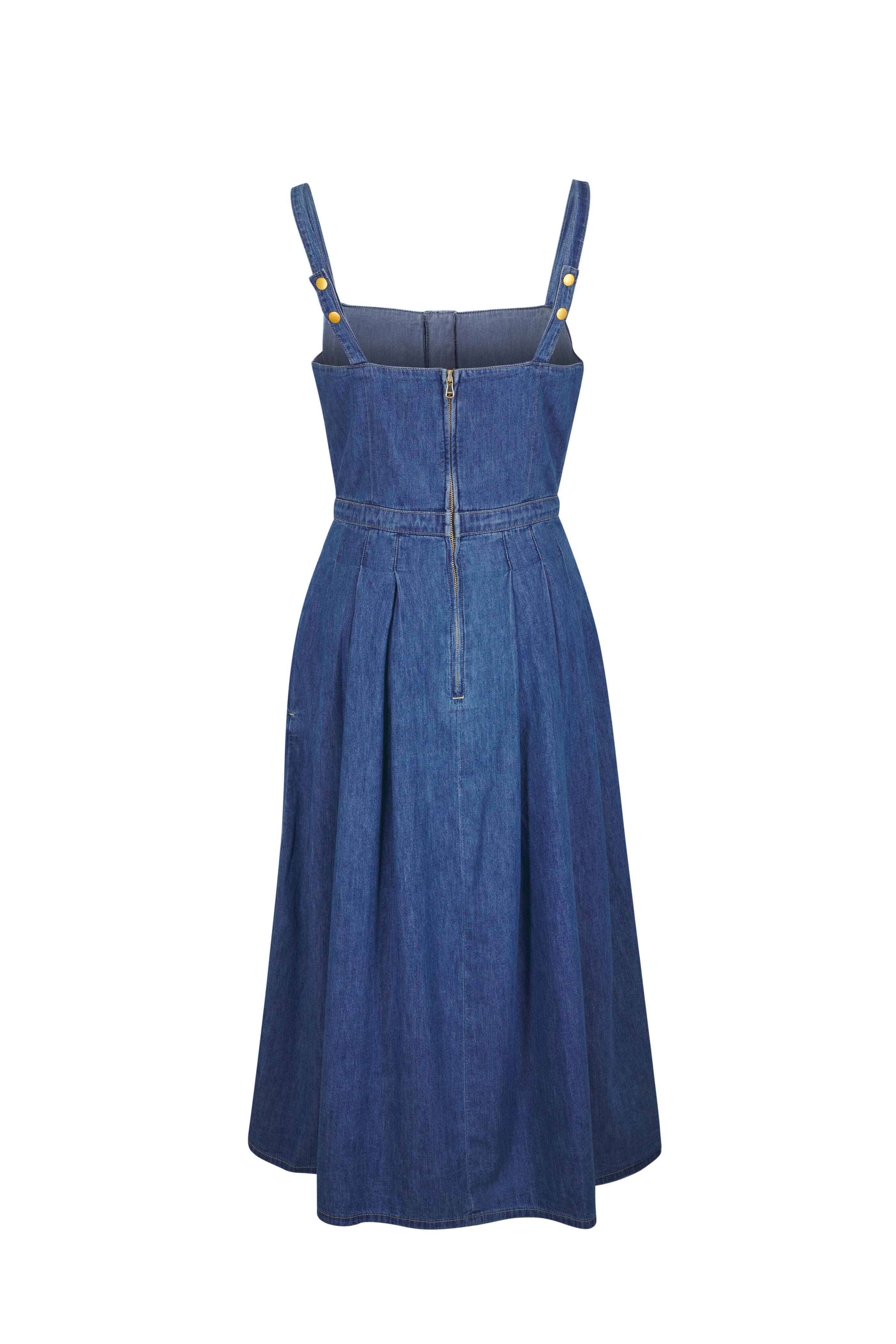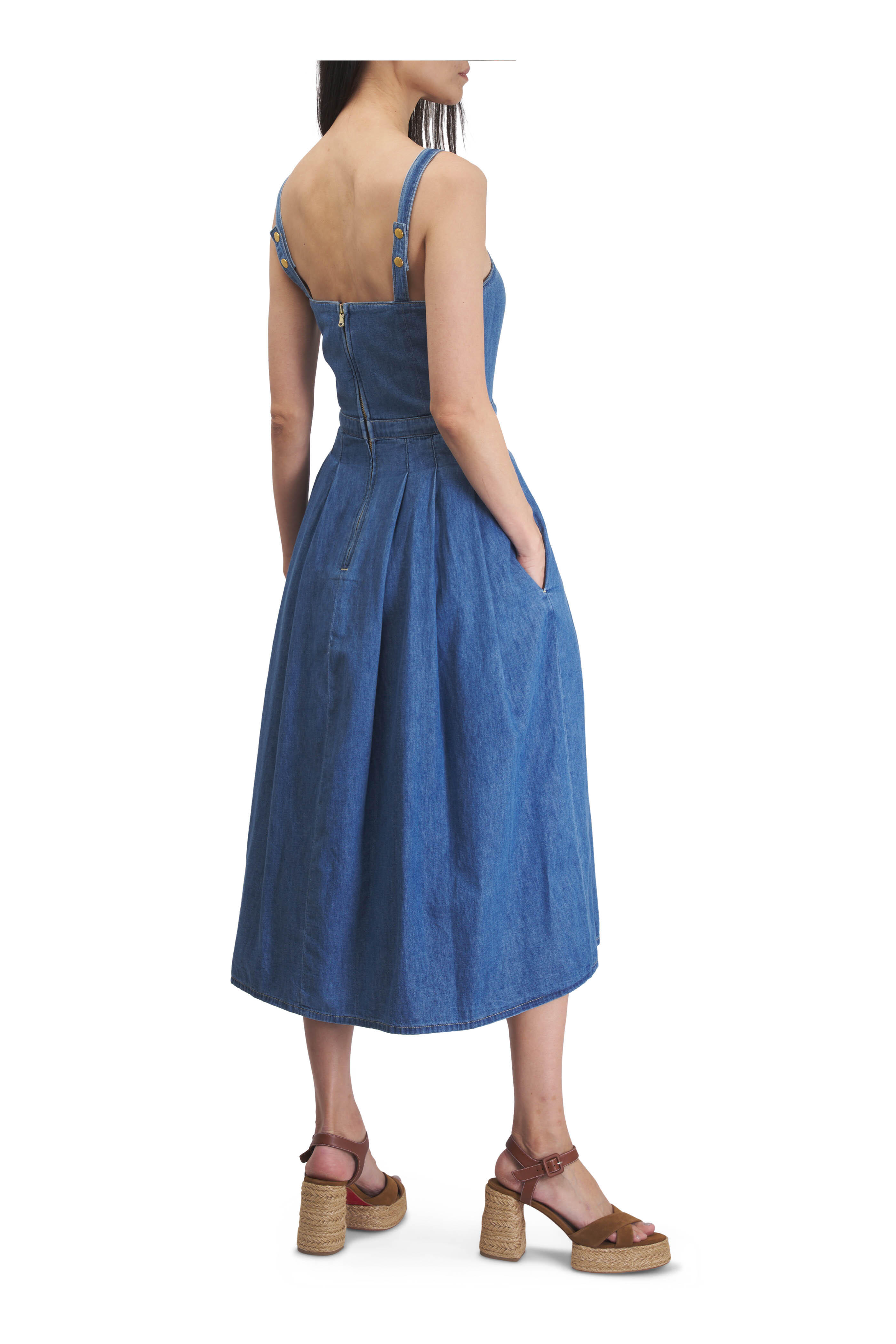 Square neckline. Back zip. Partially functional embossed dome buttons. Adjustable snap shoulder straps. Side slip pockets. Made in the USA. 100% cotton. Machine wash.