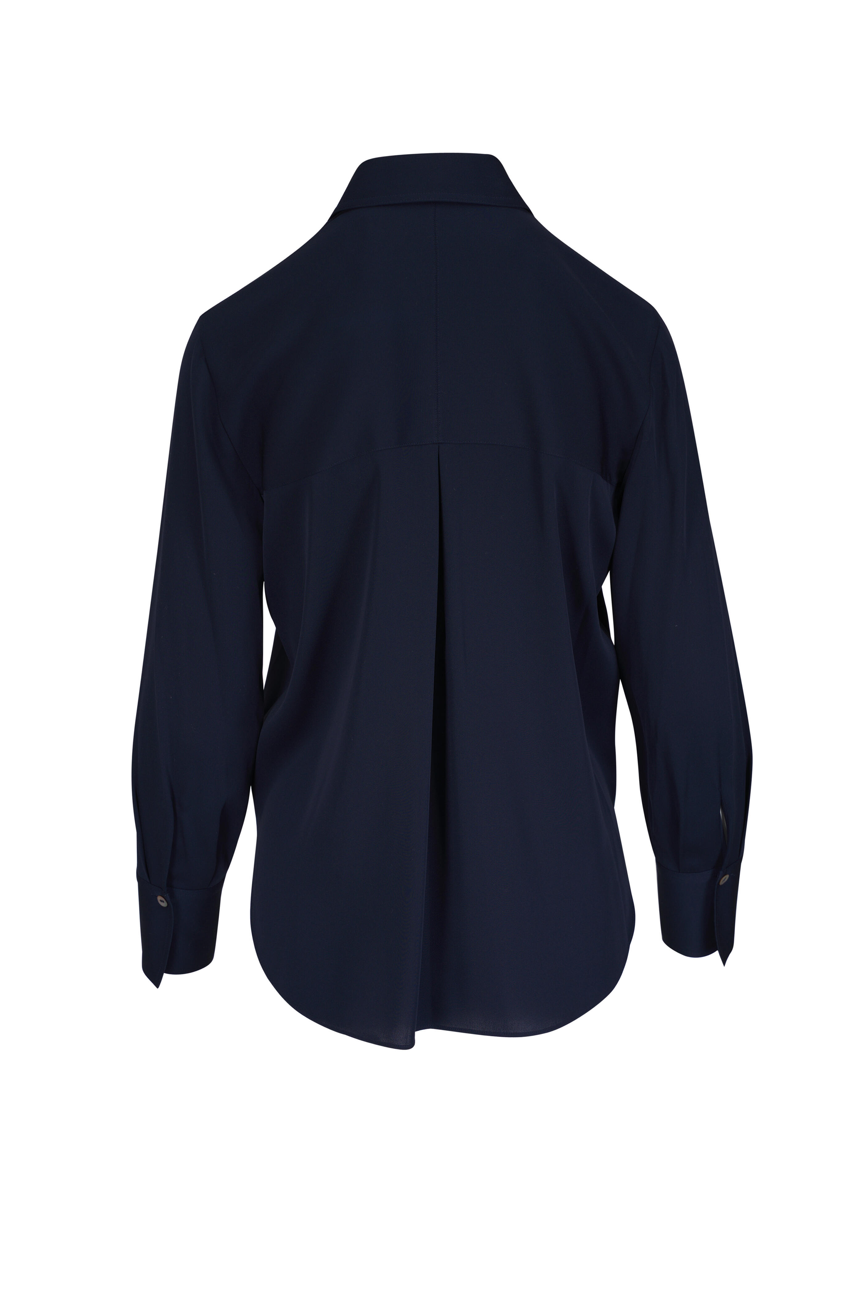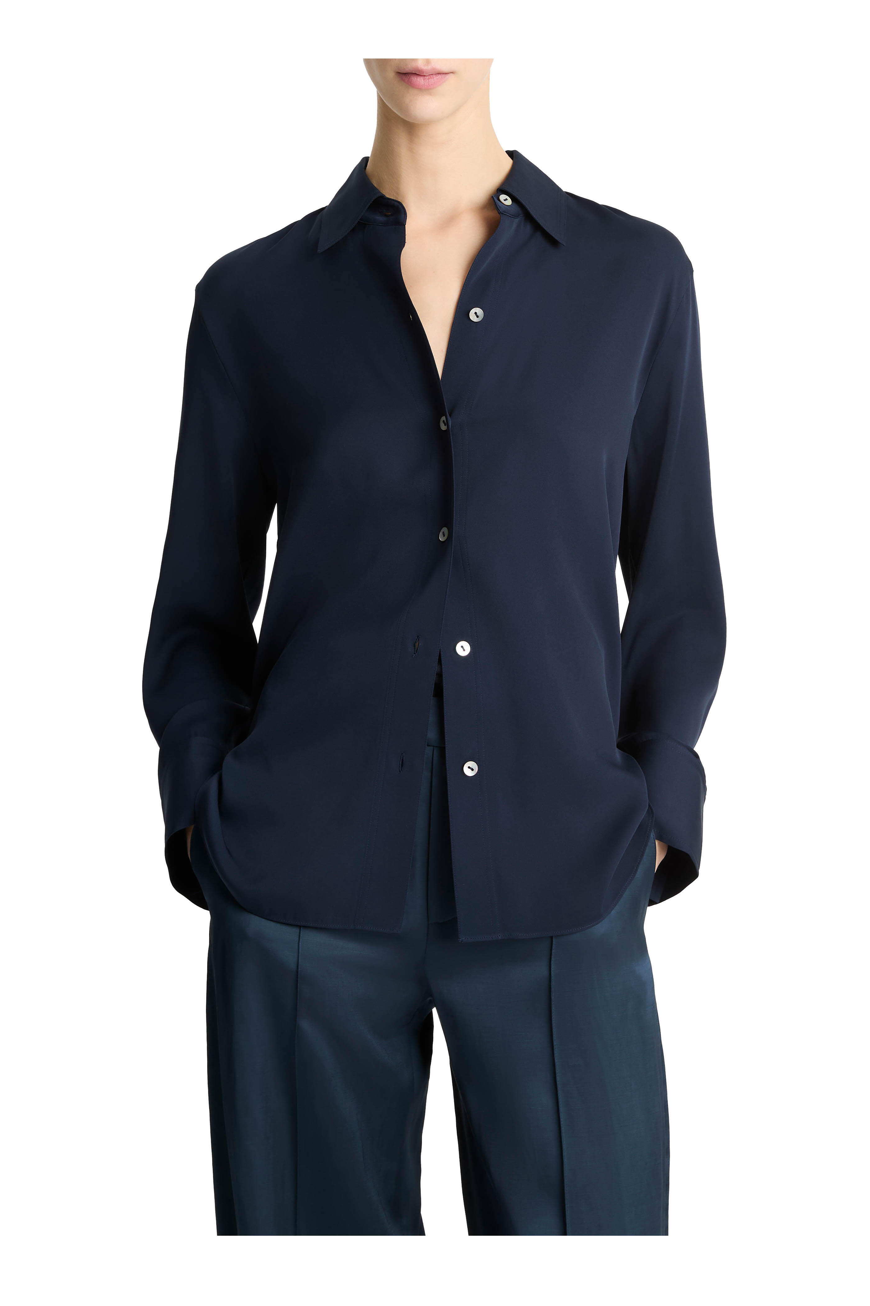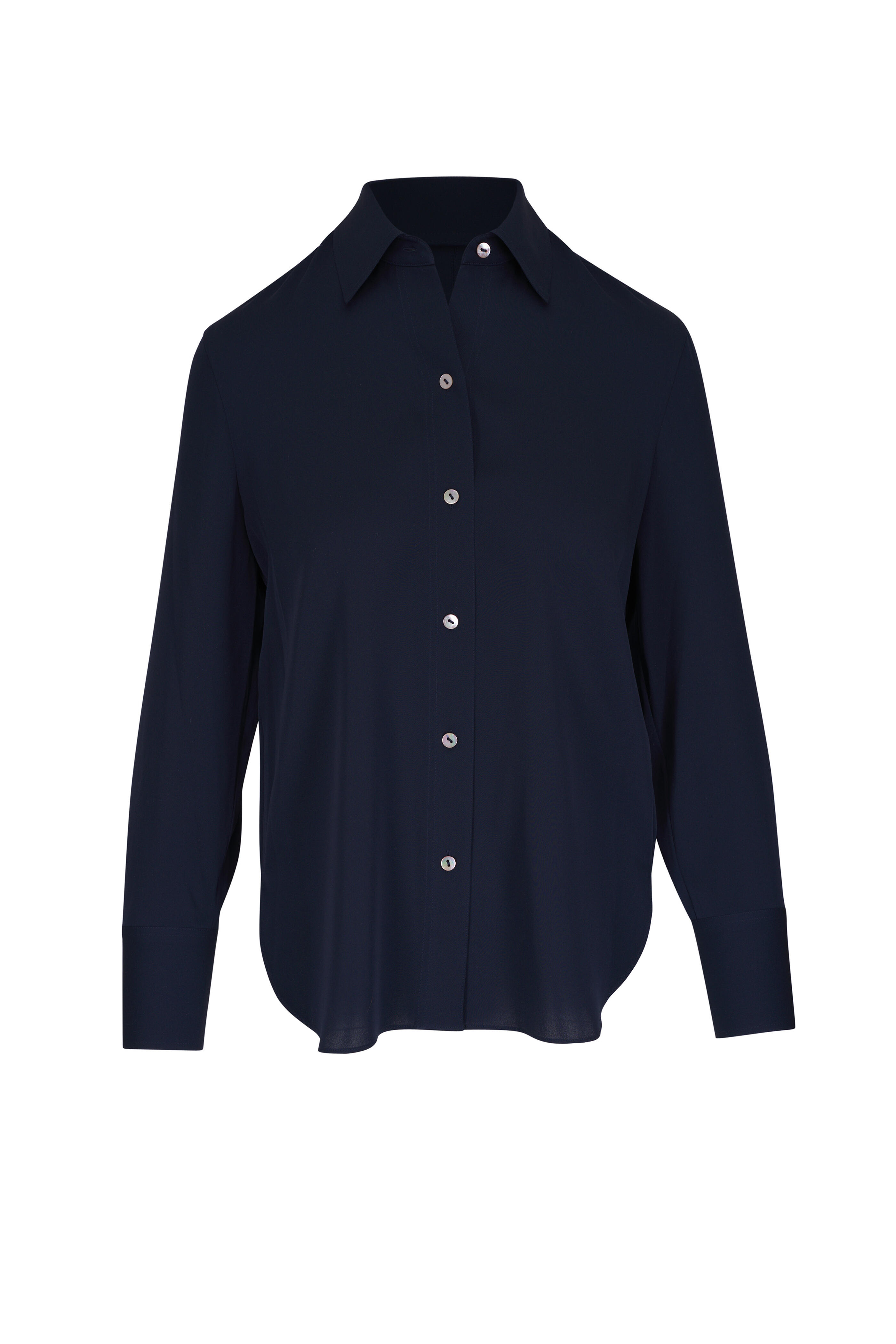 Spread collar. Front button placket. Single button cuffs. Inverted back box pleat. Shirttail hem. Imported. Approximately 27 ½" shoulder to hem. 92% silk, 8% spandex. Hand wash.