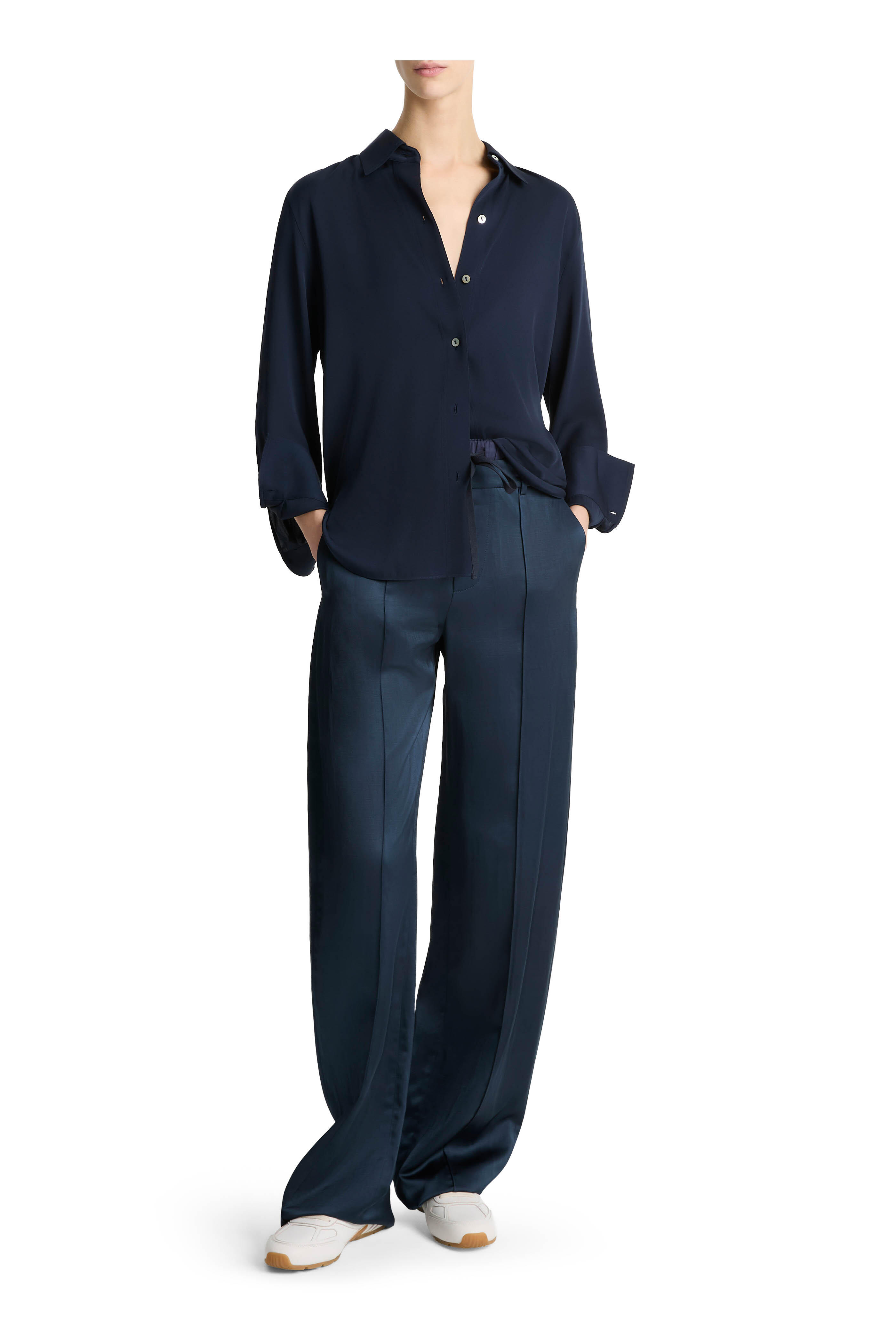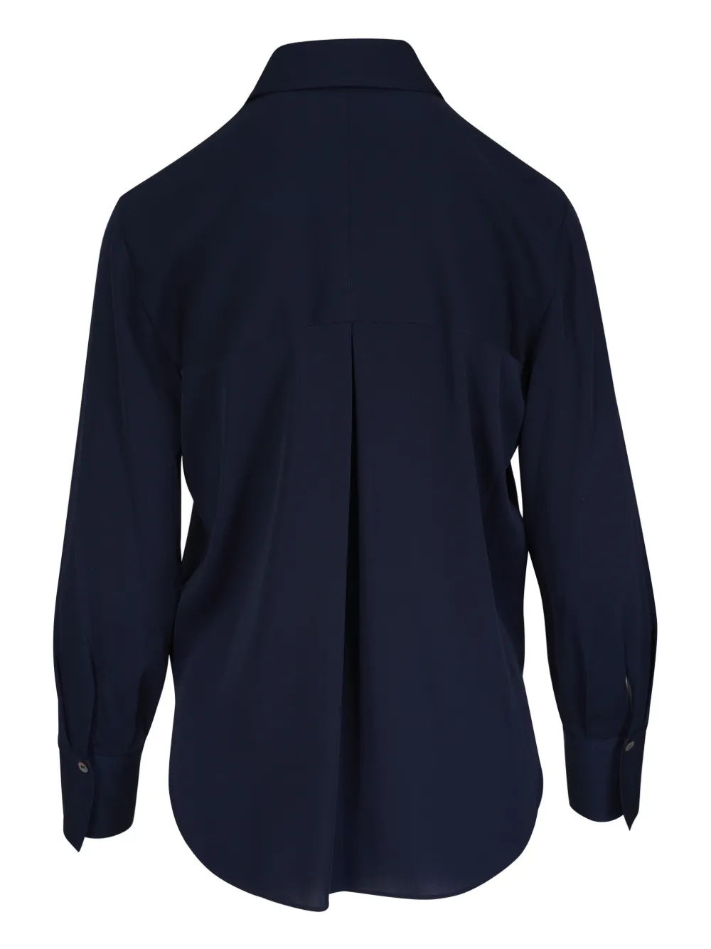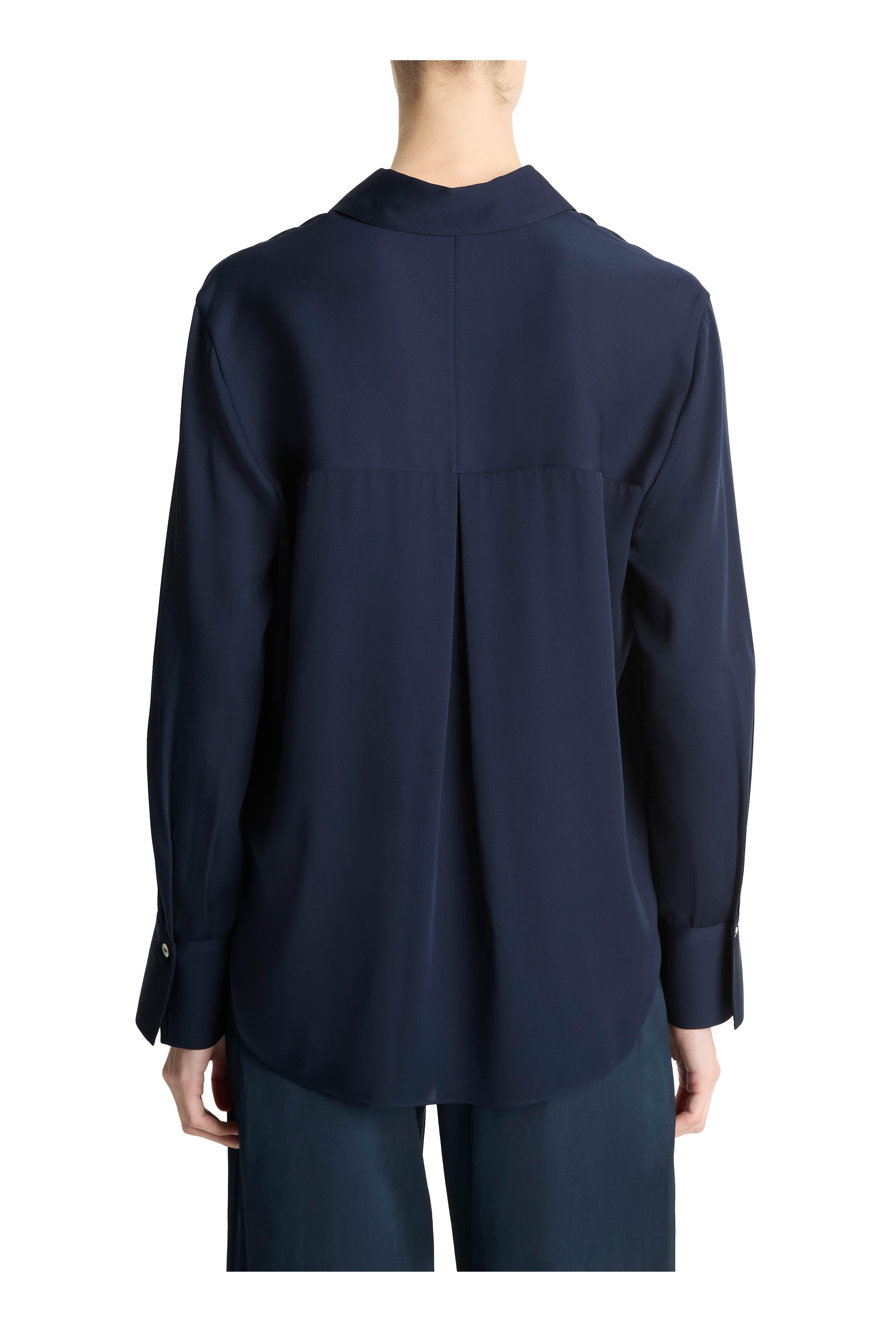 Spread collar. Front button placket. Single button cuffs. Inverted back box pleat. Shirttail hem. Imported. Approximately 27 ½" shoulder to hem. 92% silk, 8% spandex. Hand wash.