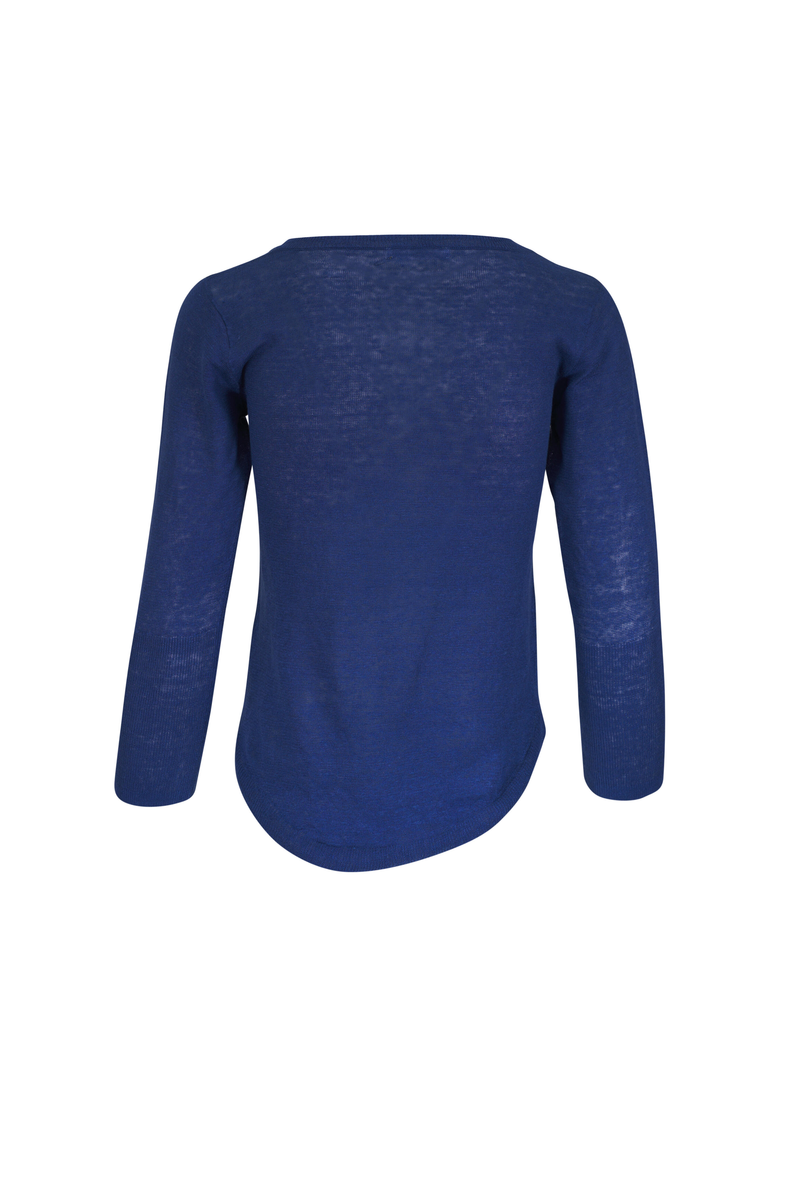 V-neckline. Three quarter length sleeves. Ribbed trims. Imported. 100% linen. Hand wash.