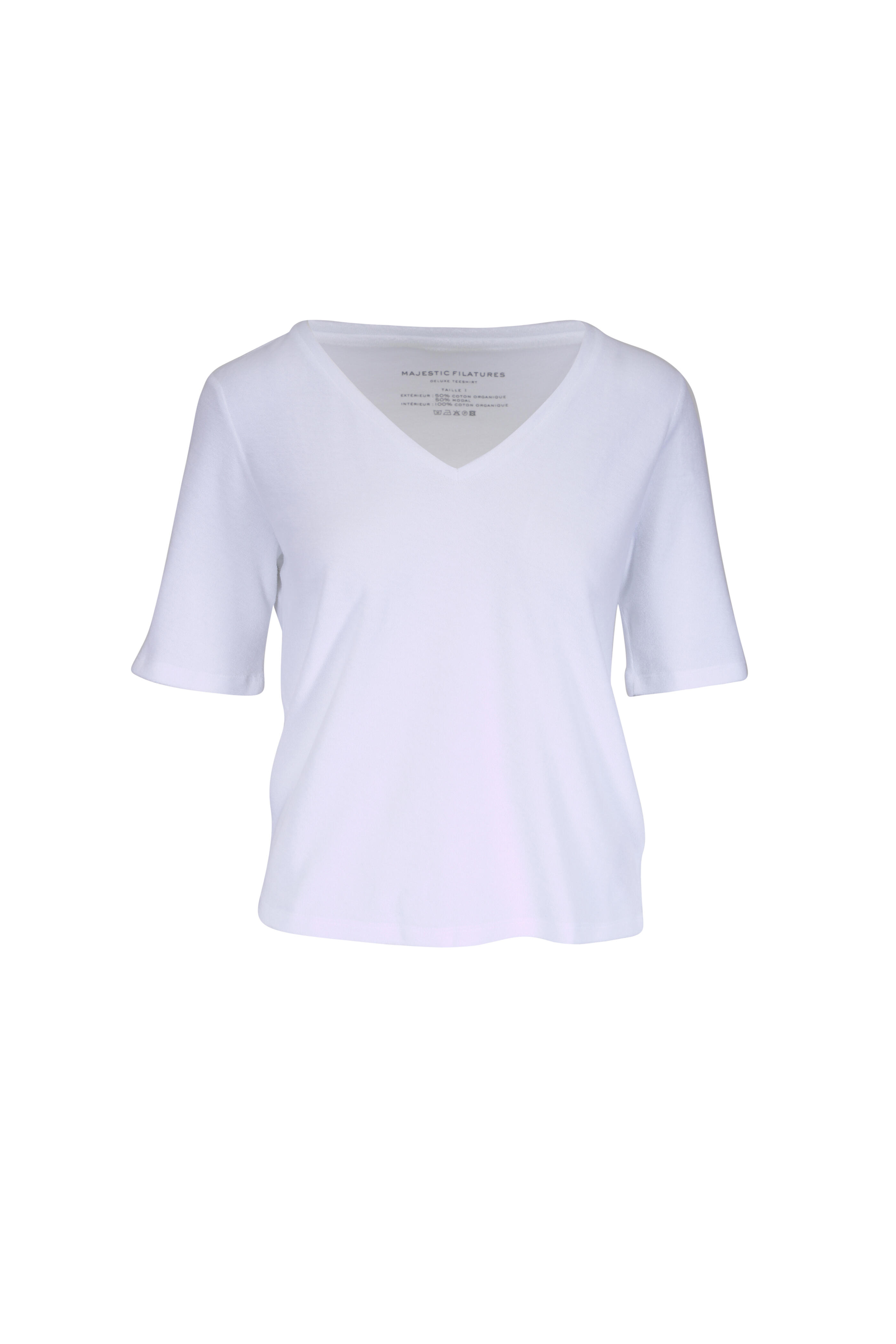V-neckline. Ribbed trims. Straight hem. imported. Shoulder to hem 24" (size xs). 50% organic cotton, 50% modal. Machine wash.