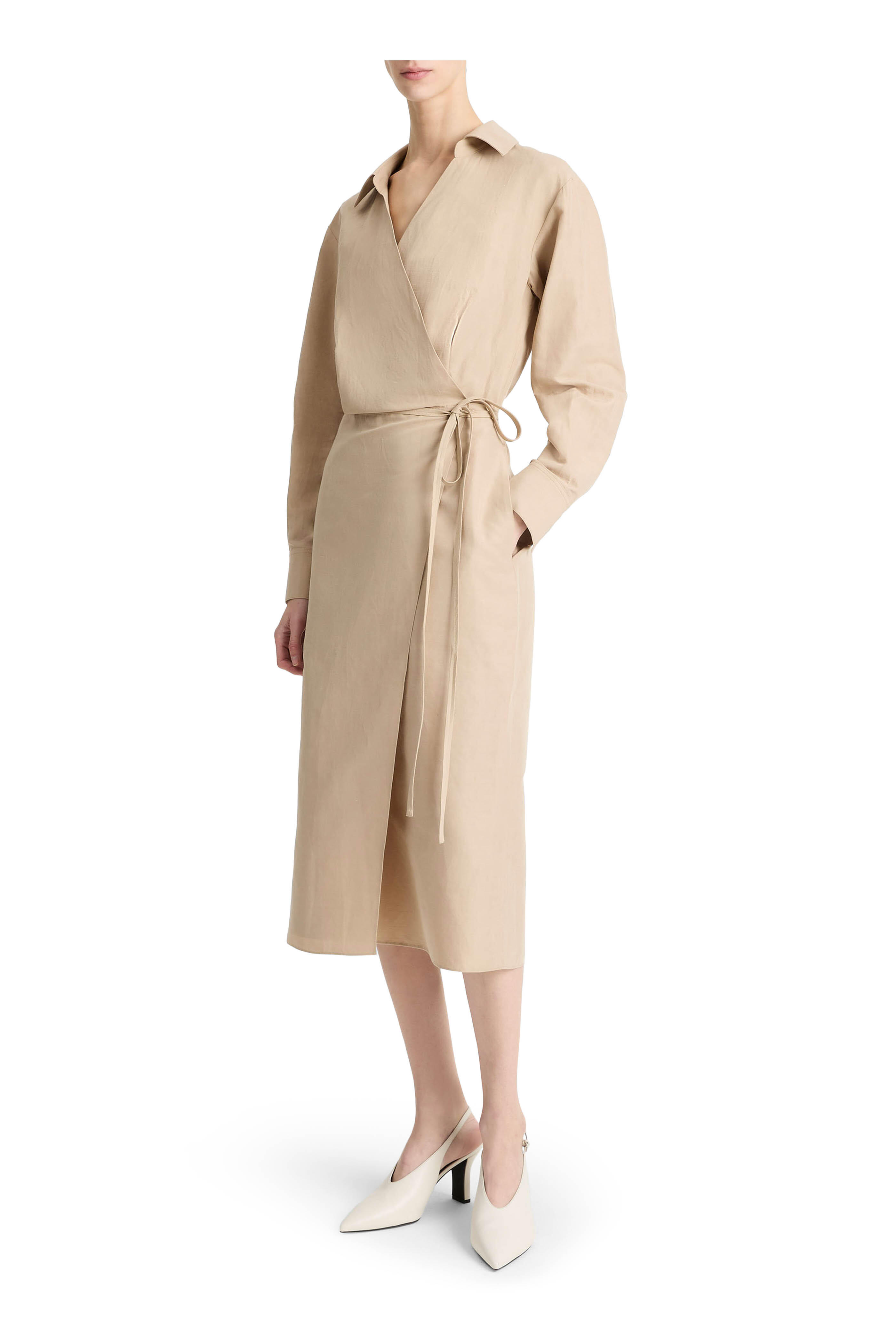 Spread collar. V-neckline. Gathered waist, self tie. Single button square cuffs. Imported. 46" shoulder to hem. 47% cotton, 29% linen, 25% rayon. Machine wash.