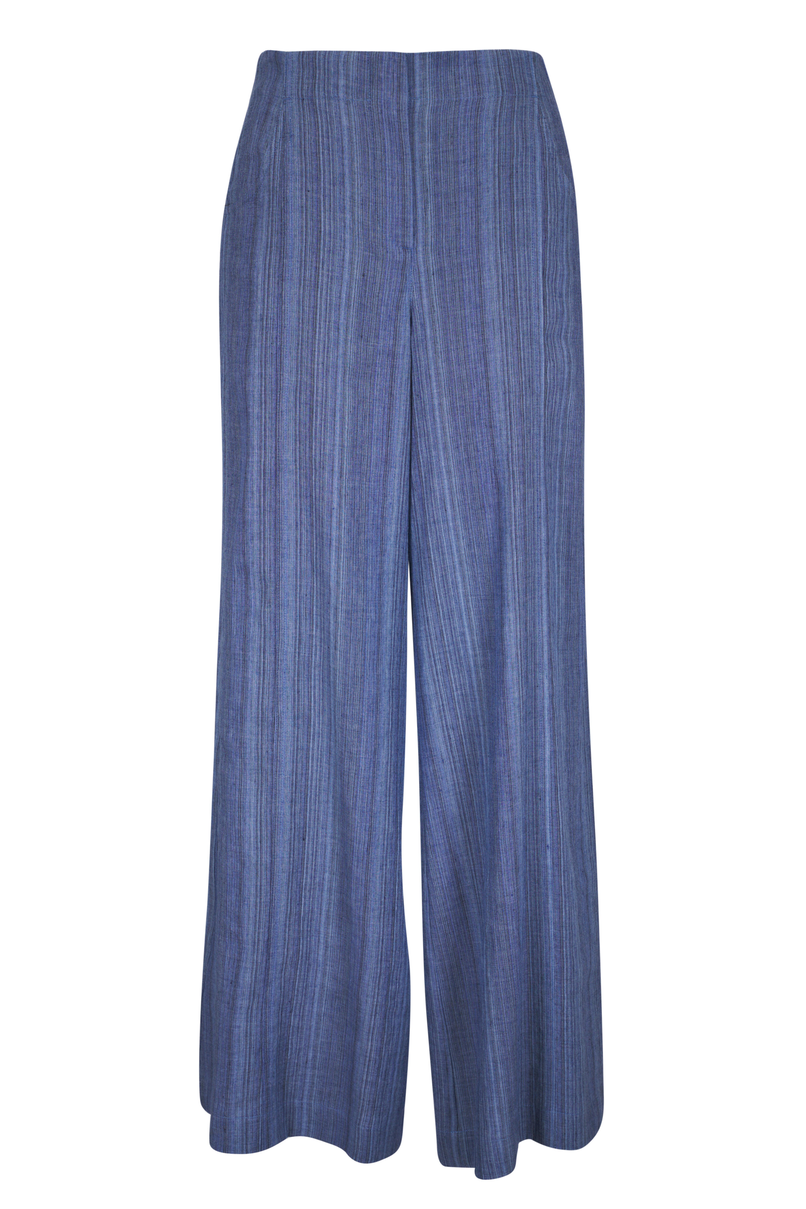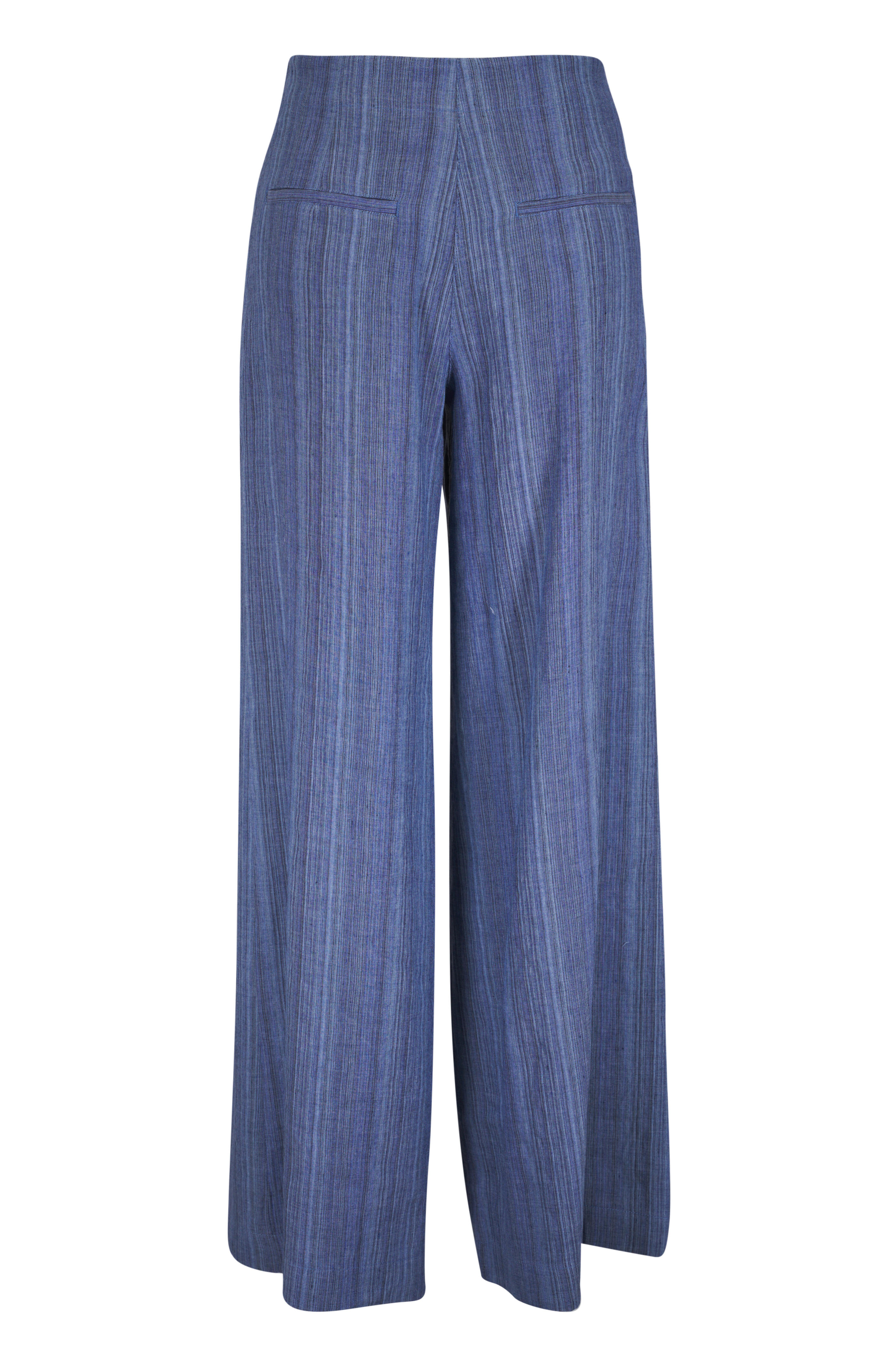 Zip fly with hook-and-eye closure. Side pockets; back welt pockets. Made in the USA. 82% linen, 18% cotton. Dry clean.