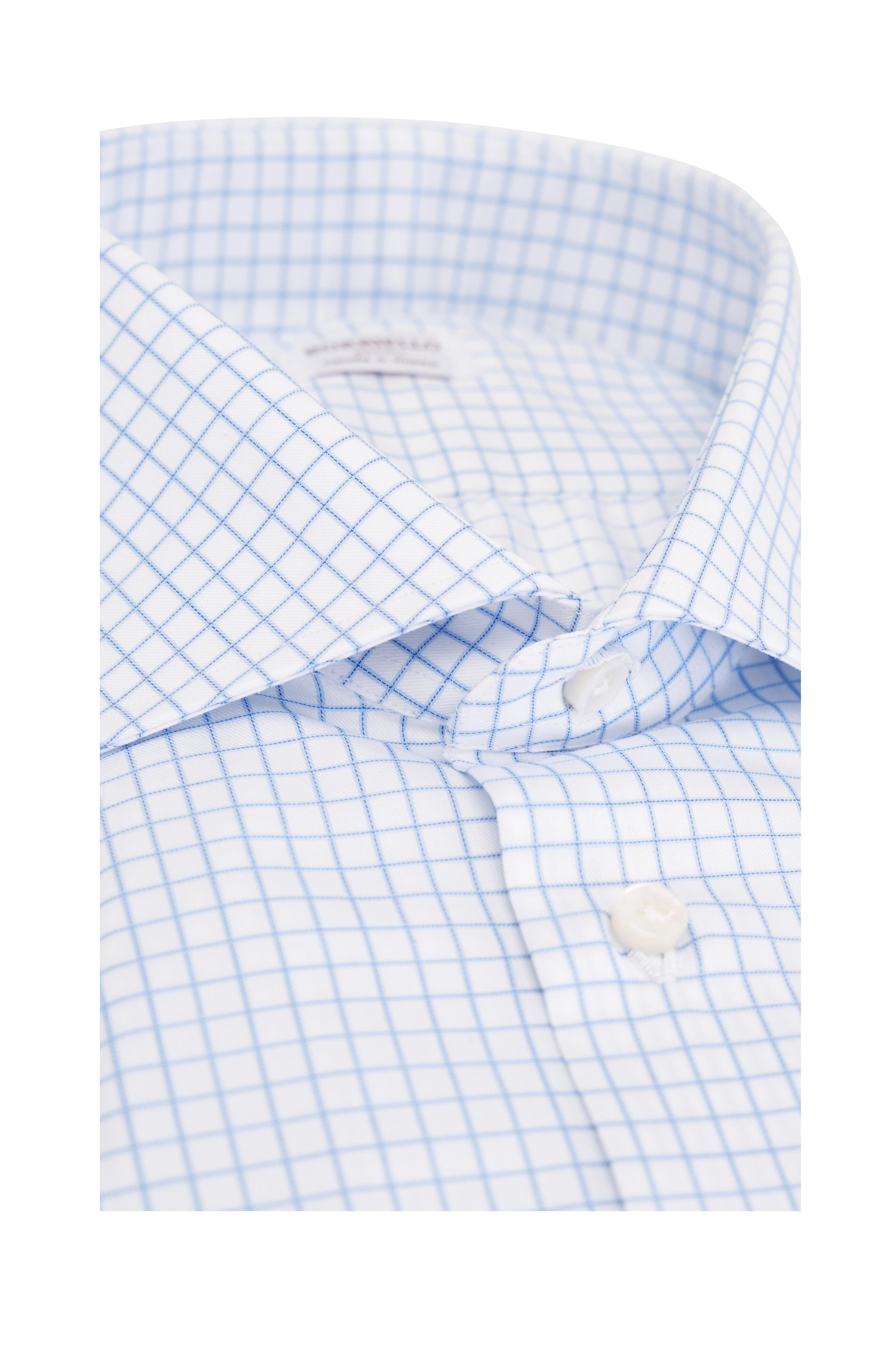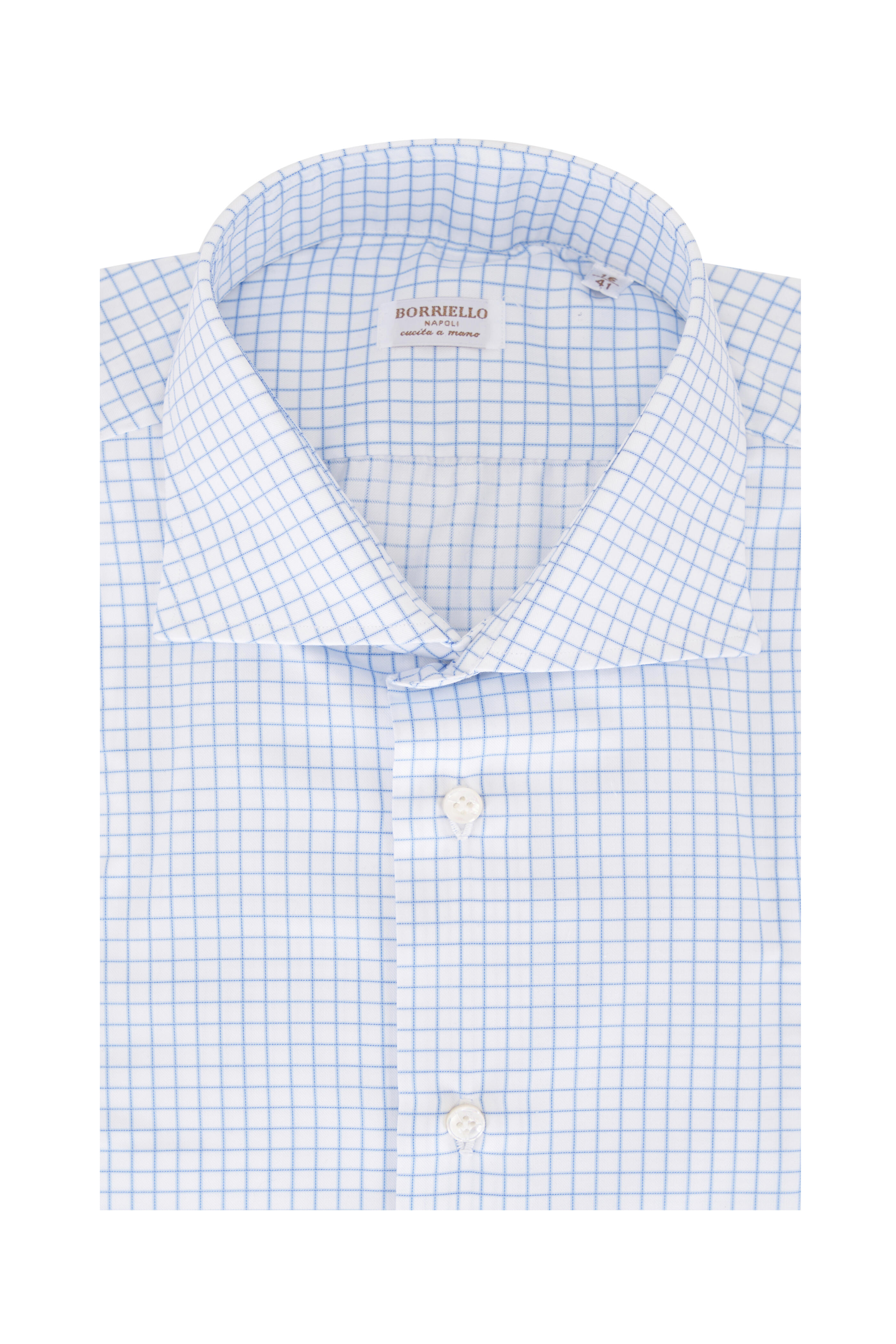 Spread collar. French placket. Single button barrel cuffs. Made in Italy. 100% cotton. Machine wash.
