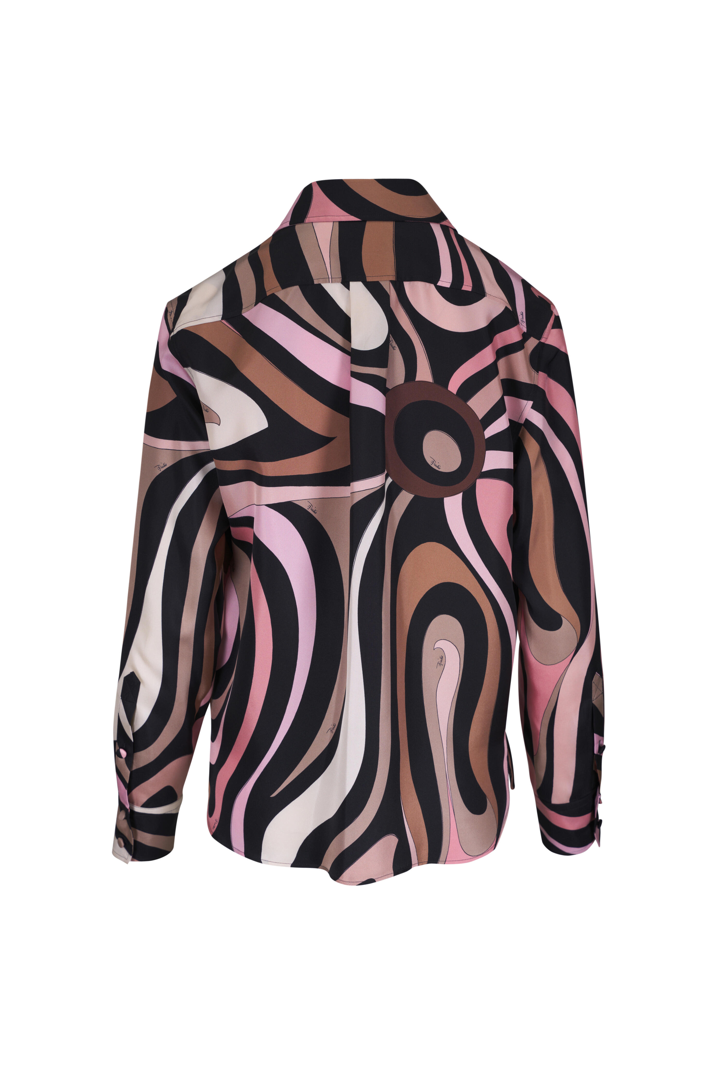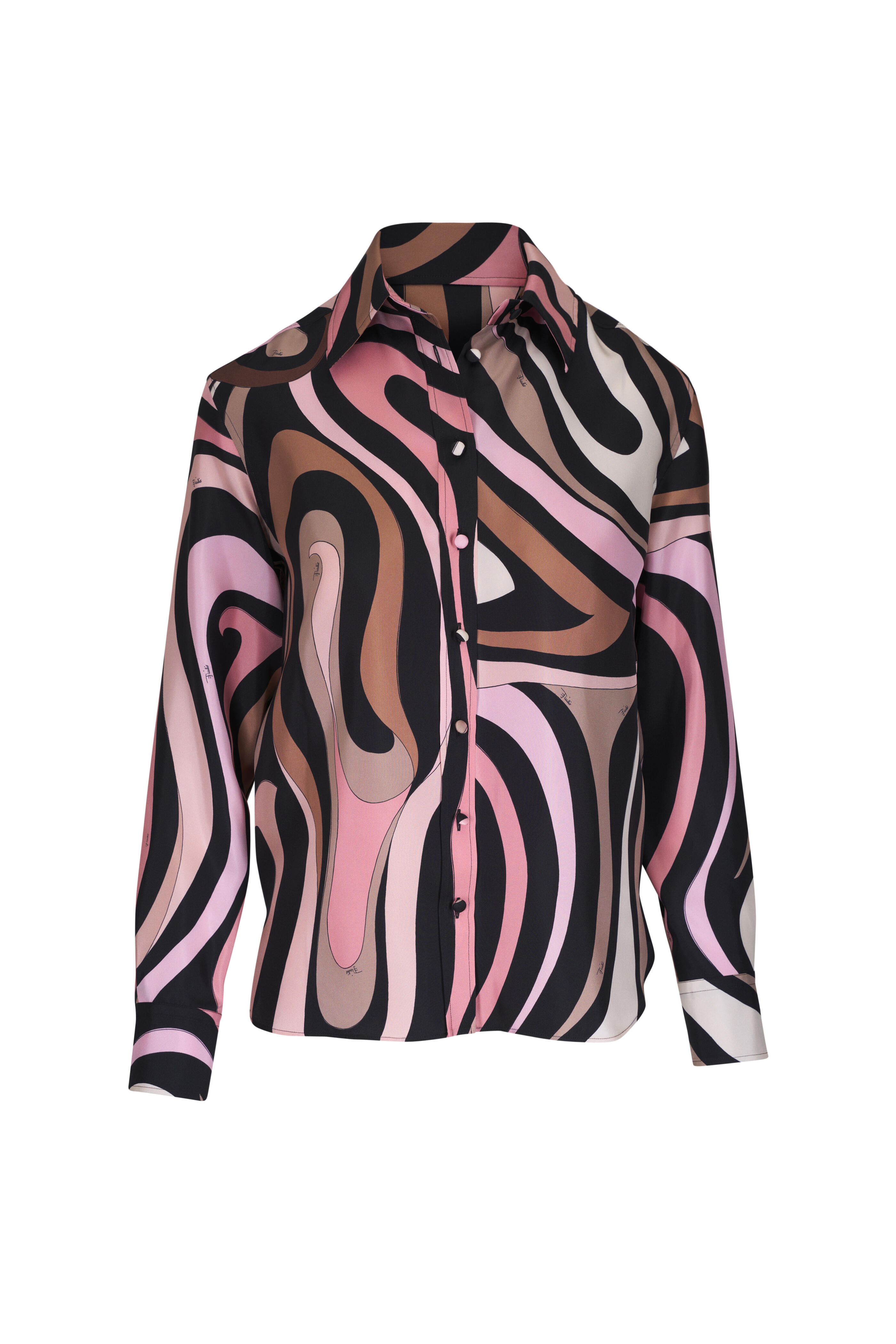 Spread collar. Front button placket. Button cuffs. Made in Italy. 100% silk. Dry clean.
