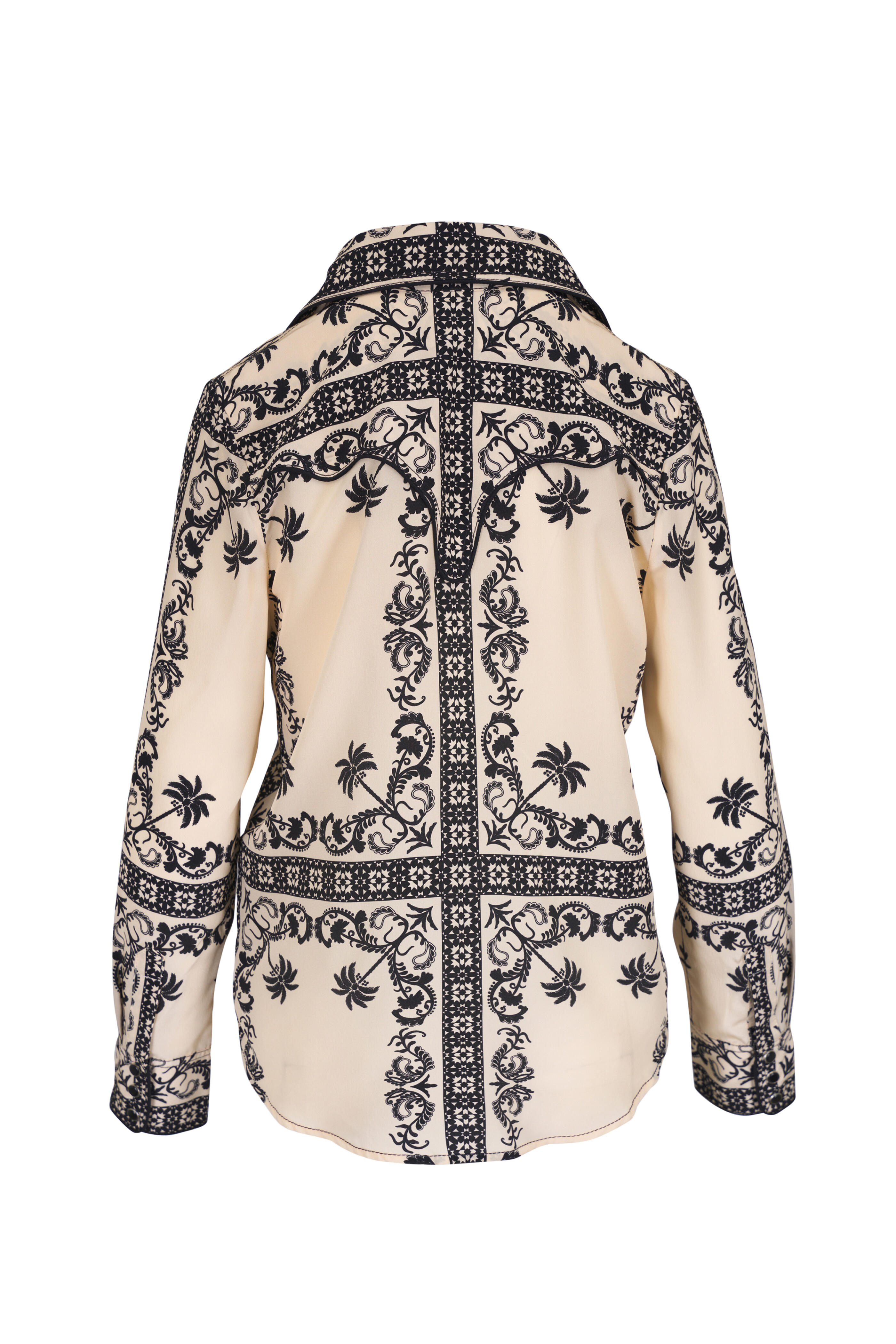 Spread collar. V-neckline. Front button placket. Three button square cuffs. Shirttail hem. Imported. 100% silk. Dry clean.