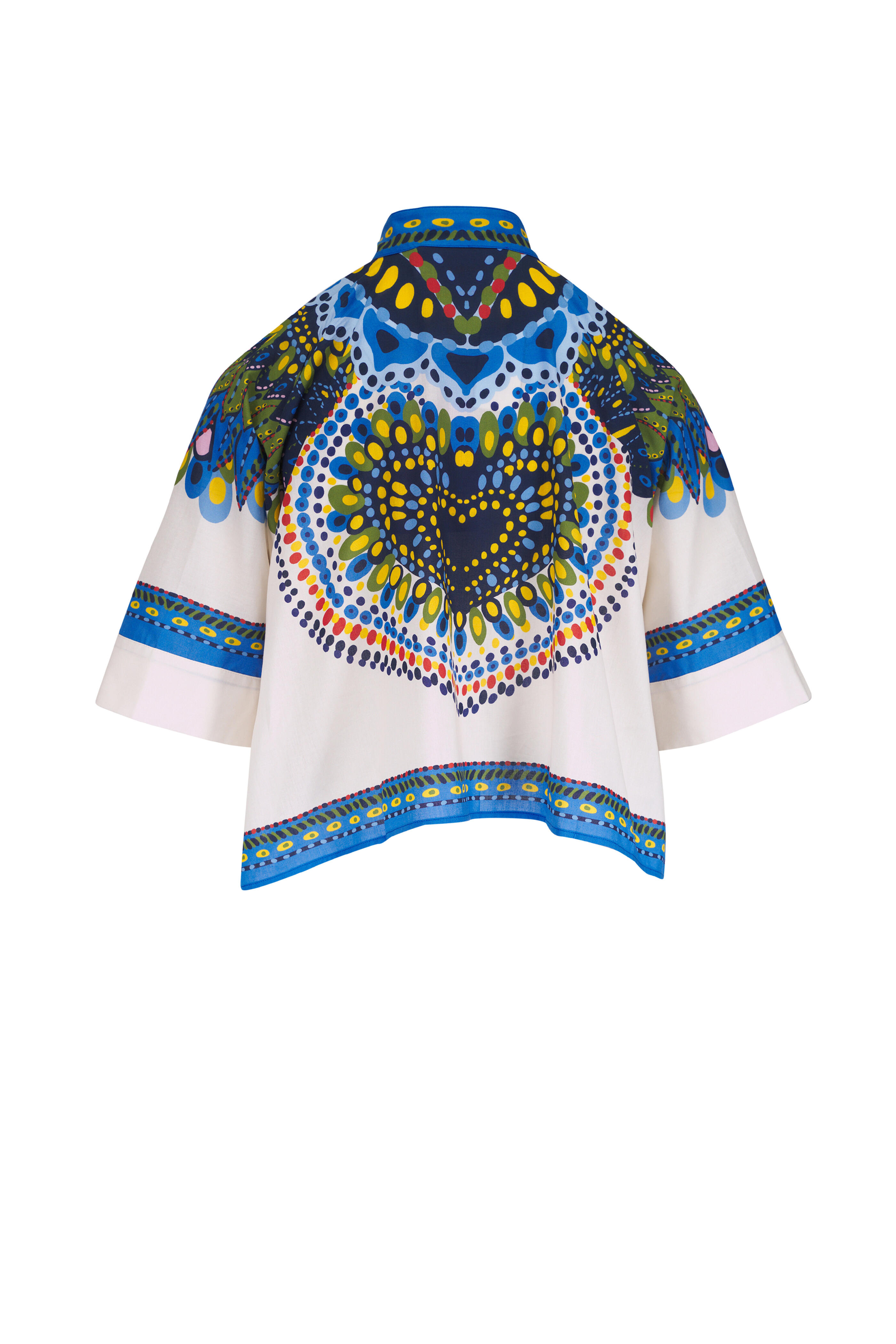 Band collar. Front button placket. Relaxed, cropped sleeves. Made in Italy. 100% cotton. Dry clean.