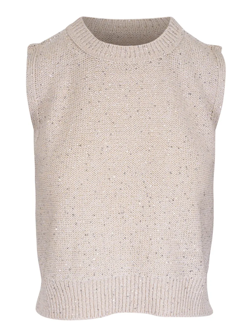 Round neckline. Ribbed trims. All over mini paillette detailing. Imported. 56% linen, 28% polyester, 16% cotton. Dry clean.