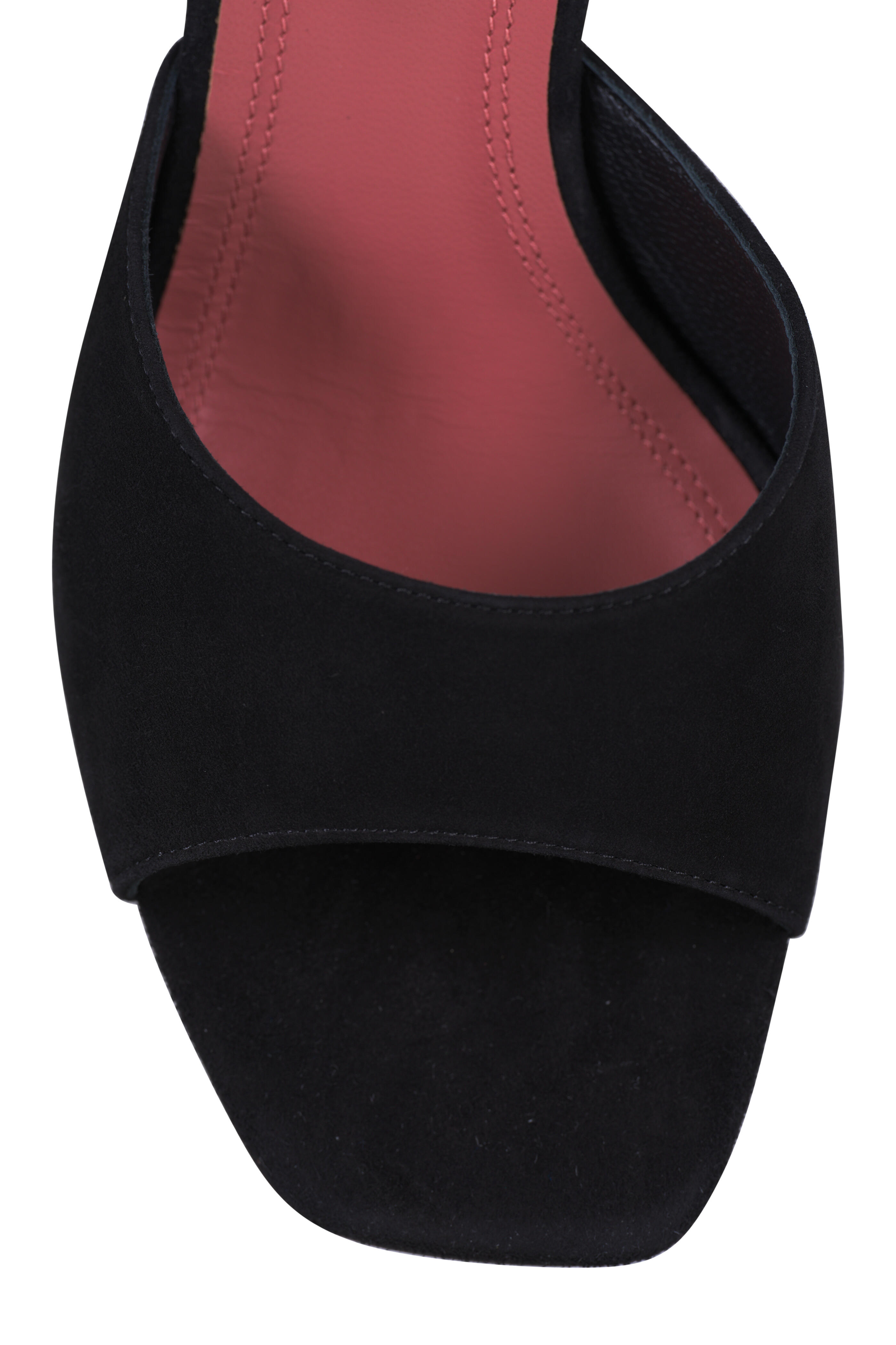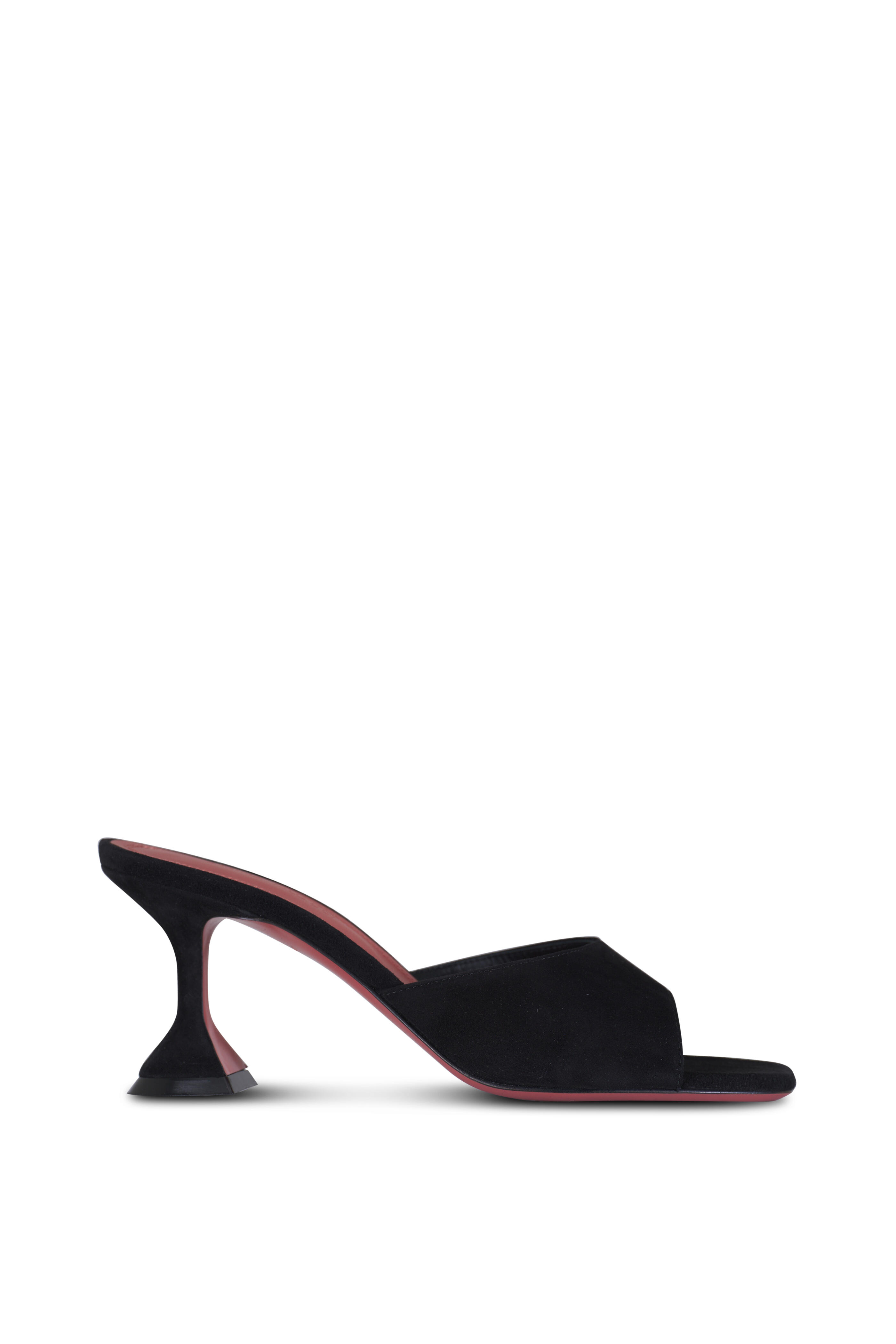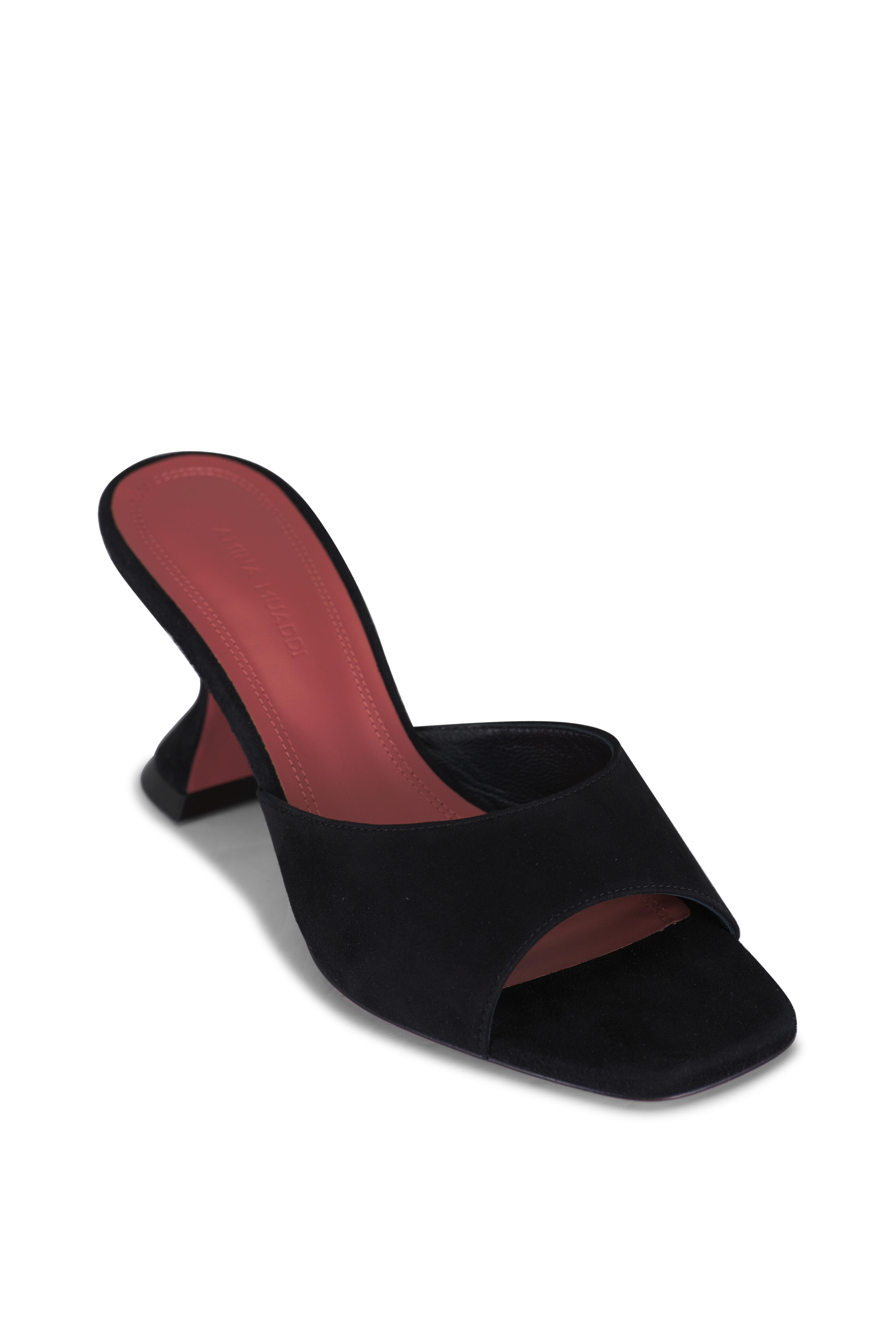 Suede upper. Square open toe. Slip on style. Leather lining and insole. Leather and rubber sole. Signature martini glass heel. Made in Italy. Heel height: 70mm.