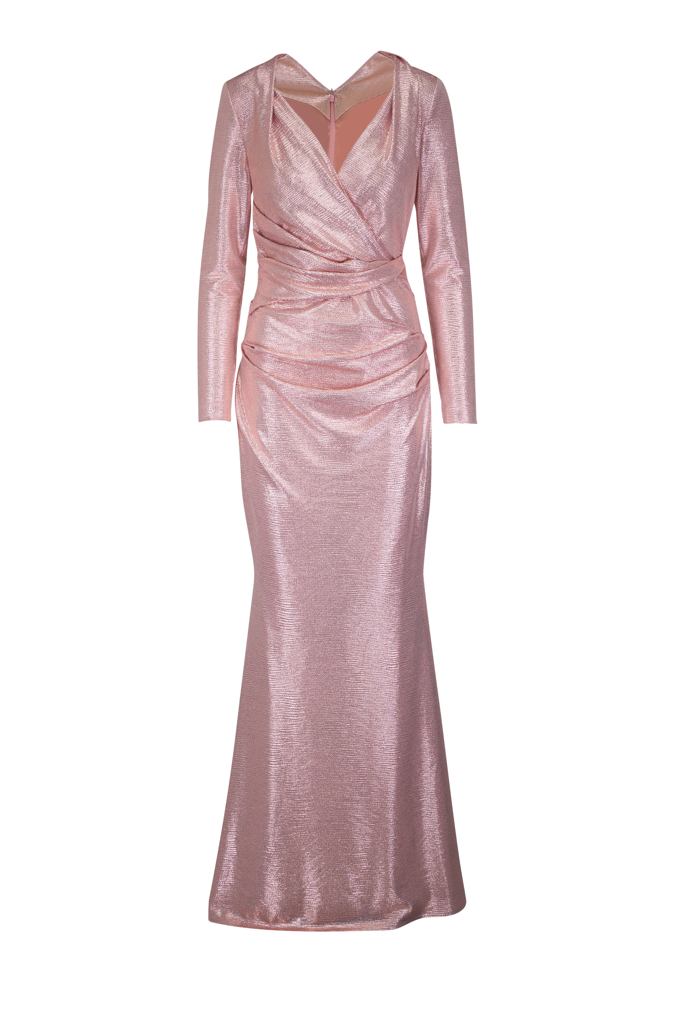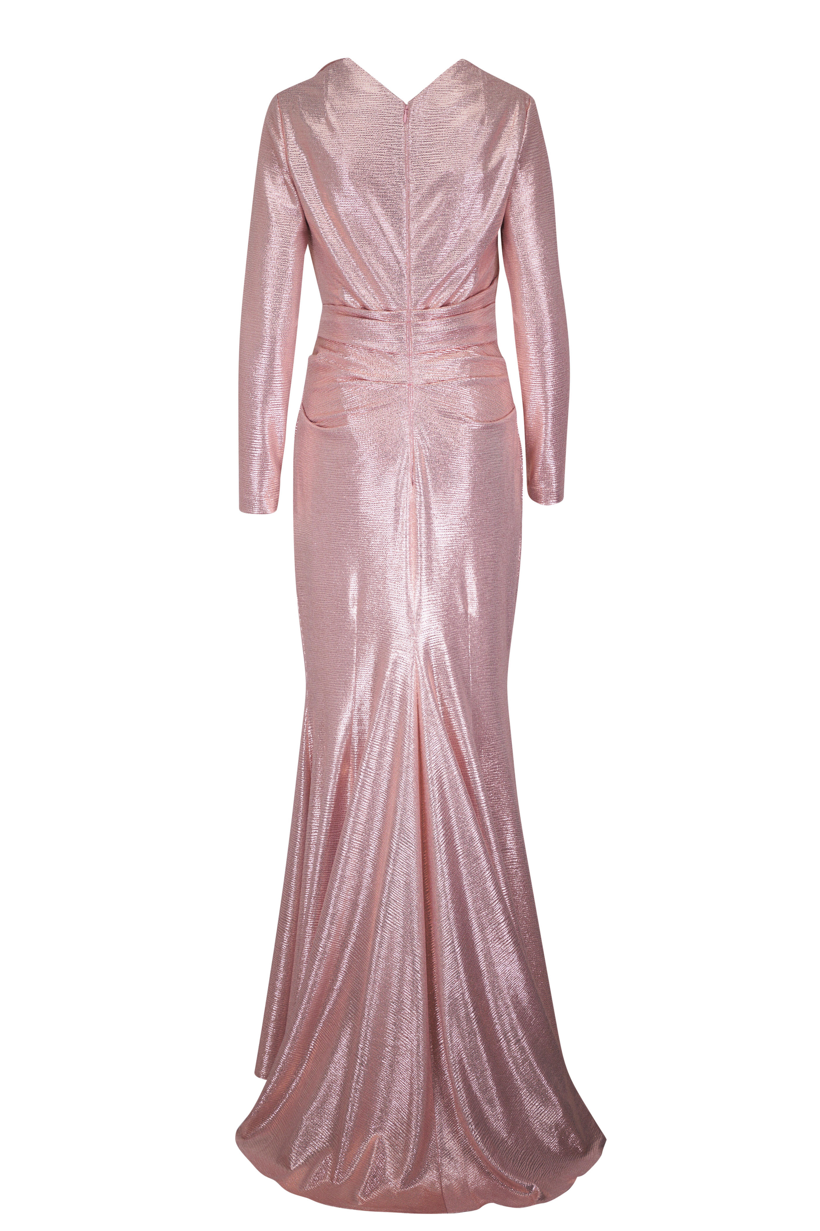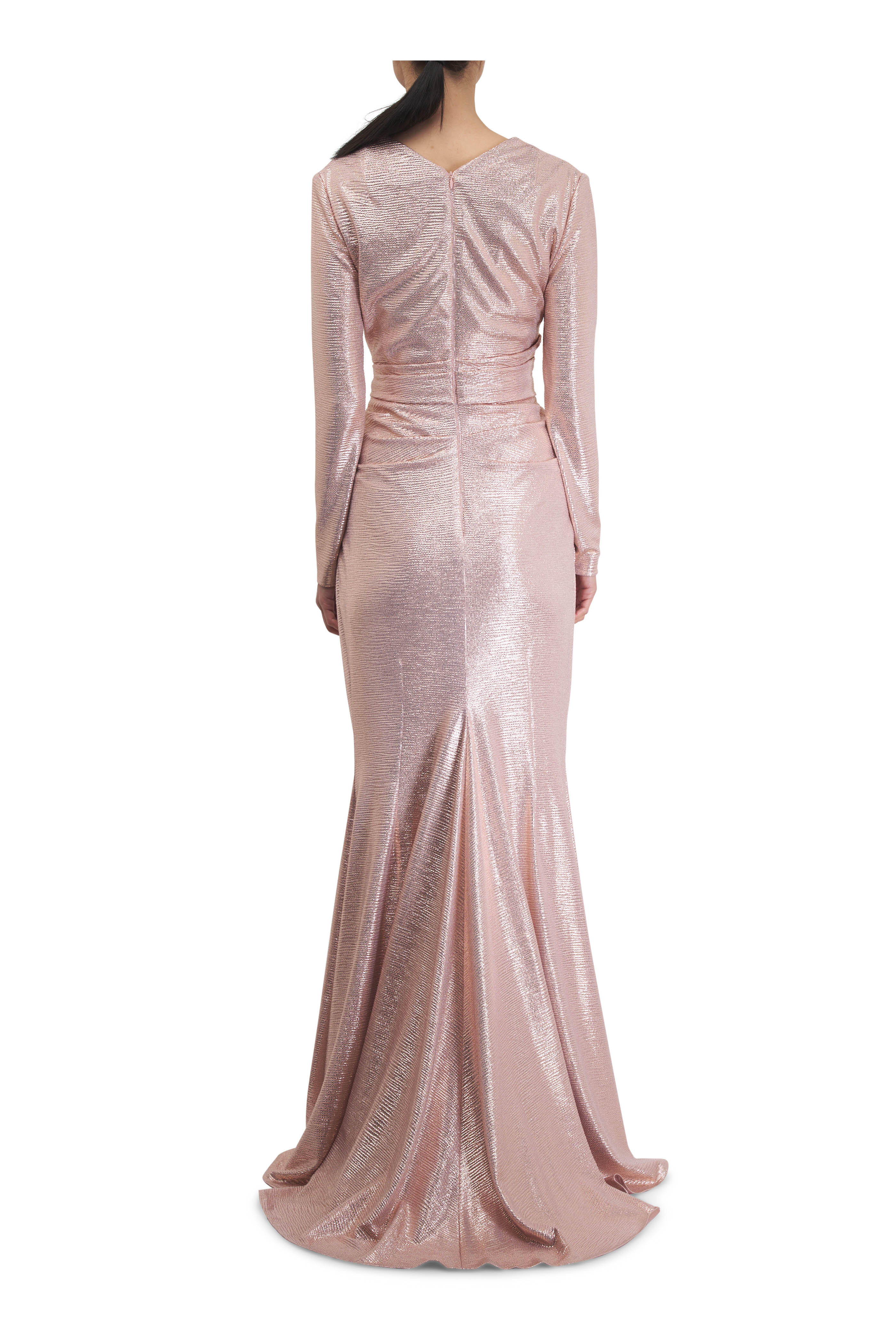 V-neckline. Concealed back zip. Ruched bodice. Train hem. Imported. Shoulder to hem 69" (size 8). 95% polyester, 5% elastane; fully lined. Dry clean.