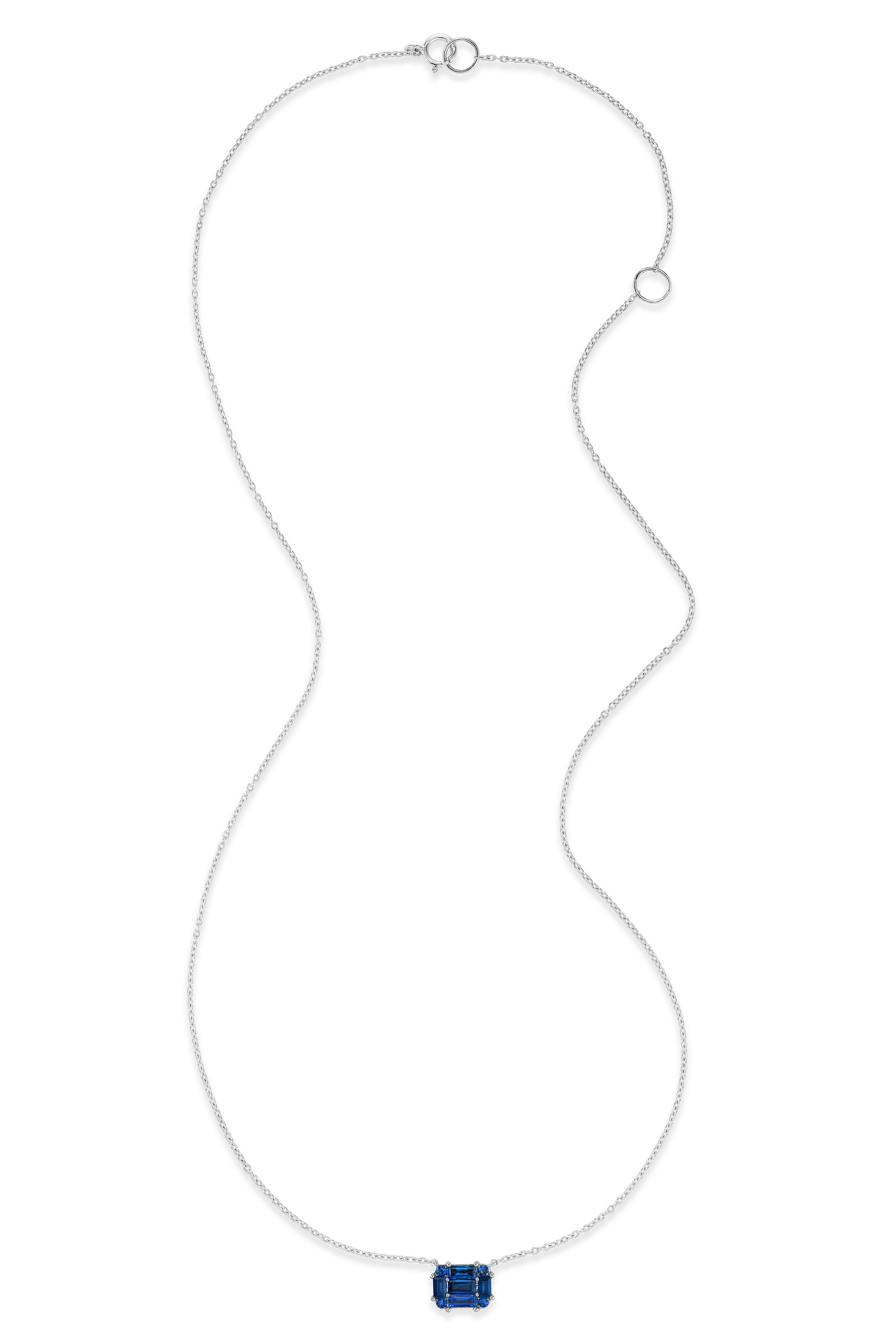 Refined and radiant, this 18-karat white gold pendant necklace features 0.72 carats of rich blue sapphires arranged in the signature invisible setting—creating the illusion of a single emerald-cut stone. Finished in grey and white rhodium, the 16/18-inch adjustable chain offers effortless versatility for layering or everyday wear.