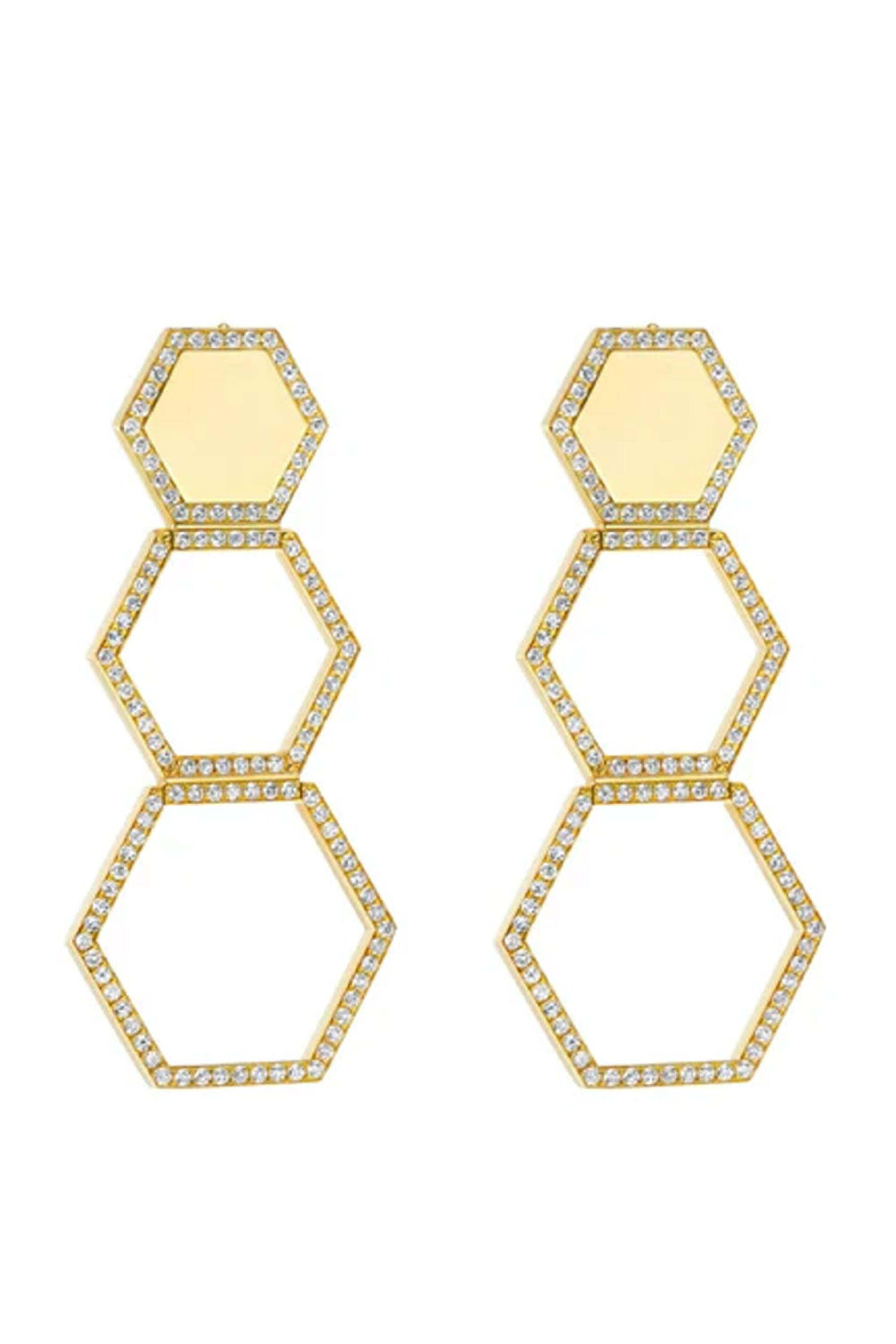 18k gold. Diamond 1.39 total carat weight. Three tier. Diamond halo. Push back post. Made in Italy. Length: 1.93".
