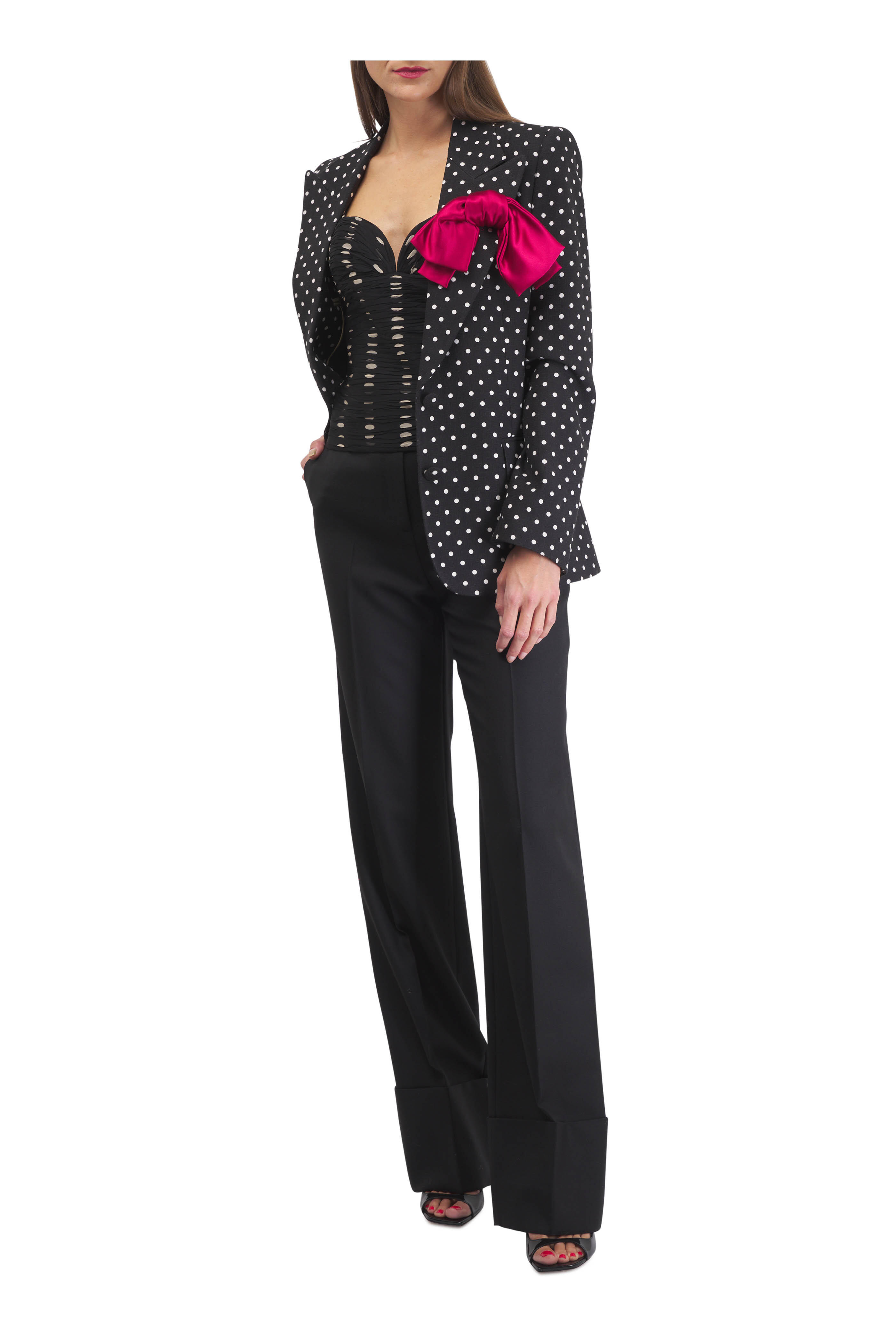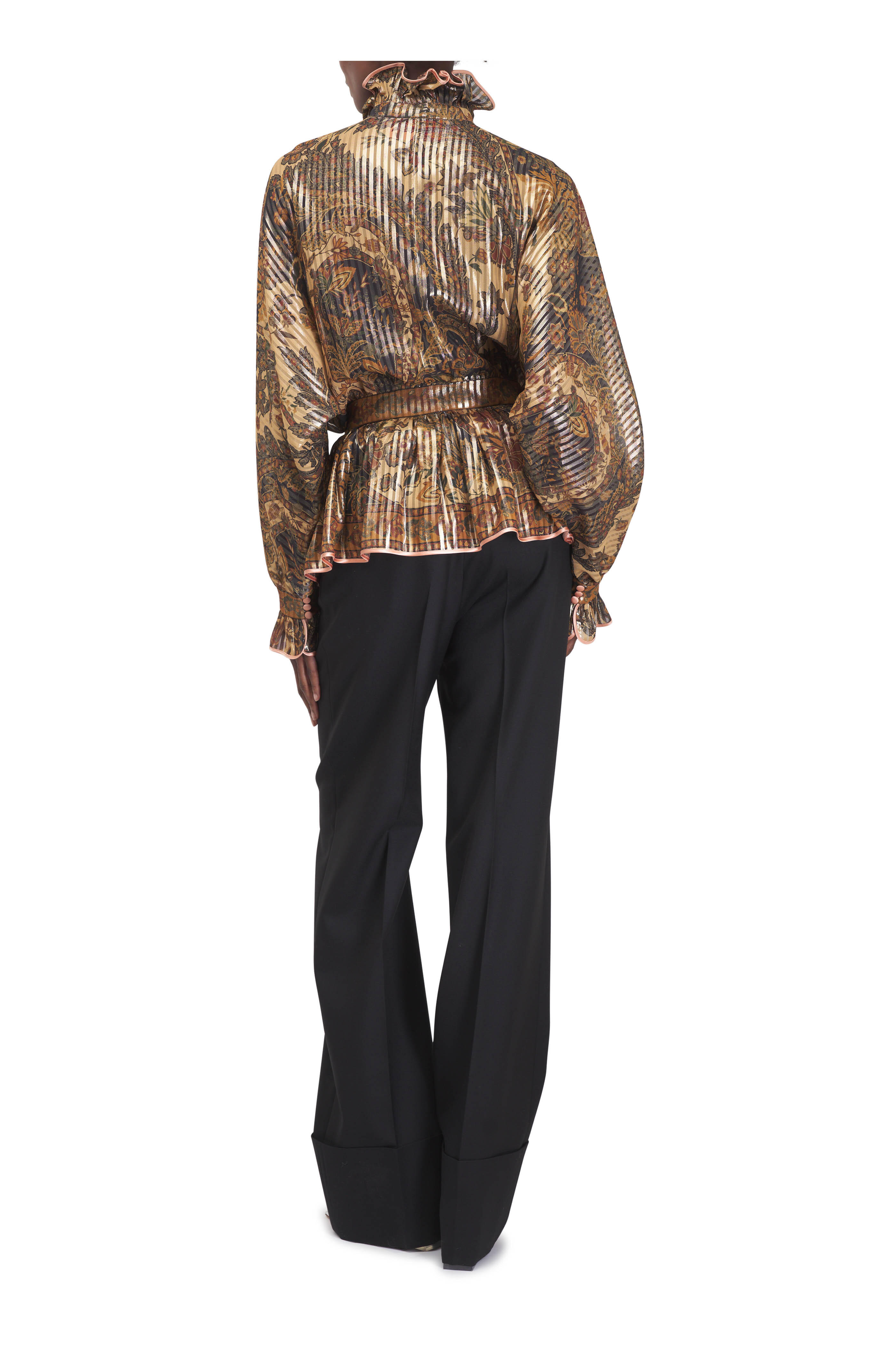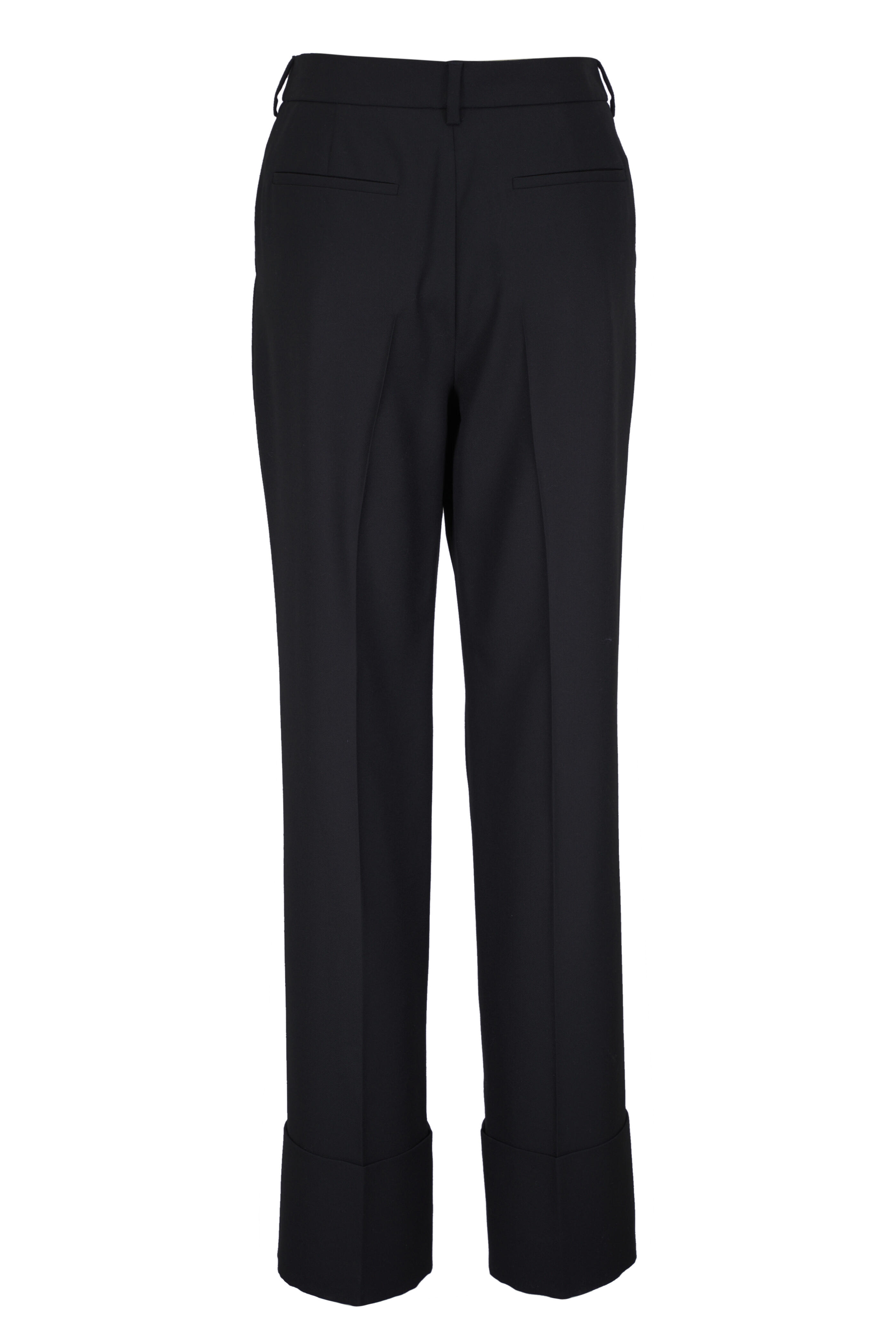 Zip fly; hook-and-bar closure. Banded waist. Side slip pockets; back welt pockets. Turn up cuffs at hem. Made in Italy. 100% virgin wool. Dry clean.