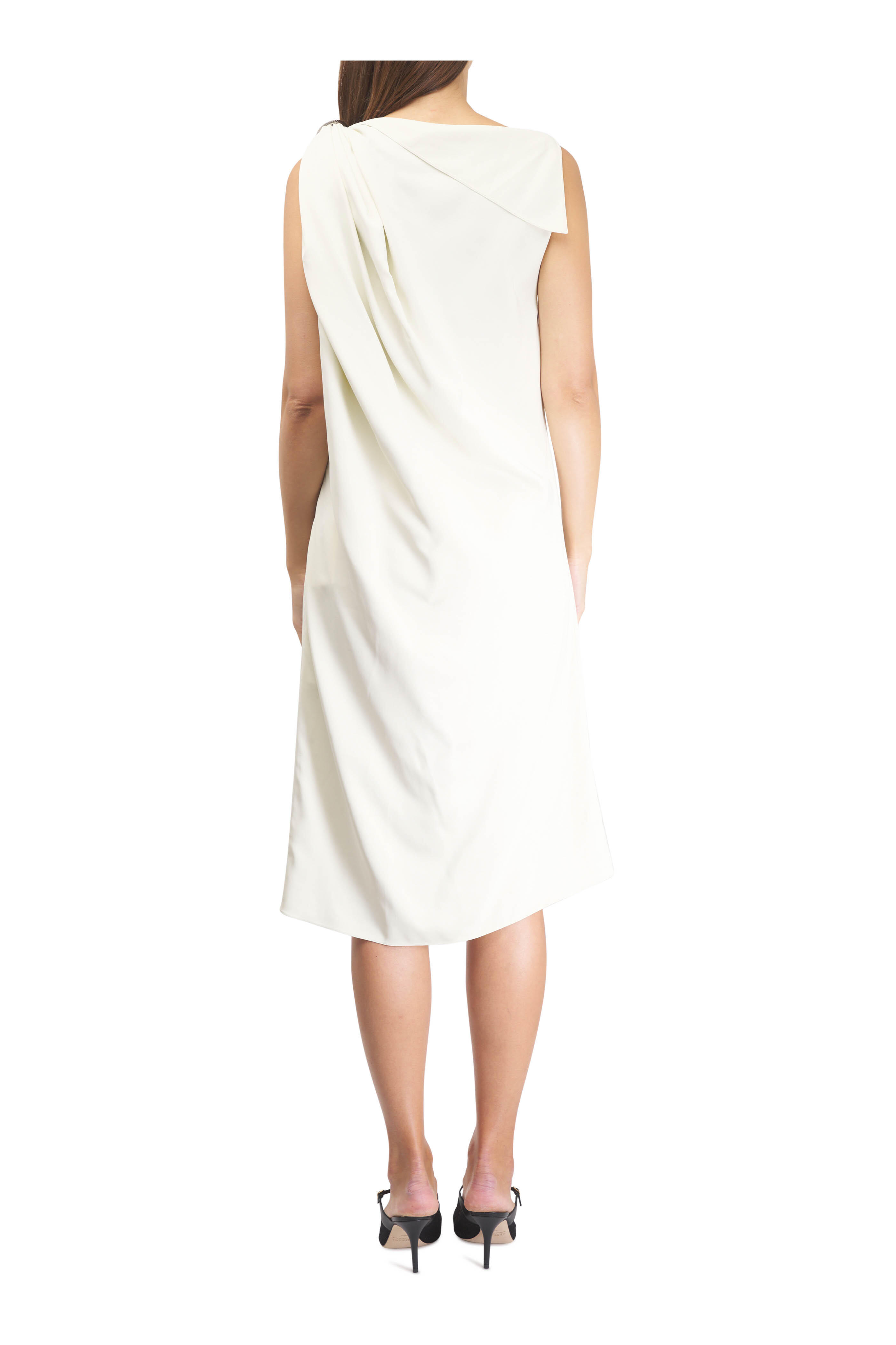 Draped collar. Concealed side zip. Arpège ring on the shoulder. Made in France. Color: Hydrangea. Approximately 41" shoulder to hem (measurements taken from size 6). 97% viscose, 3% elastane. Dry clean.