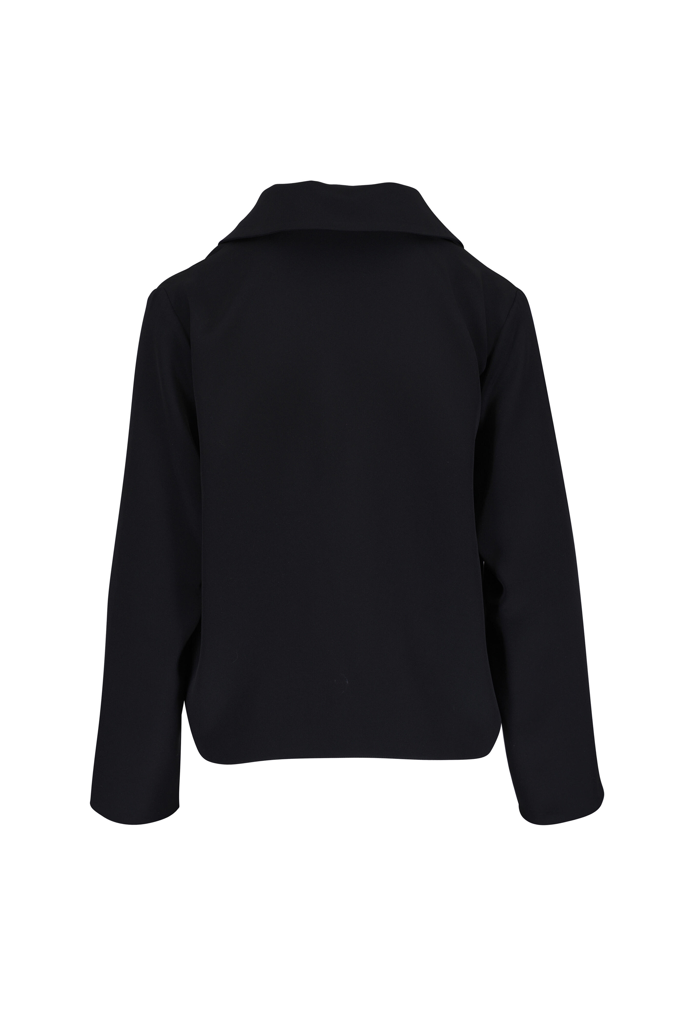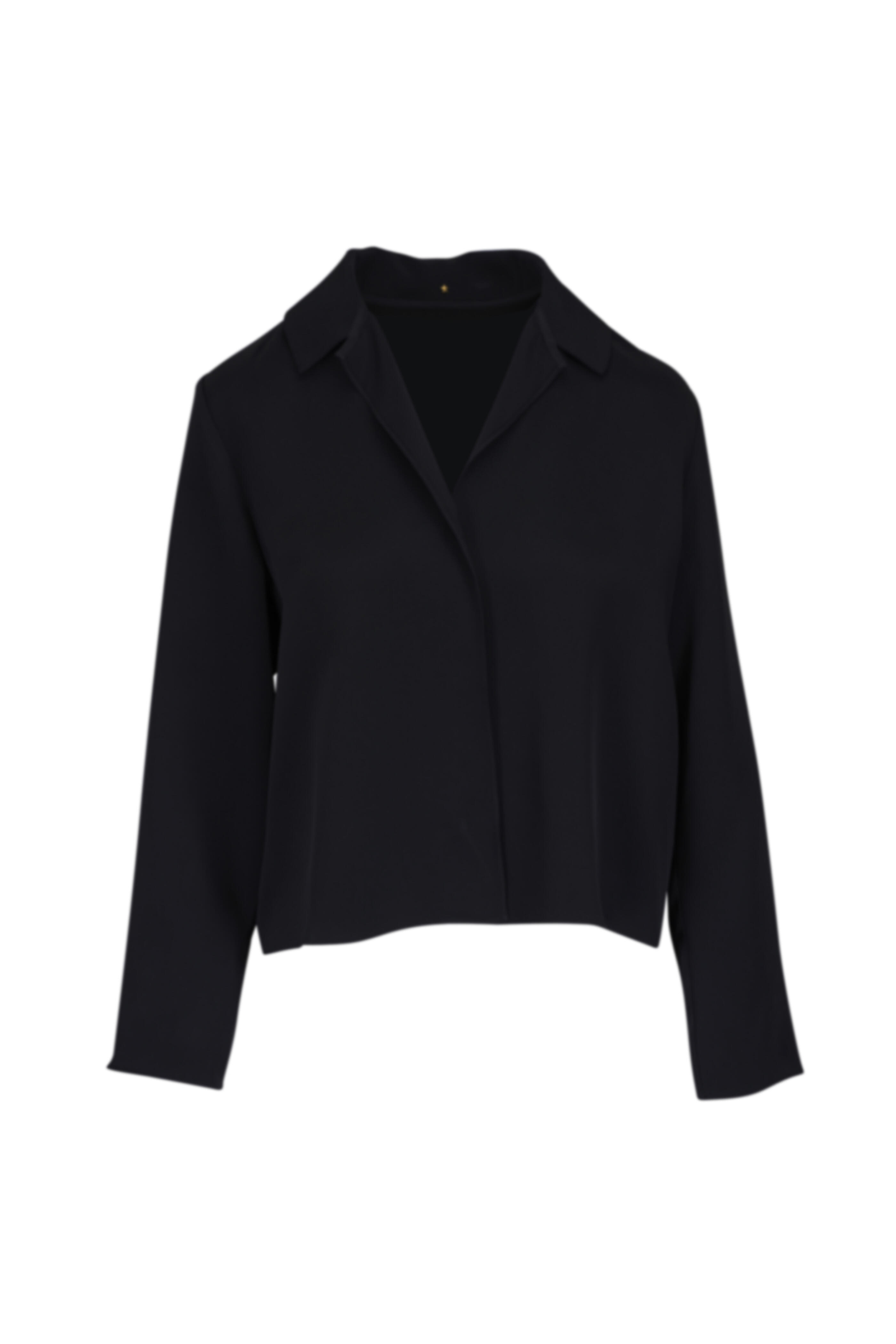 Collared; notched lapels, v-neckline. Three-quarter sleeves. Made in the USA. 100% silk. Dry clean.