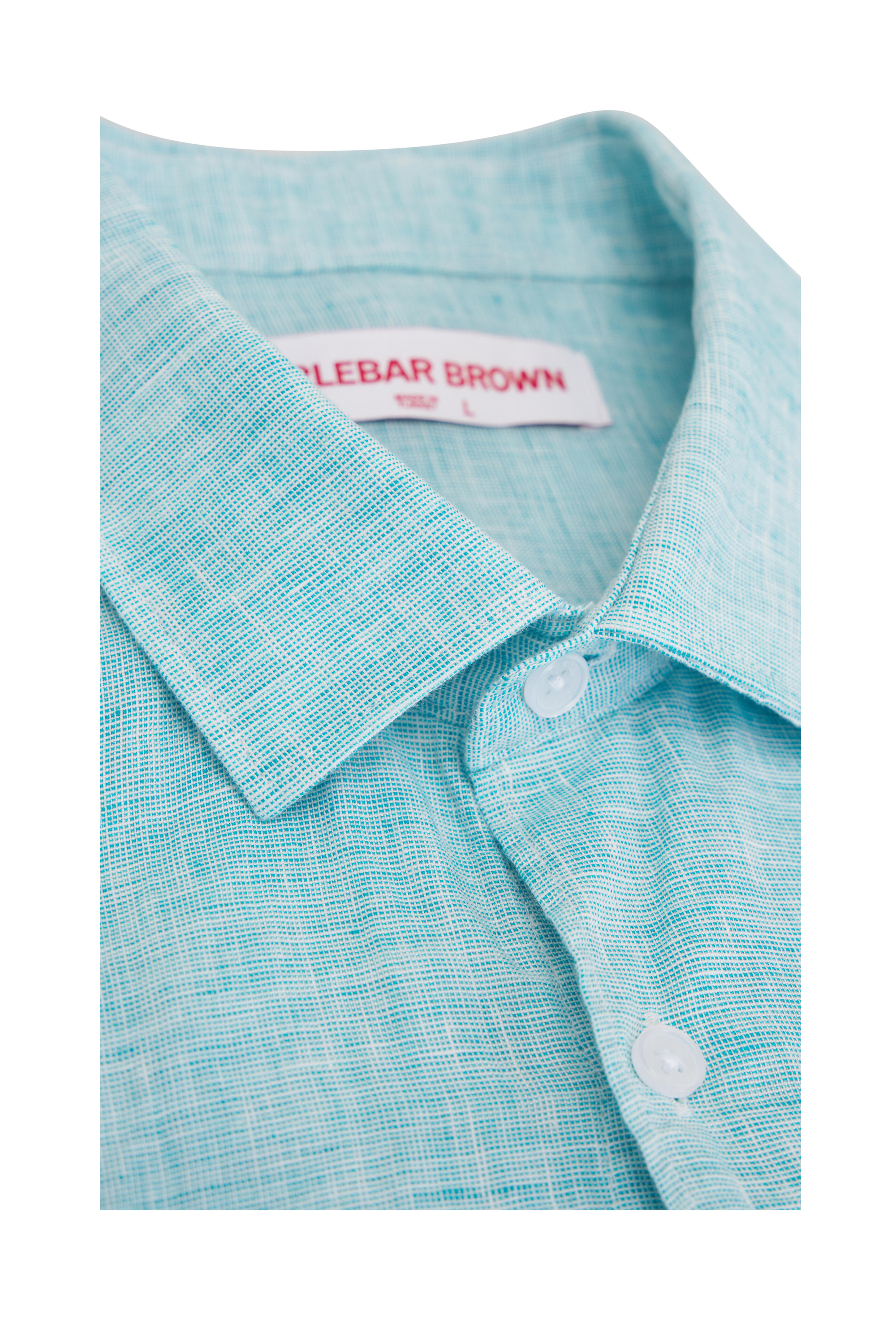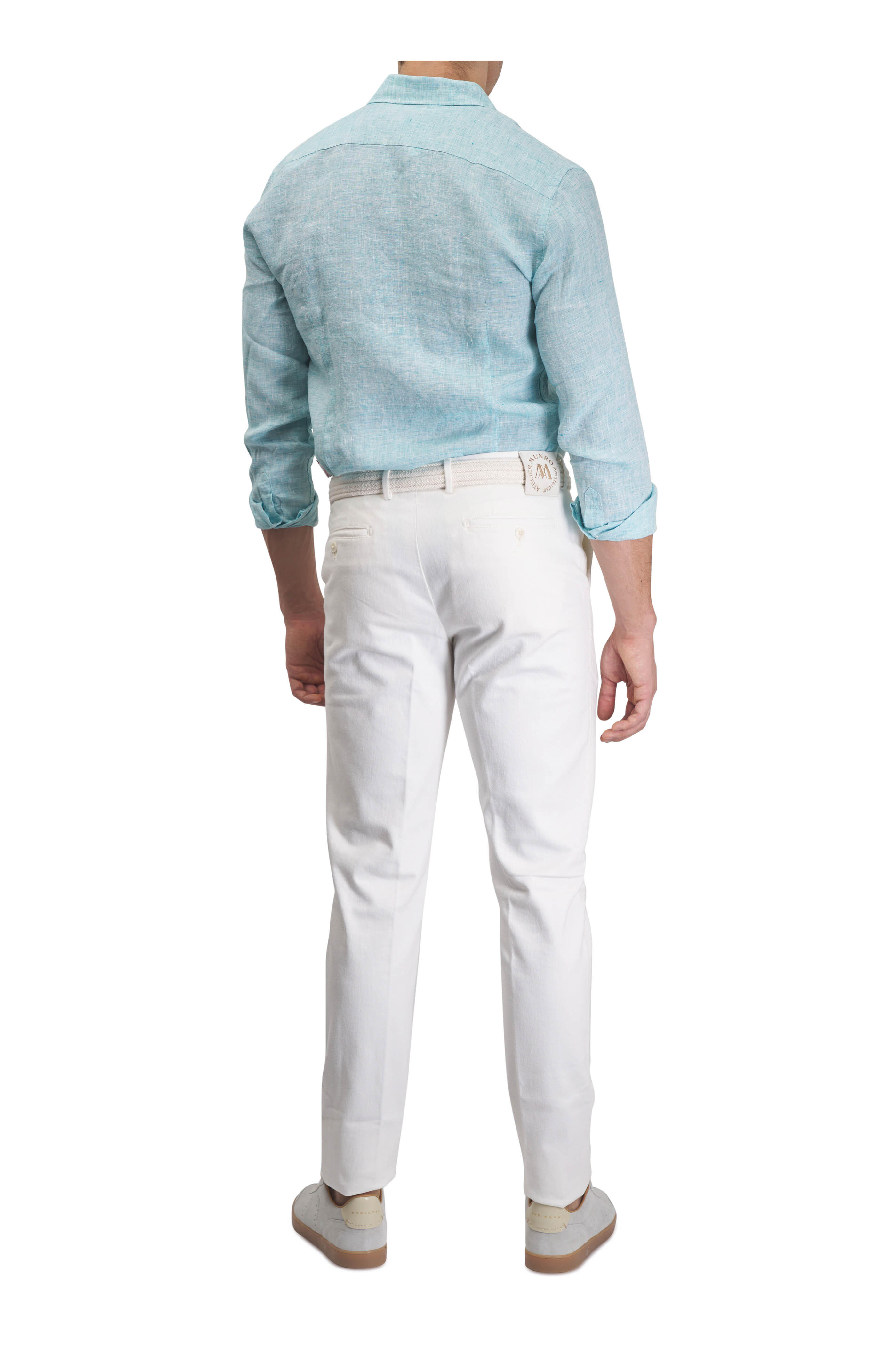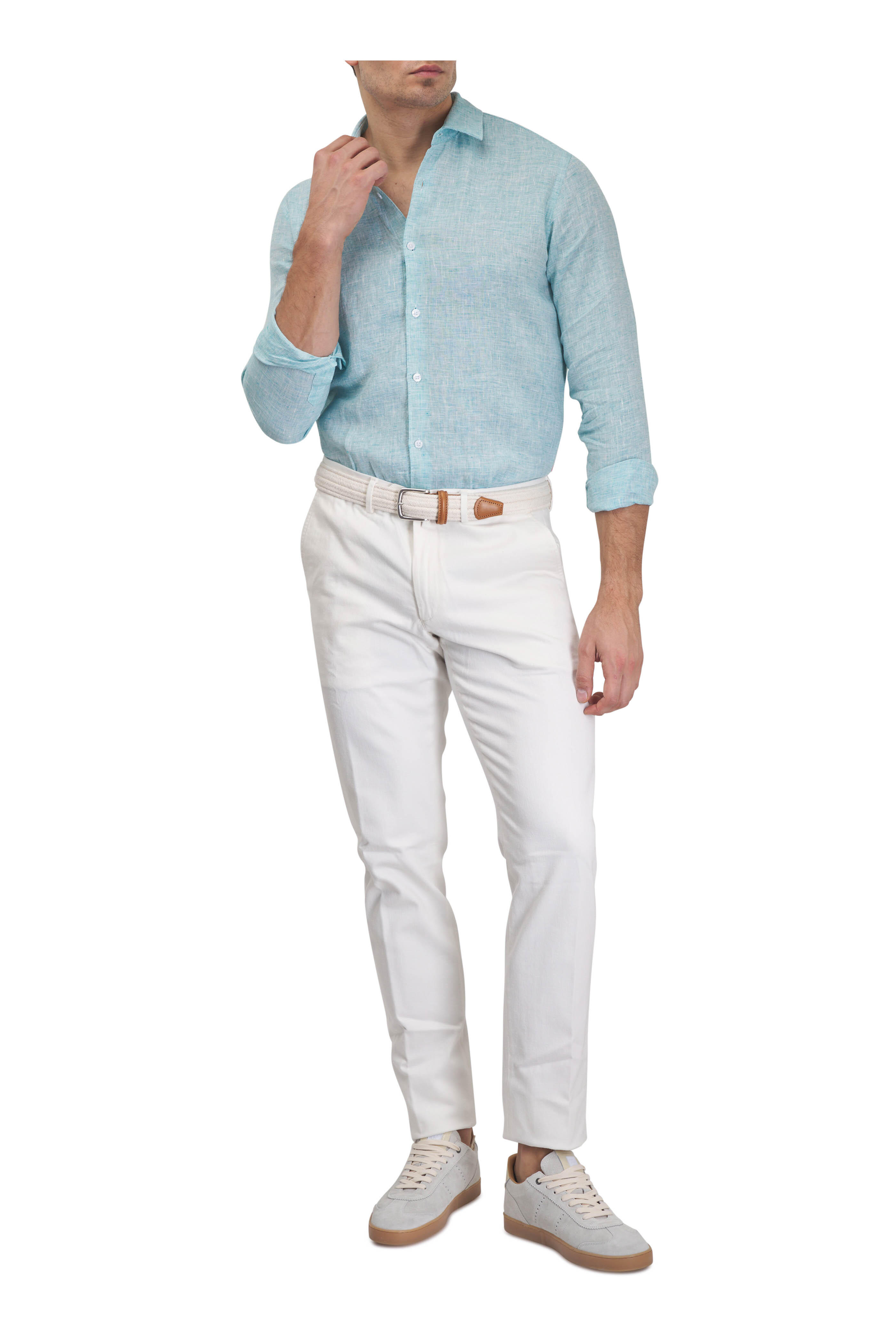 Spread collar. Front button placket. Single button barrel cuffs. Imported. 100% linen. Machine wash.