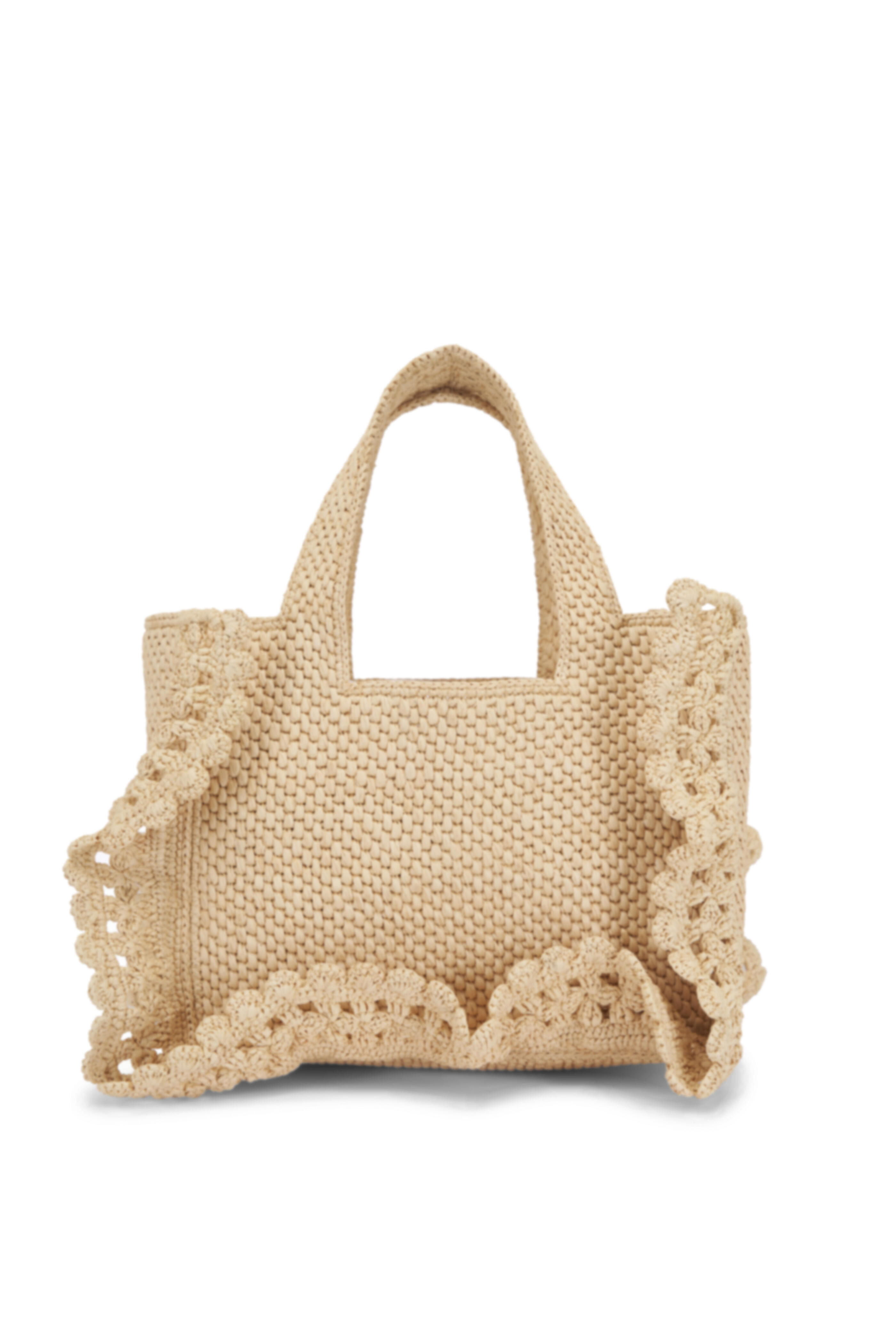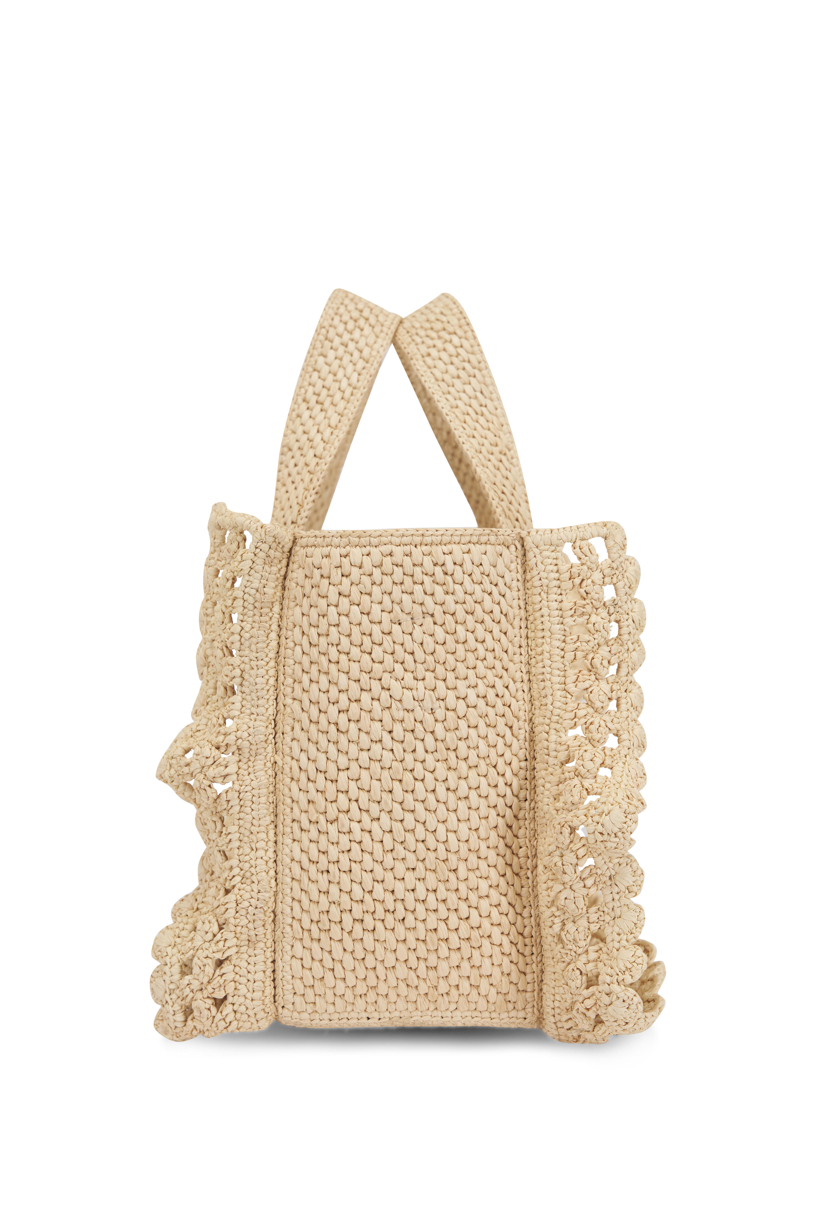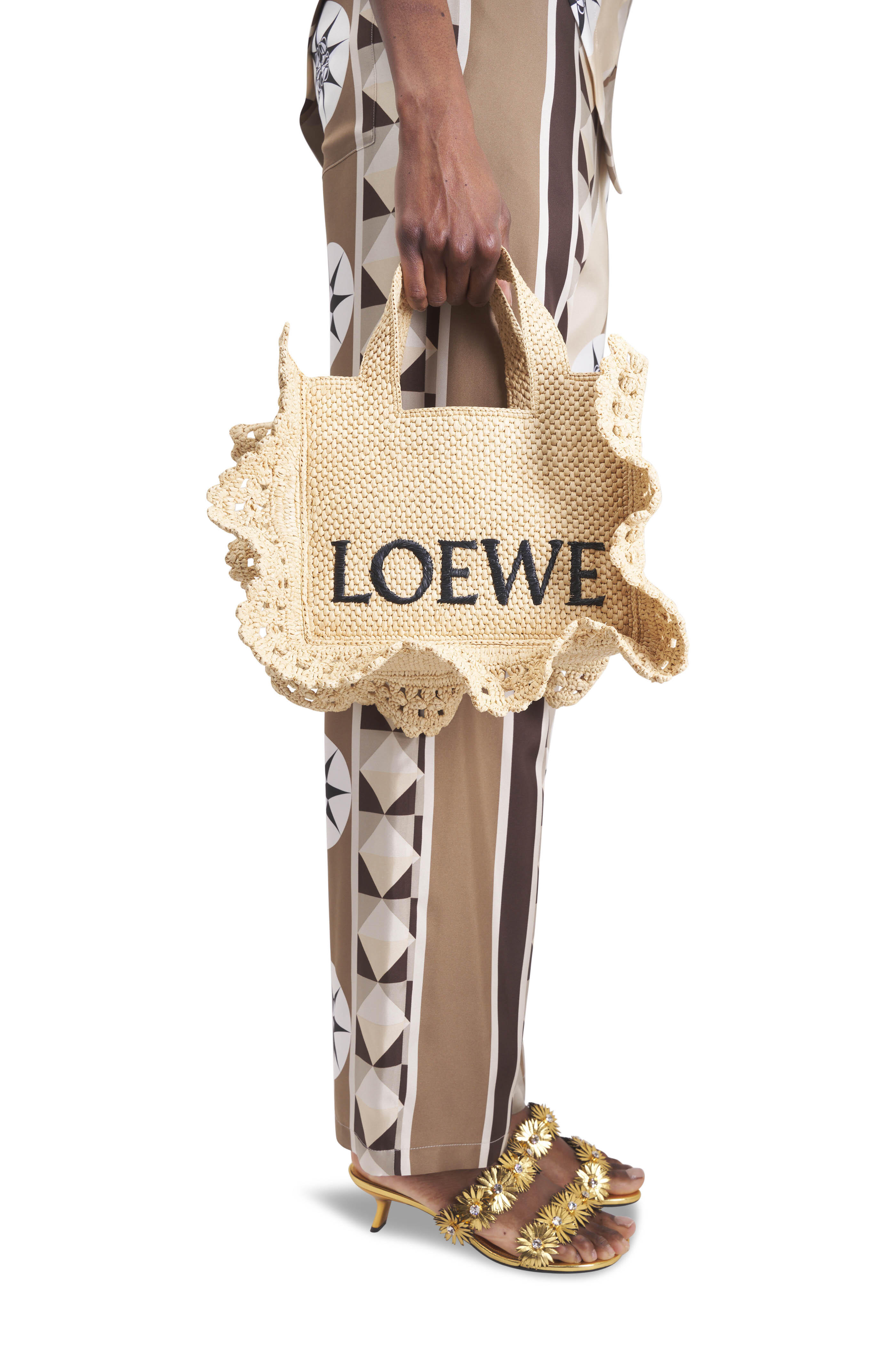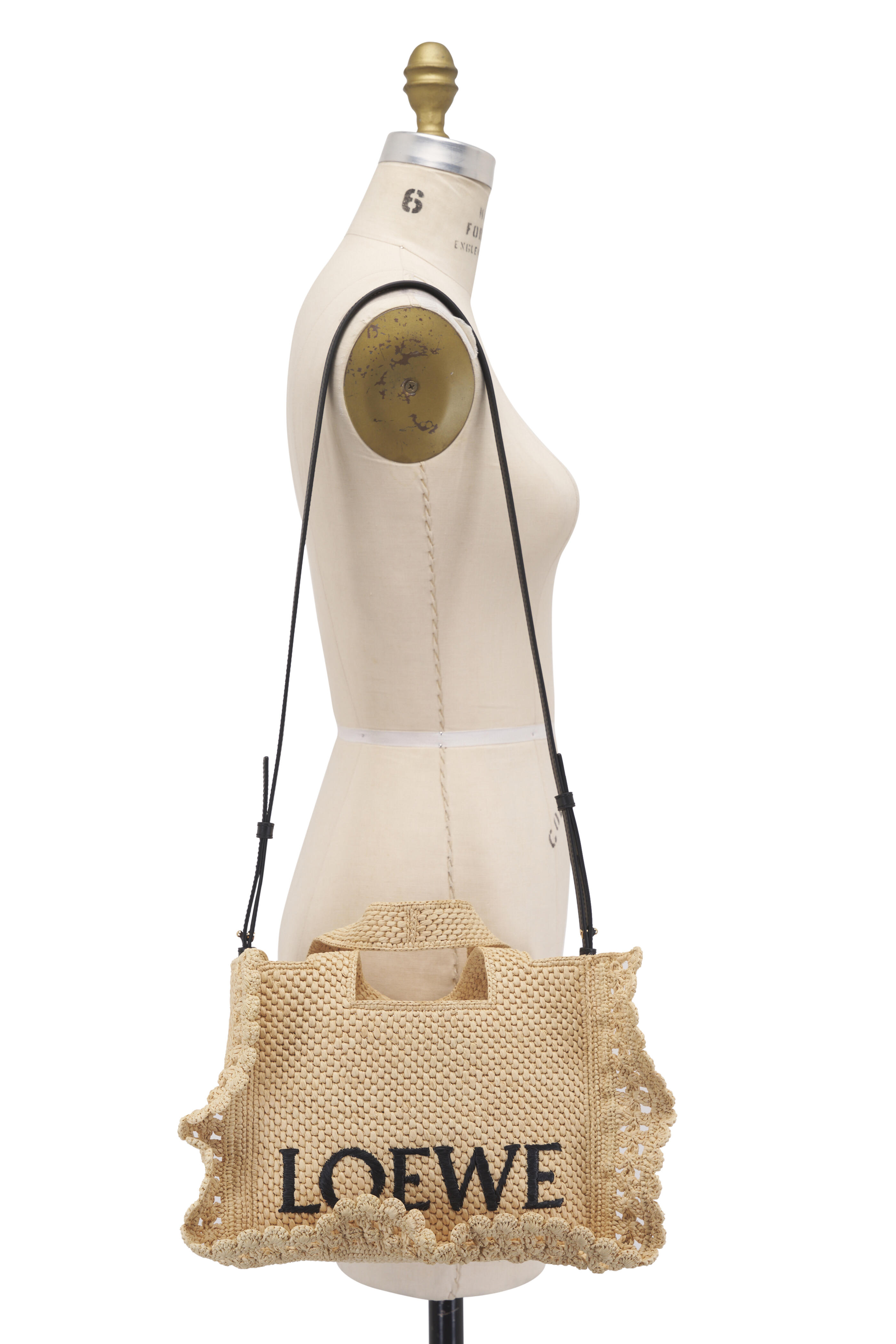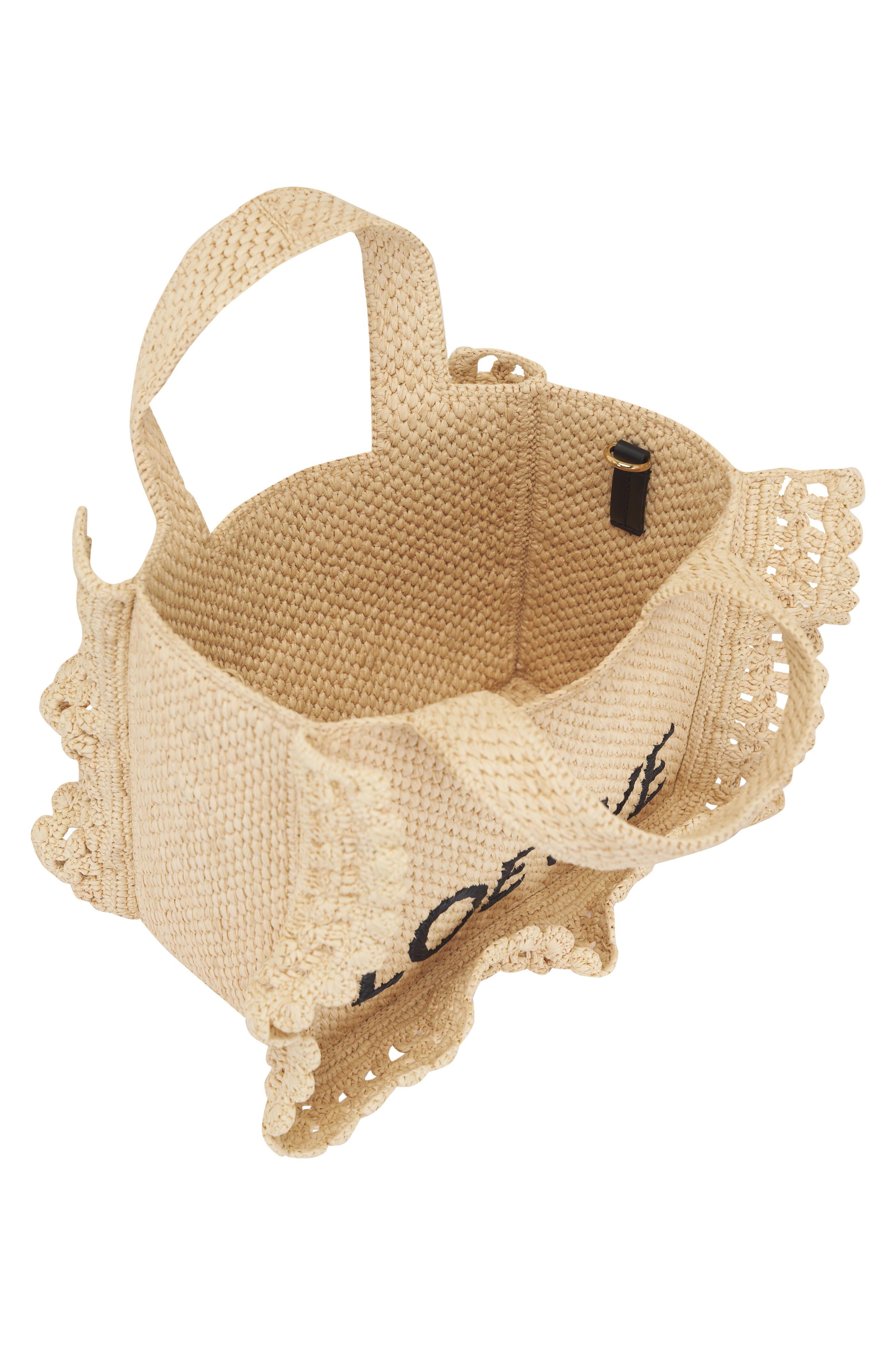 Raffia. Dual top handles. Detachable and adjustable leather shoulder strap. Single compartment. Unlined. Embroidered front logo detail. Gold-tone hardware. Ruffle detailing. Raffia palm leaves cultivated and handwoven by artisans in Madagascar. Made in Spain. Height: 19.5 cm. Width: 24 cm. Depth: 11 cm. Handle drop: 16 cm. Strap drop: 52 - 57 cm. Strap length: 107 - 117 cm.