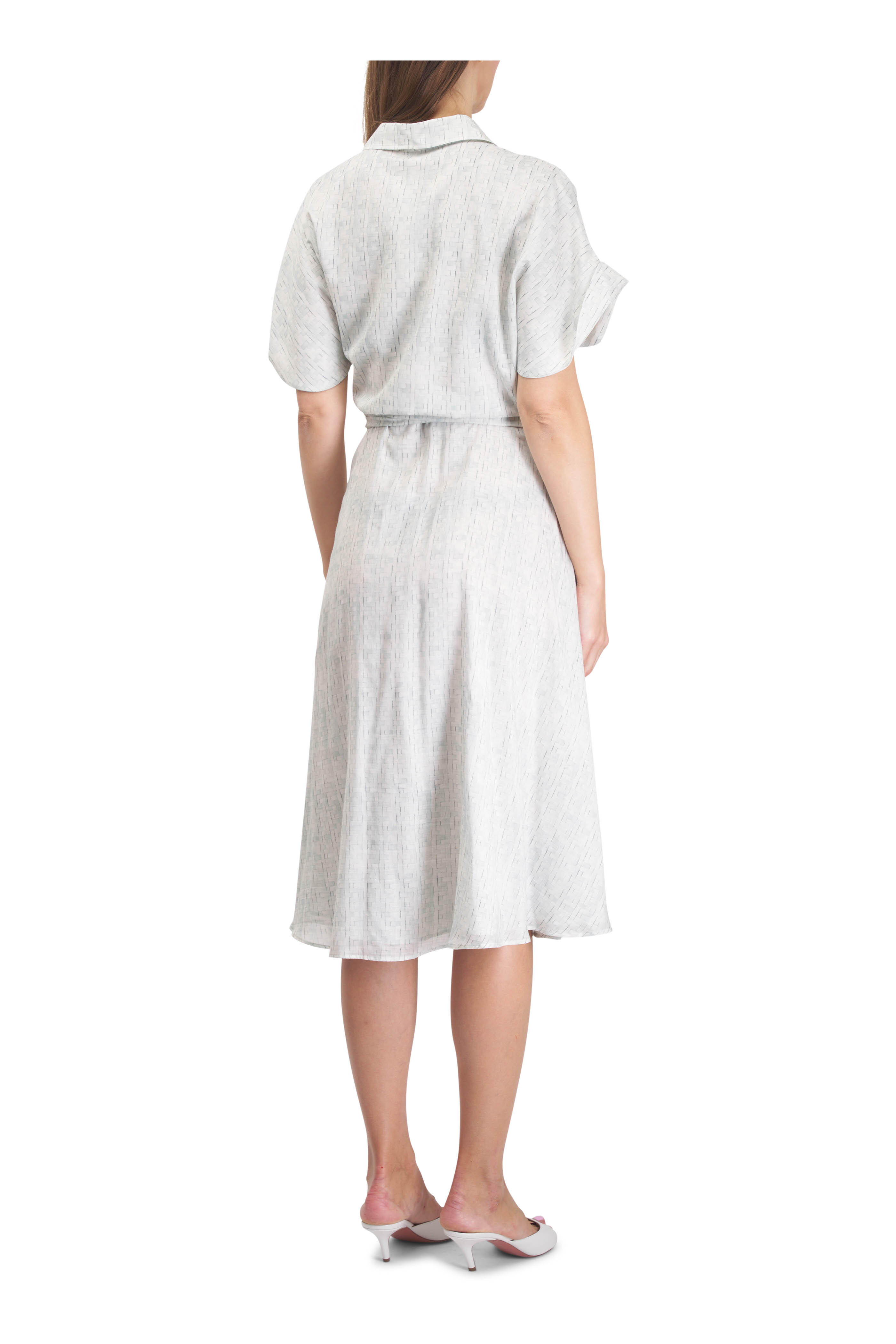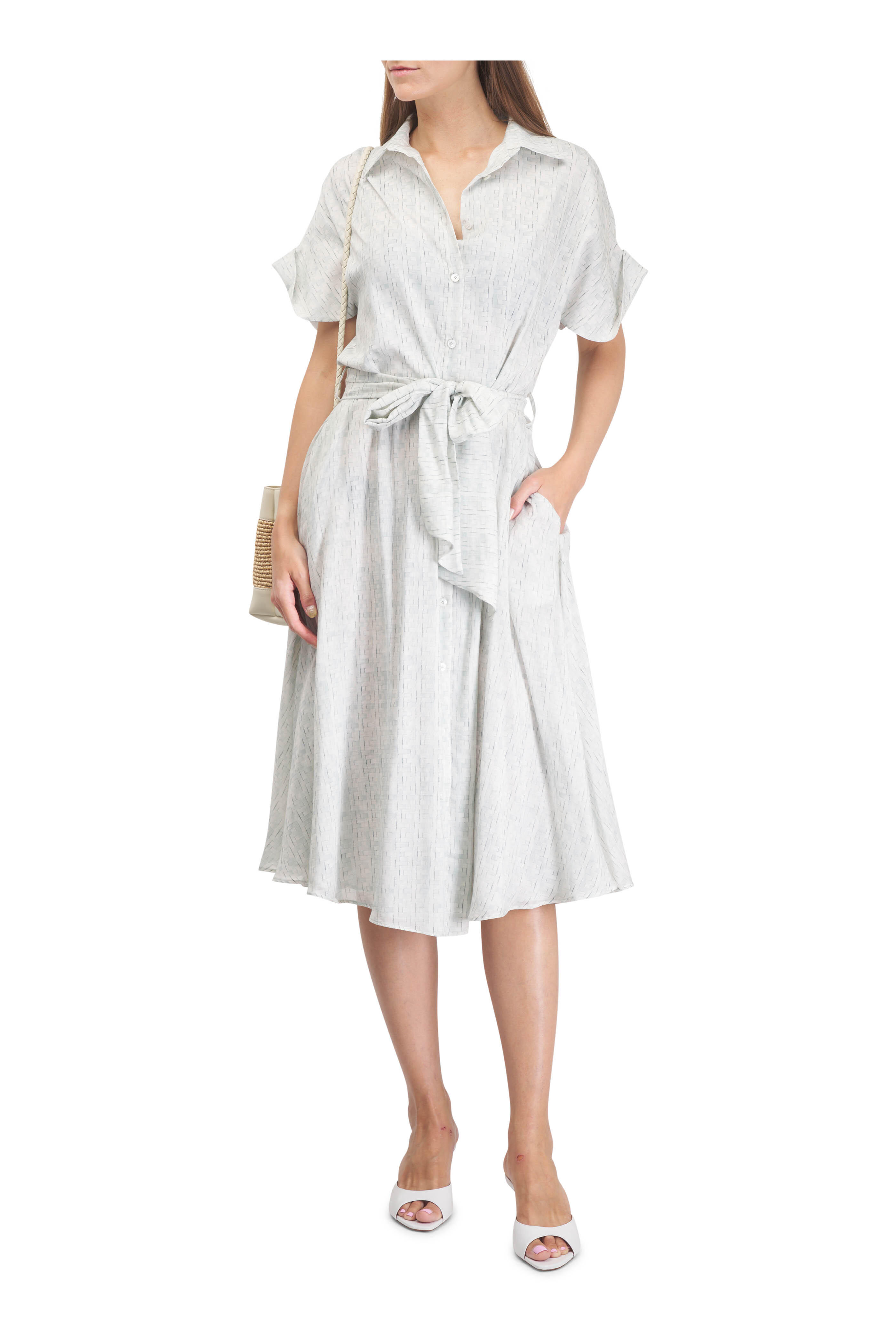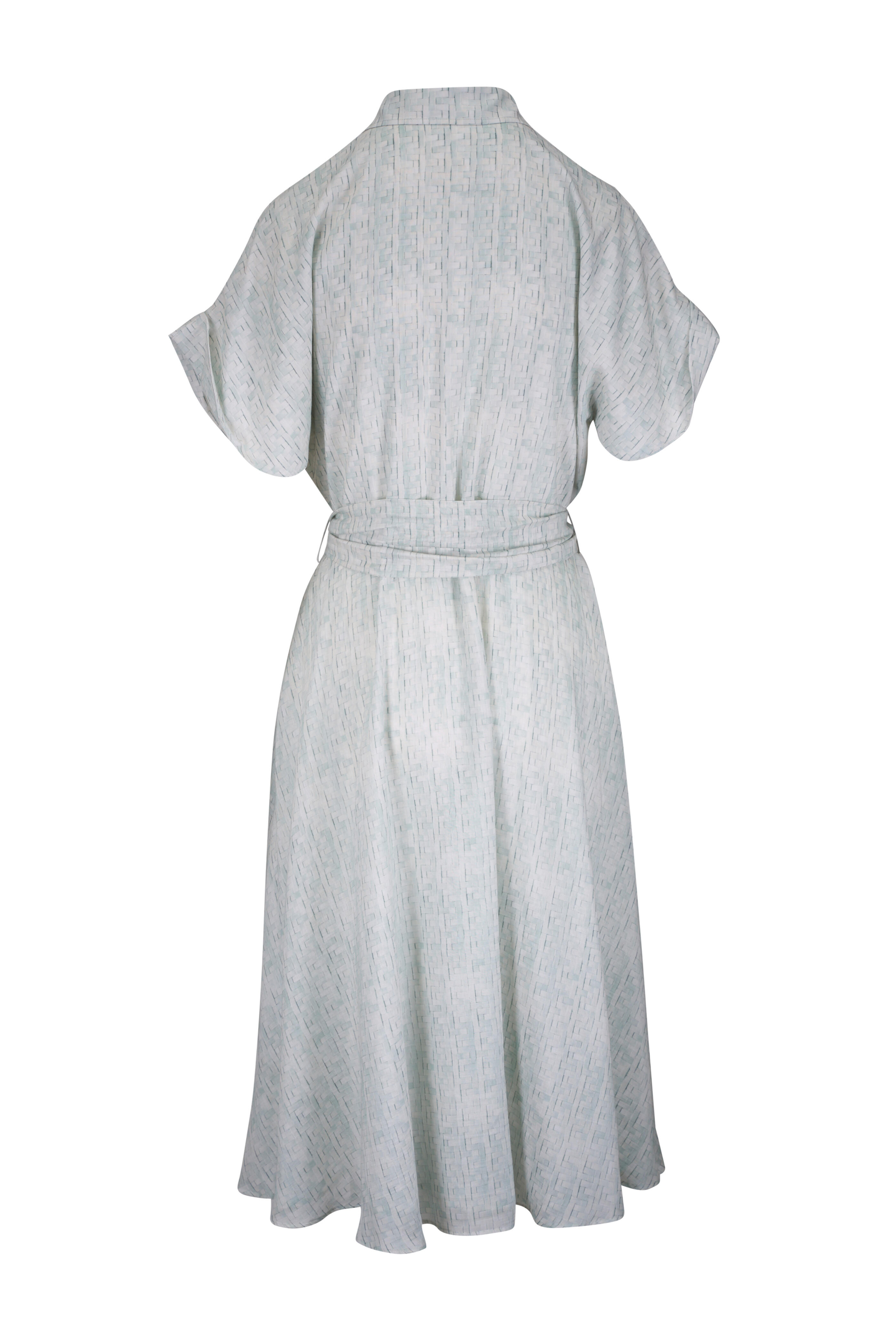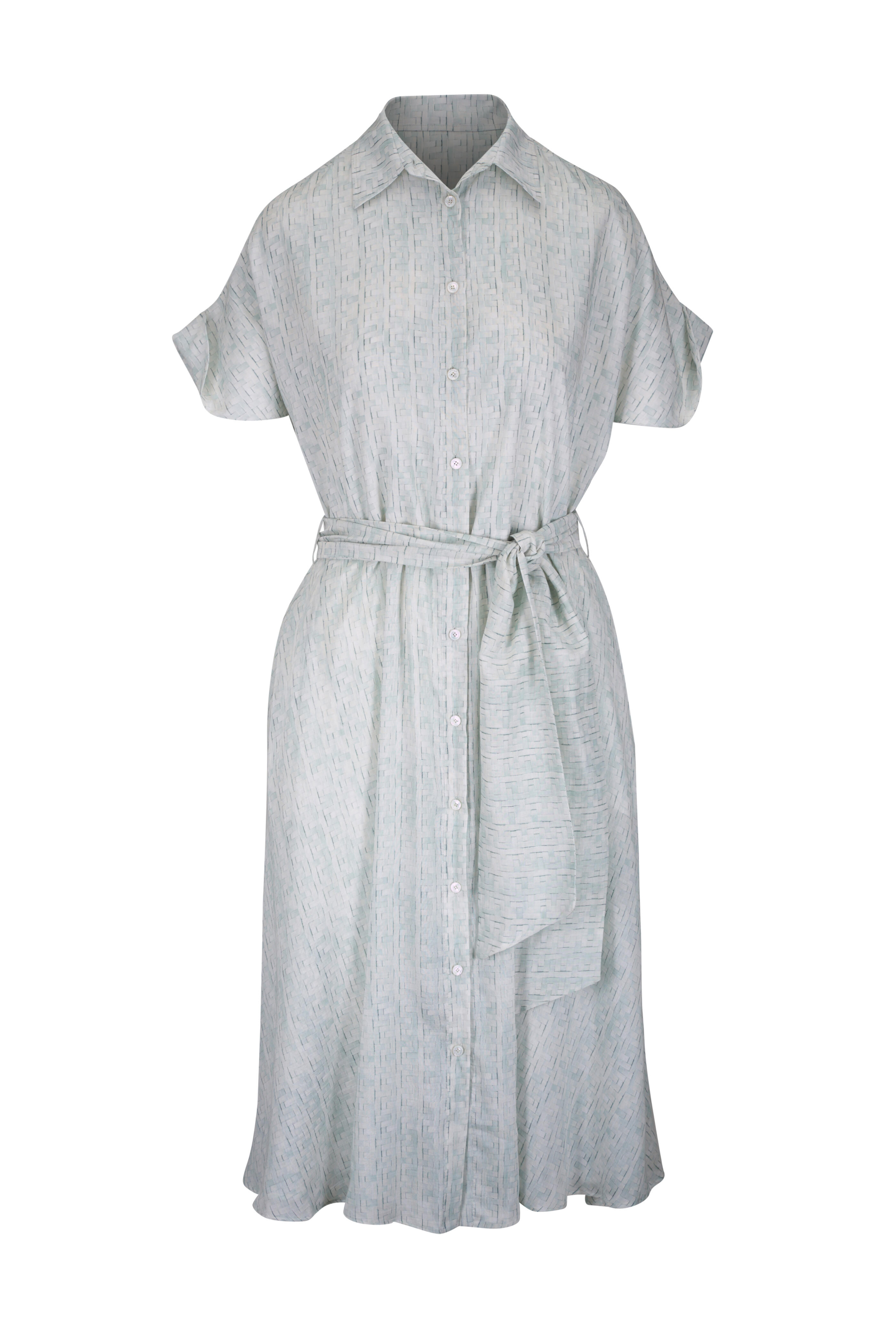 Spread collar. Front button placket. Self-tie removable belt. Rolled sleeves. Made in Italy. 44" shoulder to hem. 73% cotton, 27% silk. Dry clean.