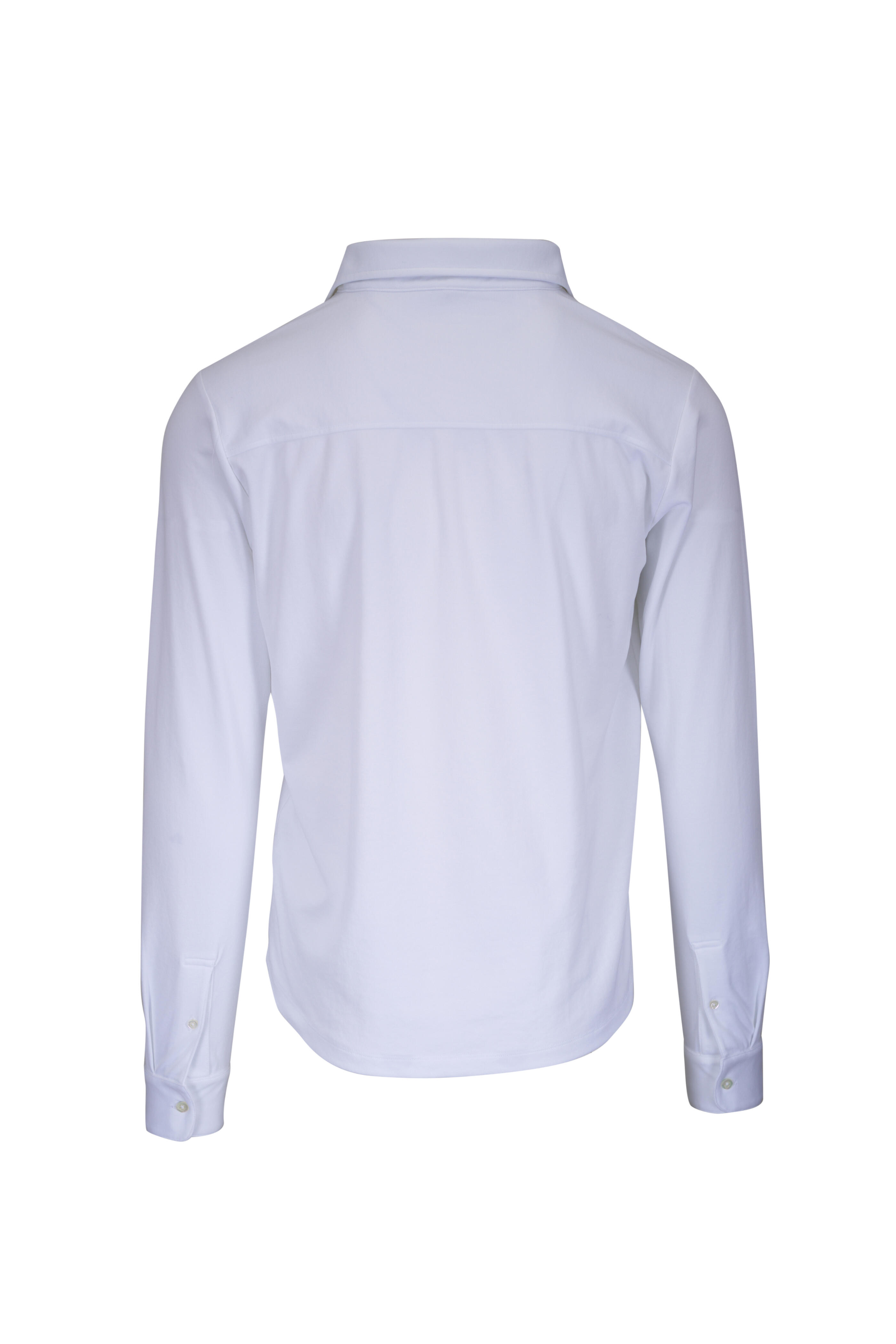 Polo collar. Four button placket. Single button barrel cuffs. Made in Portugal. 57% cotton, 43% polyester. Machine wash.