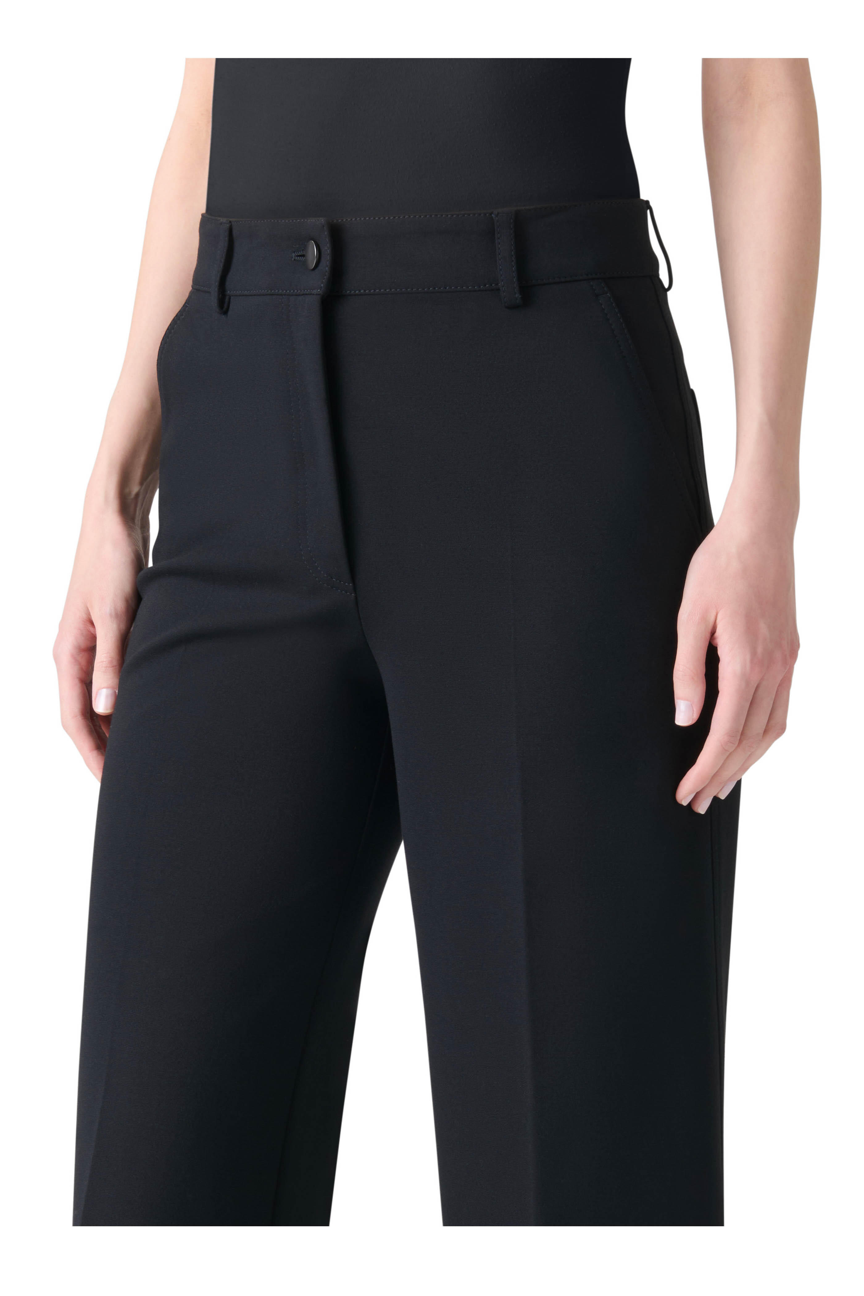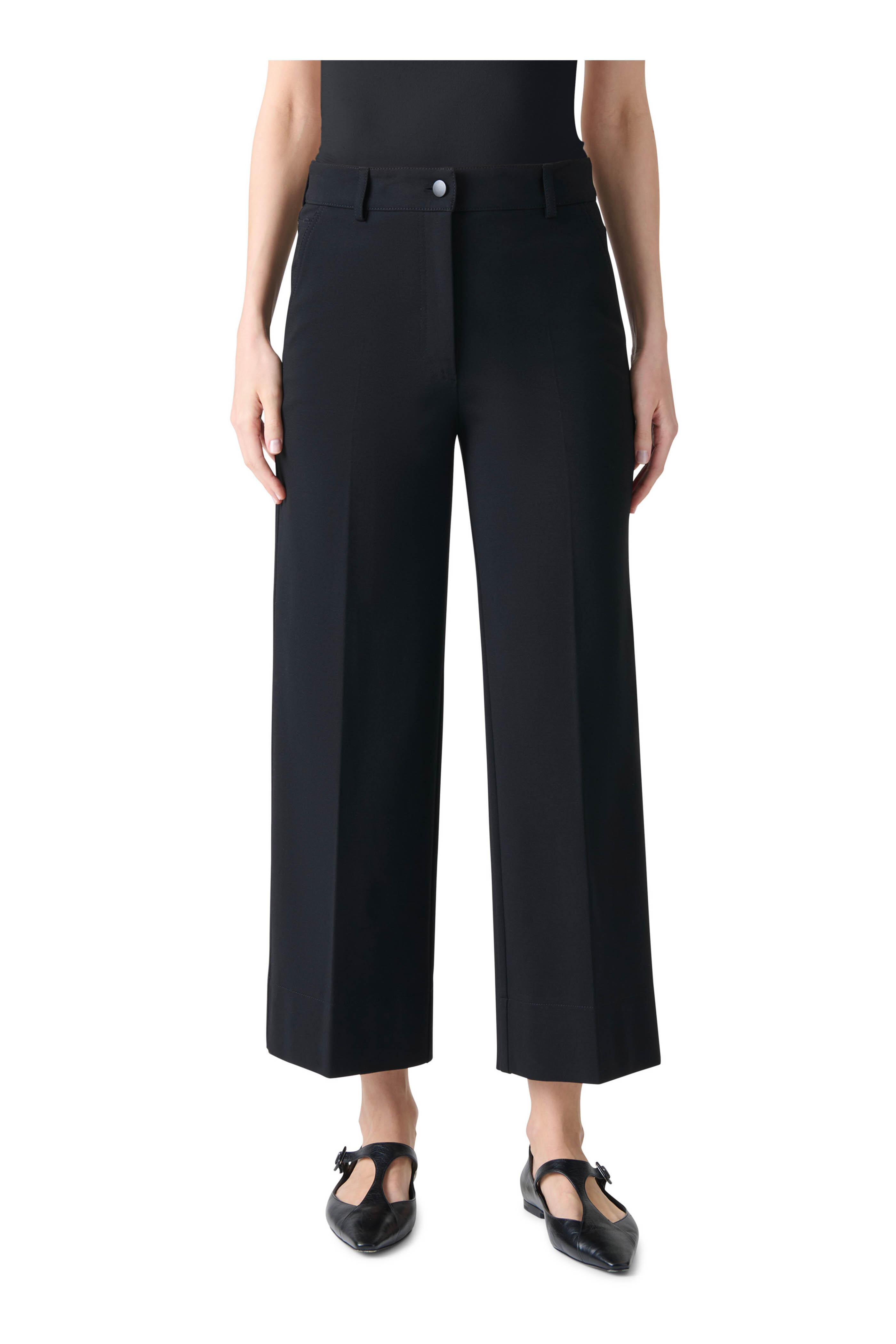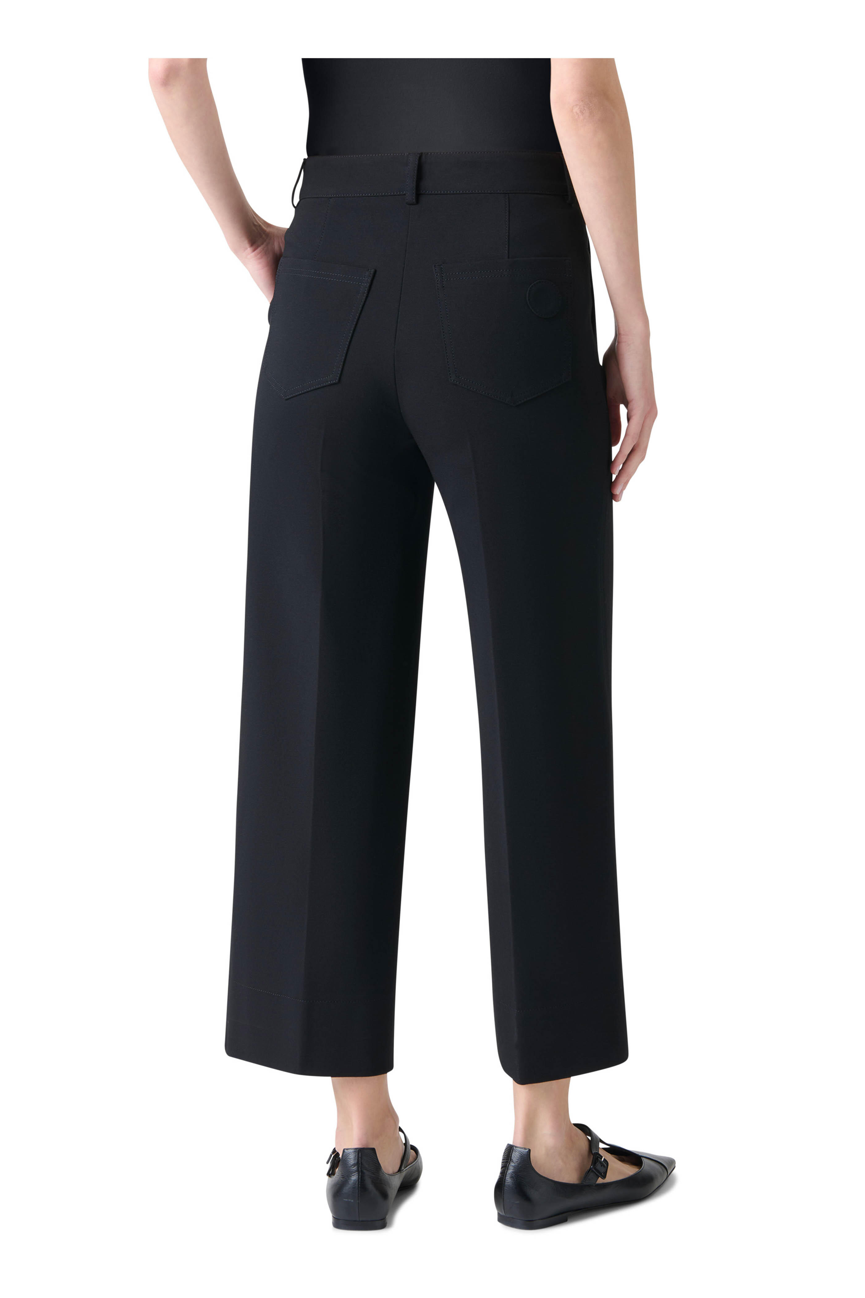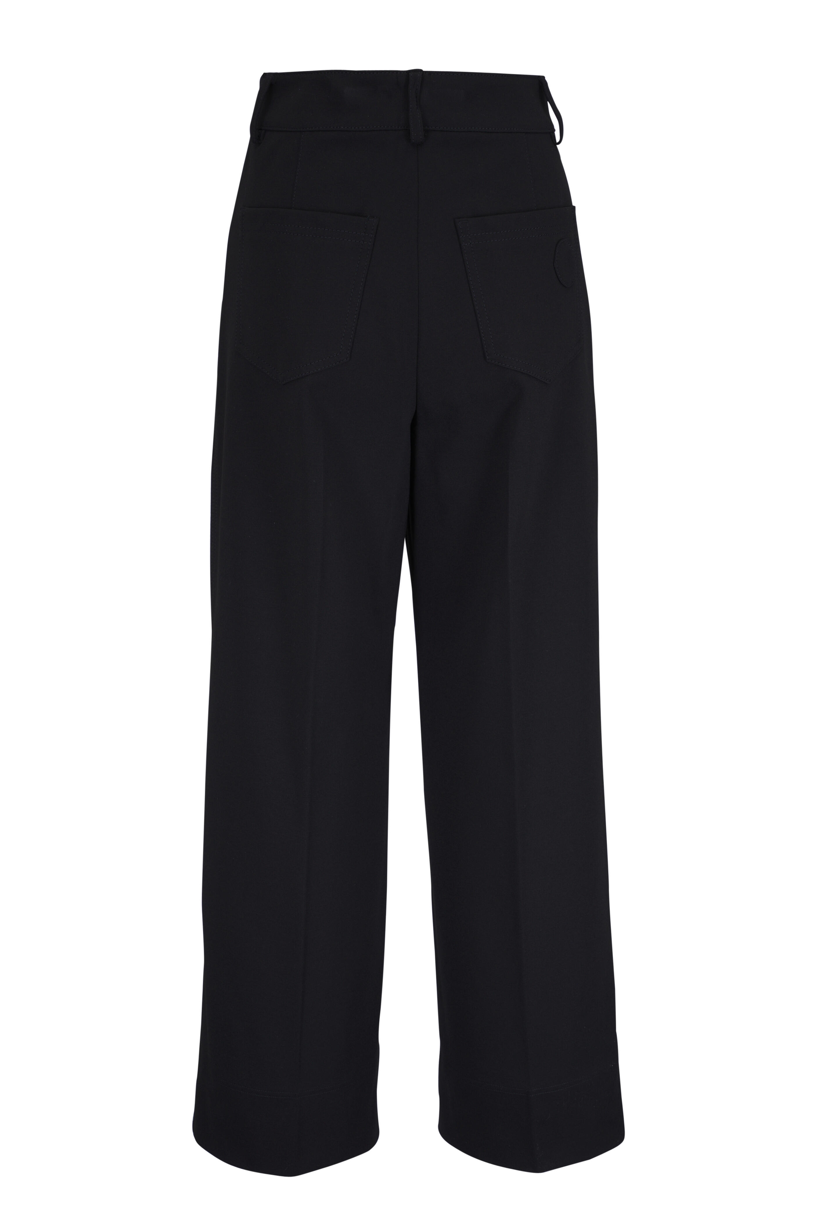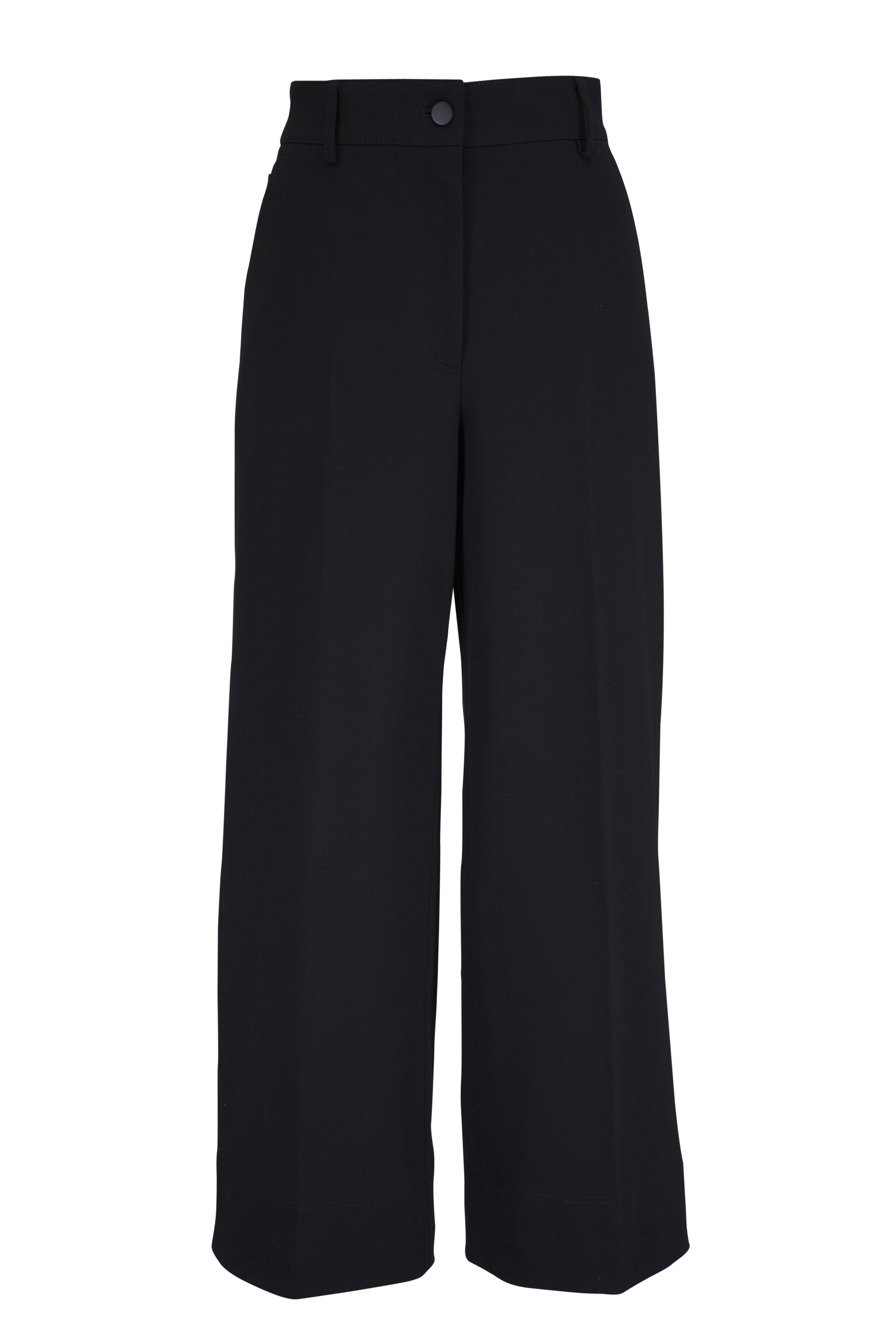 Zip fly; button closure. Side slip pockets. Back patch pockets. Wide through leg. Cropped length. Imported. 27" Inseam (size 6). 69% viscose, 25% nylon, 6% elastane; lining. Dry clean.
