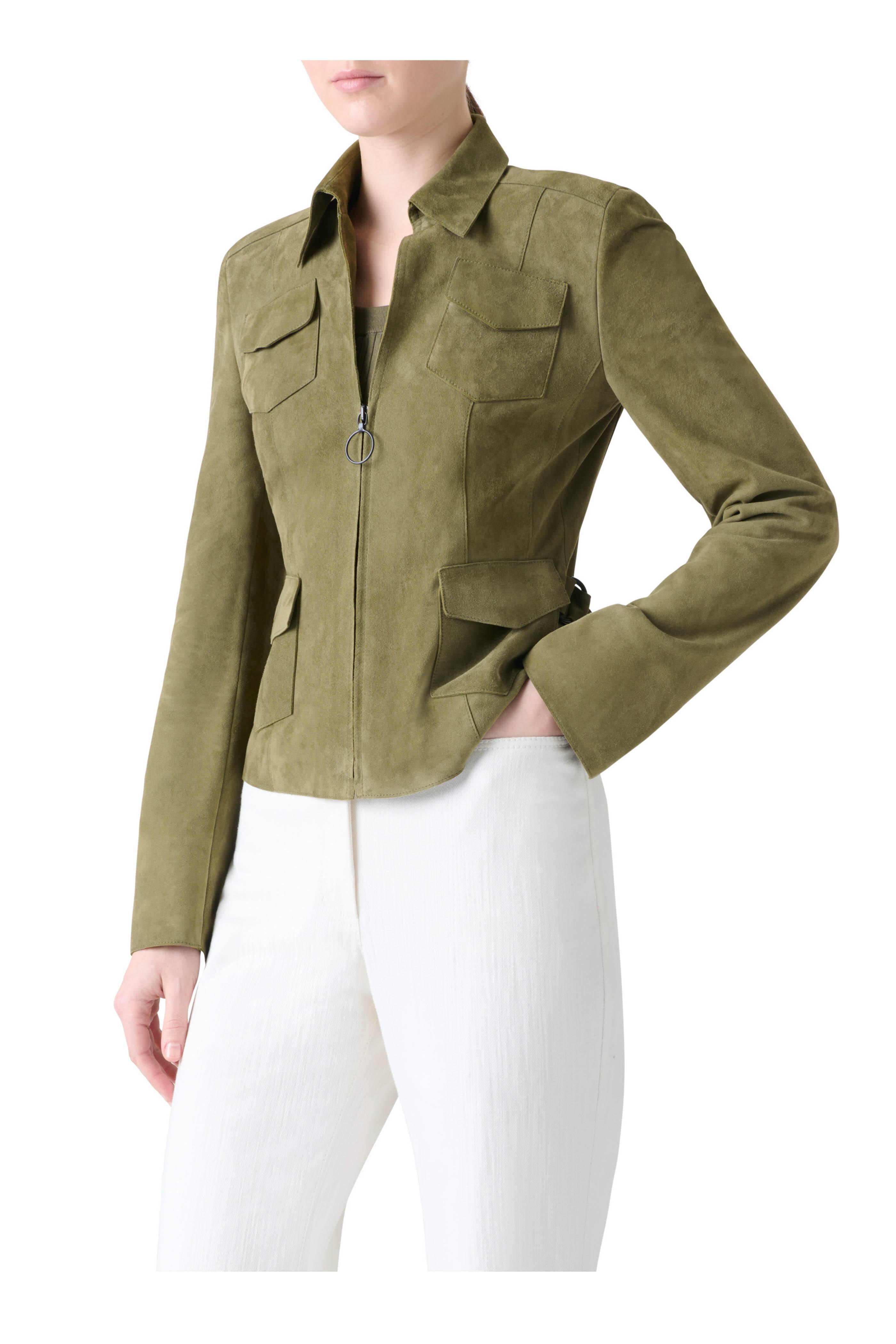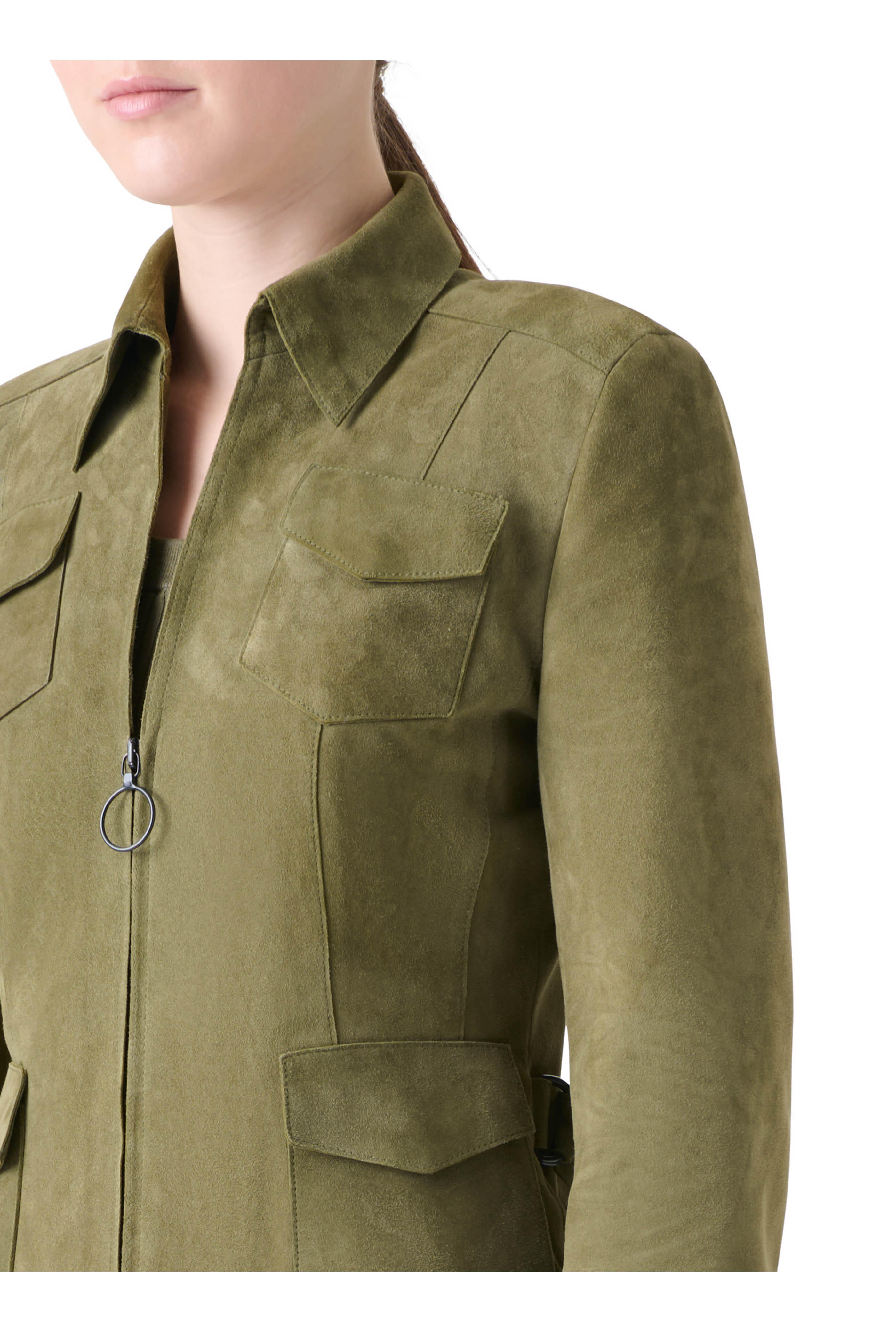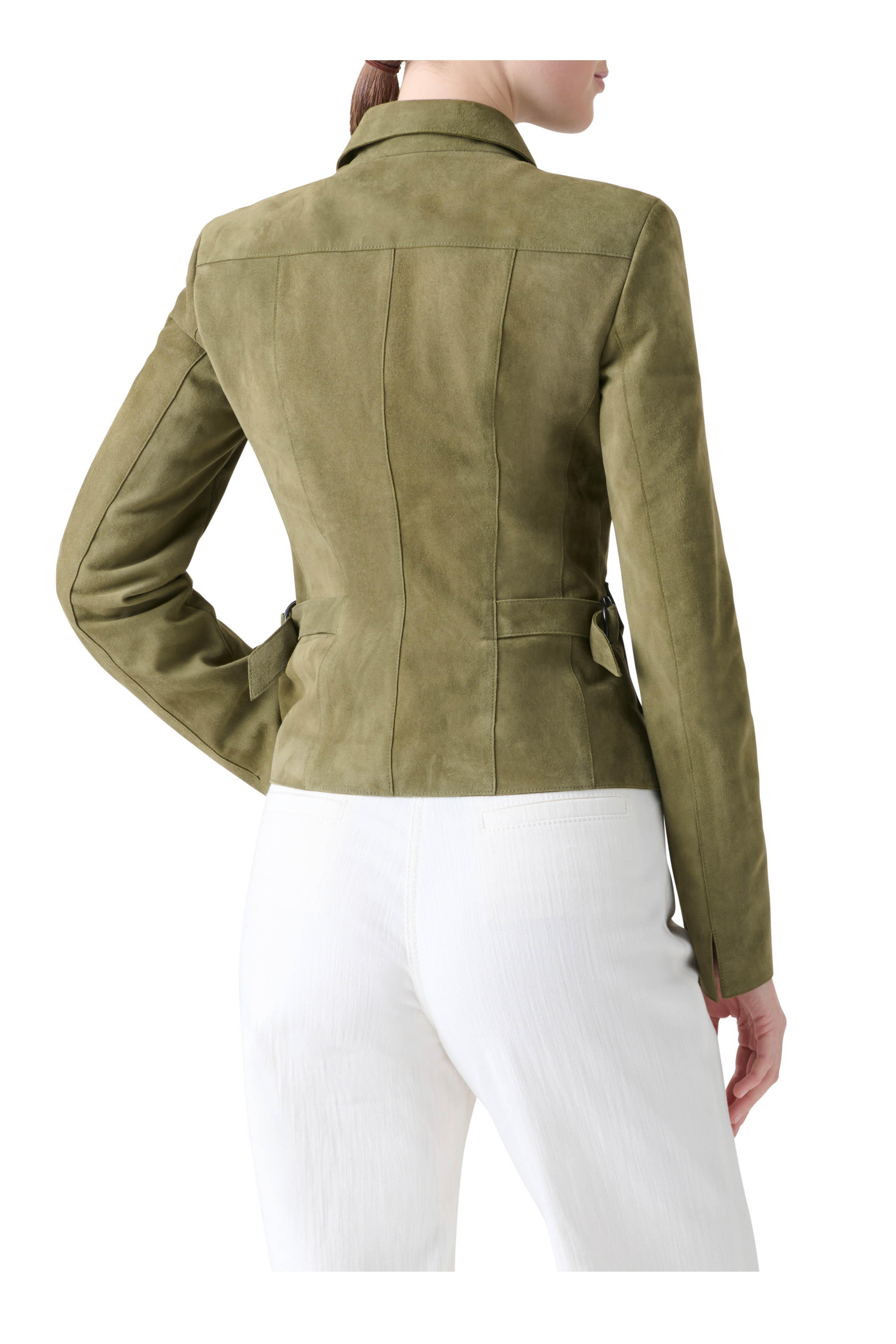 Specialist clean. Pointed collar. Front zip placket. Four front flap pockets. Adjustable D-ring waist tabs. Vented cuffs. Straight hem. Imported. Shoulder to hem 22" (size 6). 100% Goat suede; fully lined.
