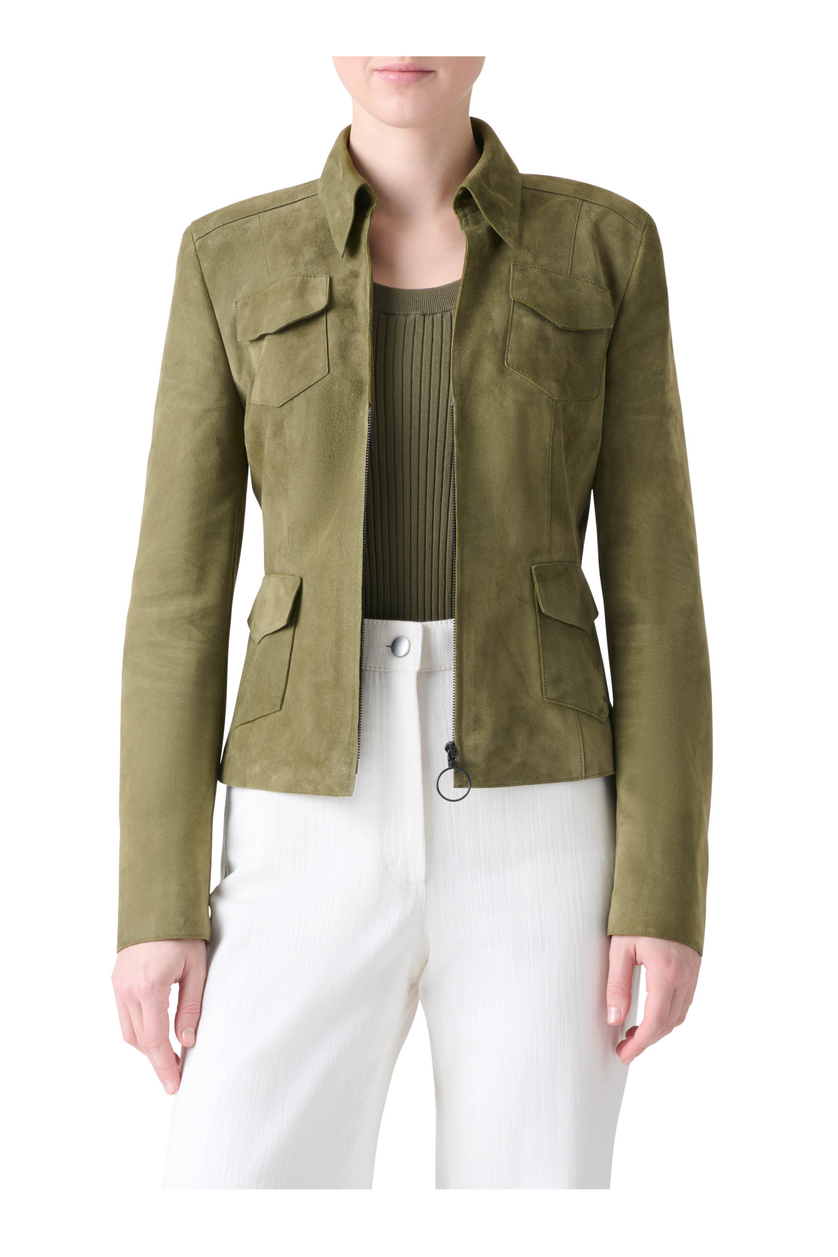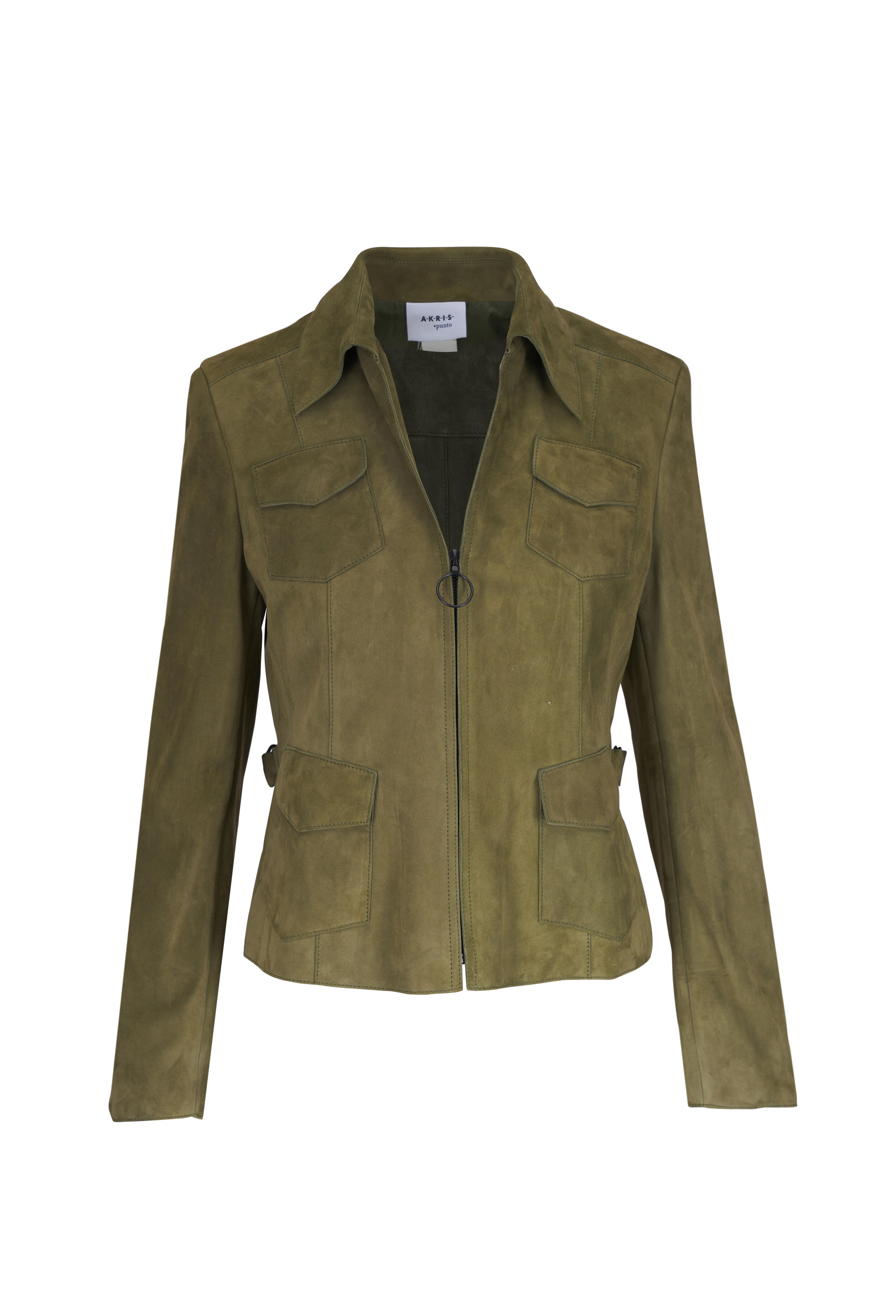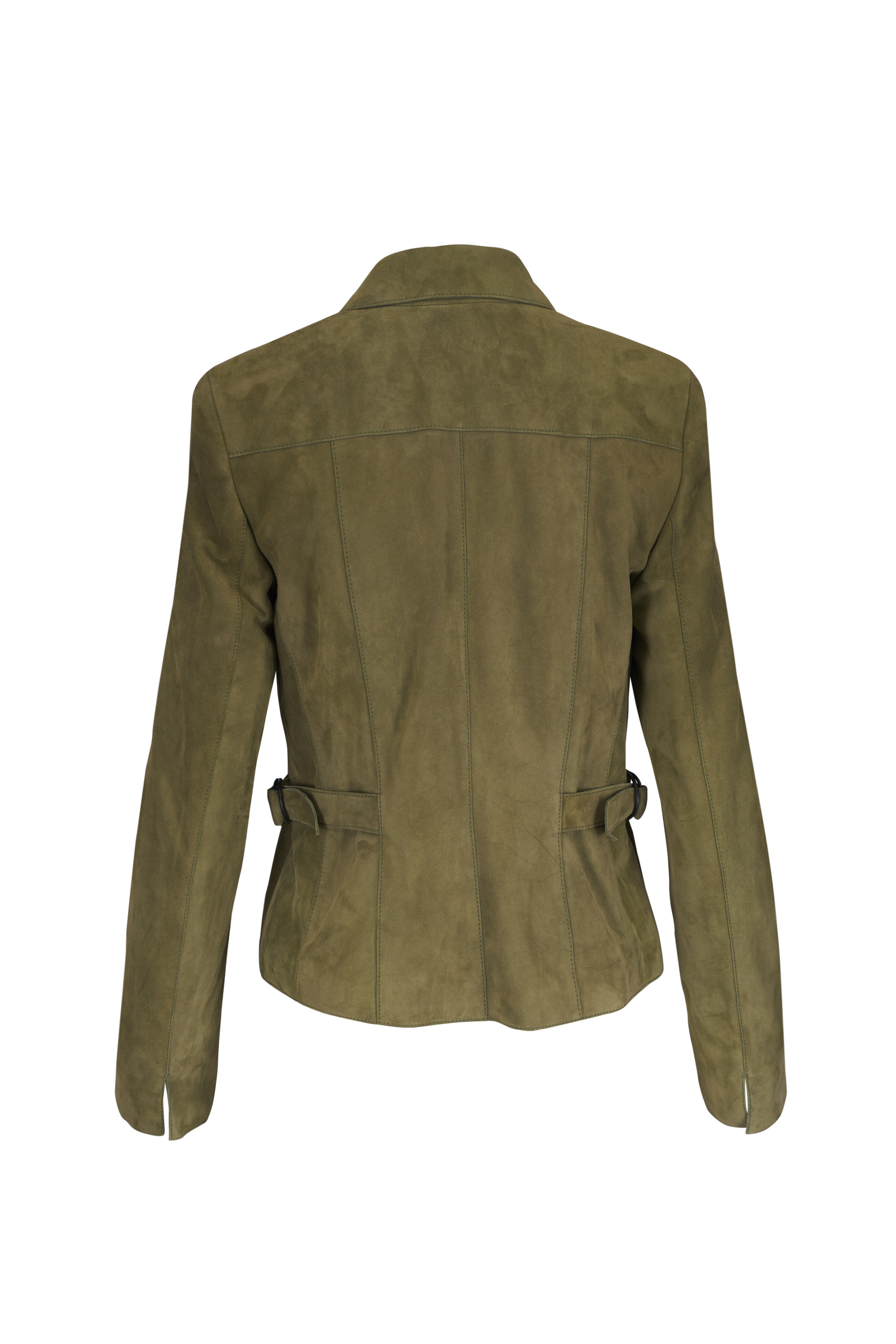 Specialist clean. Pointed collar. Front zip placket. Four front flap pockets. Adjustable D-ring waist tabs. Vented cuffs. Straight hem. Imported. Shoulder to hem 22" (size 6). 100% Goat suede; fully lined.