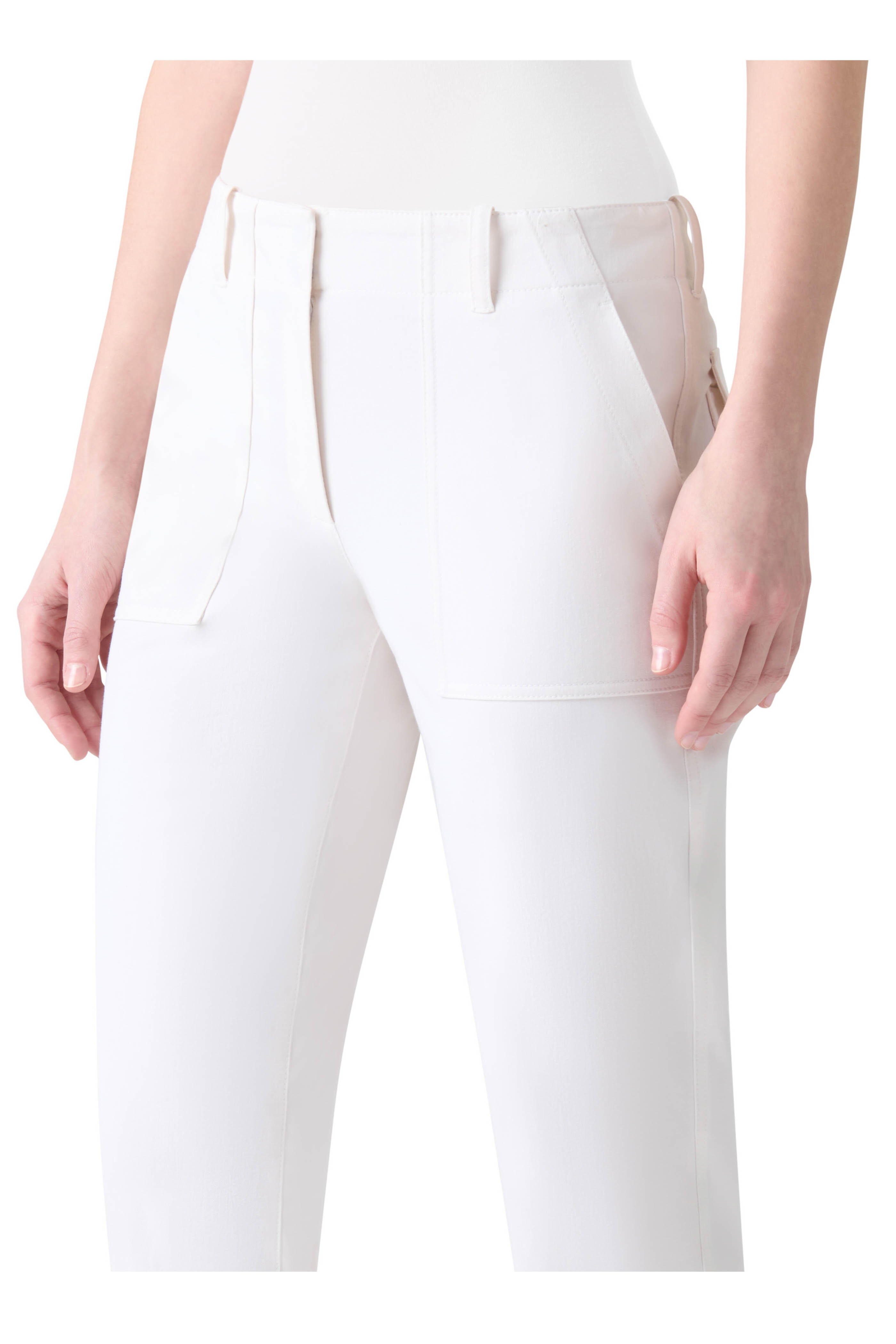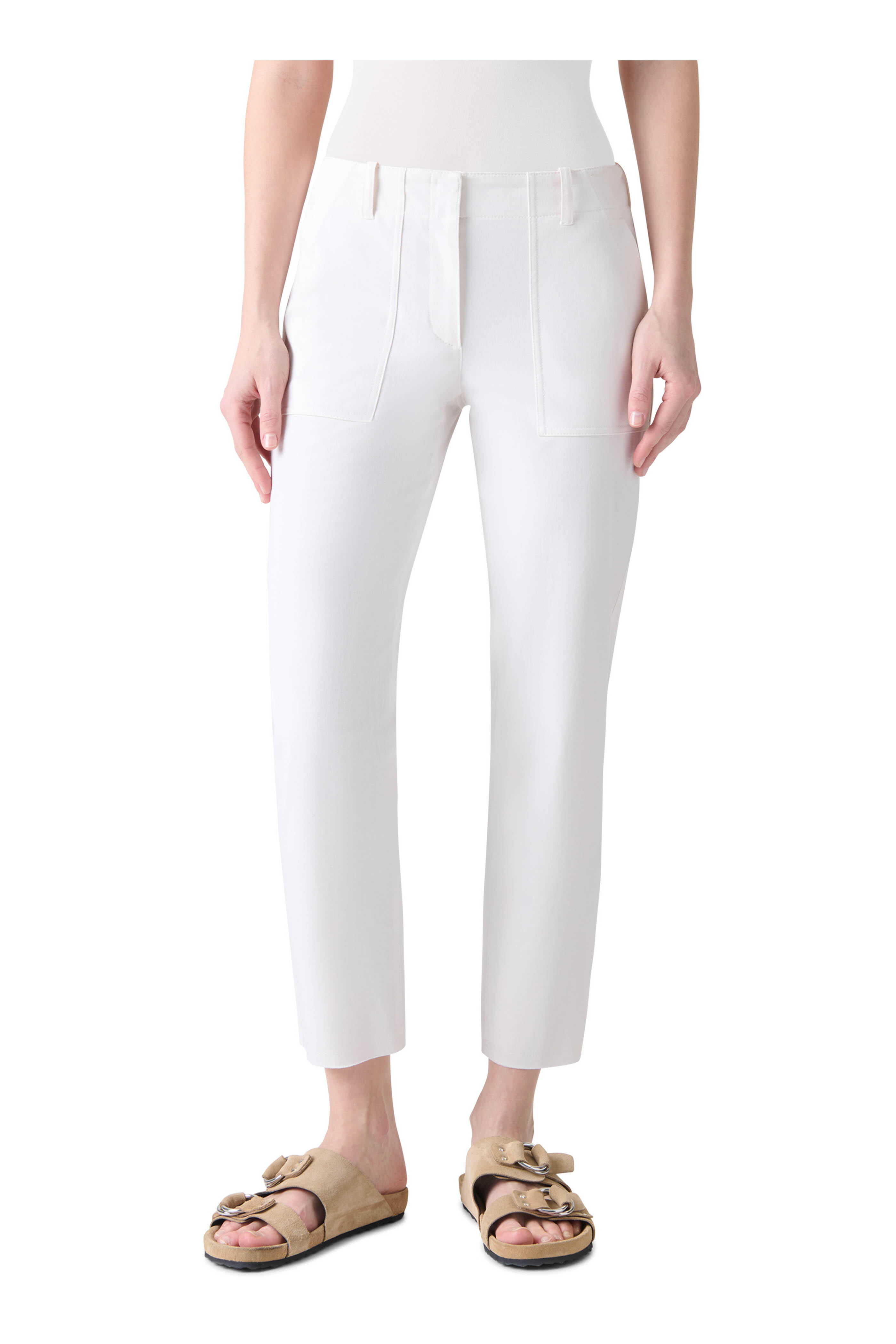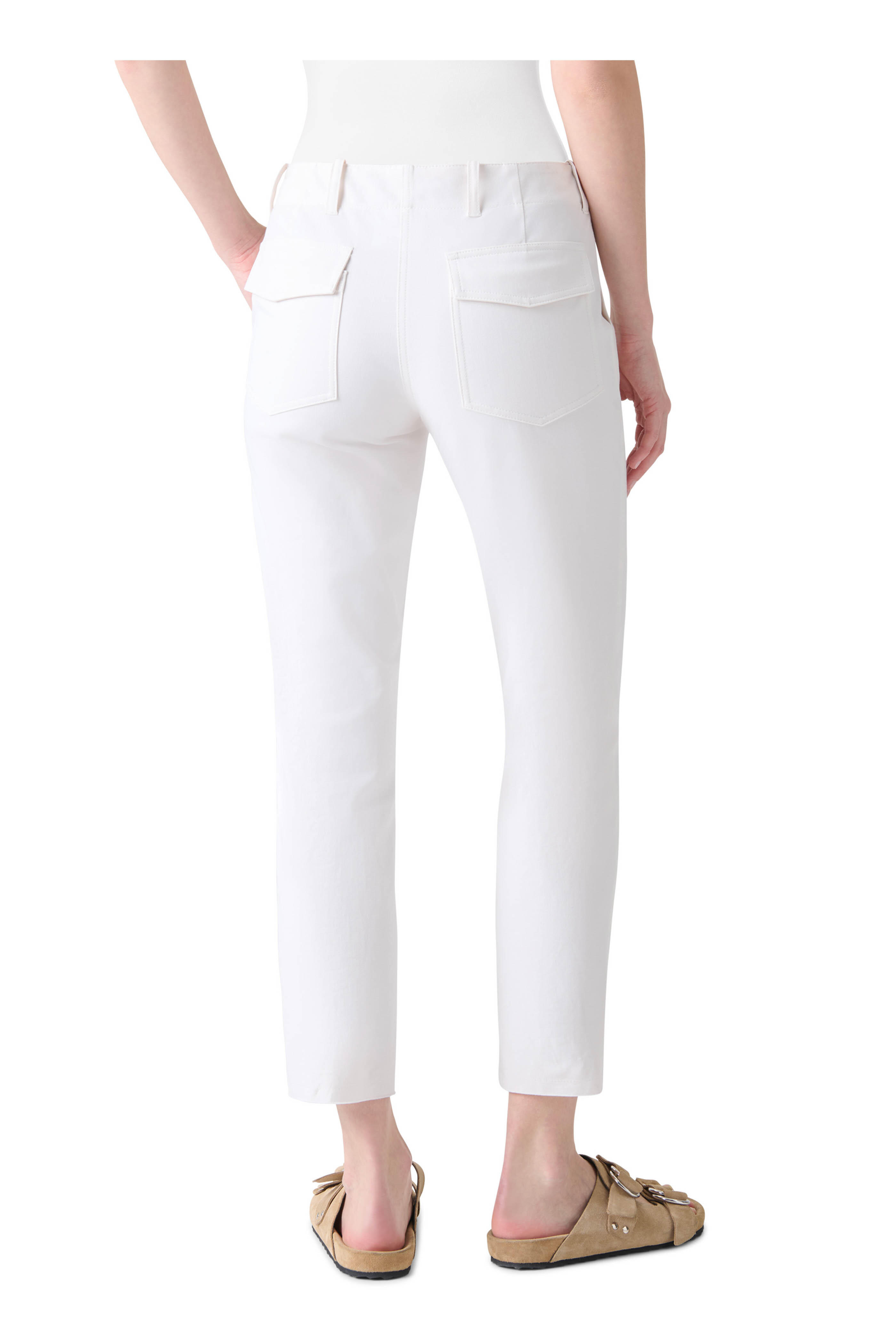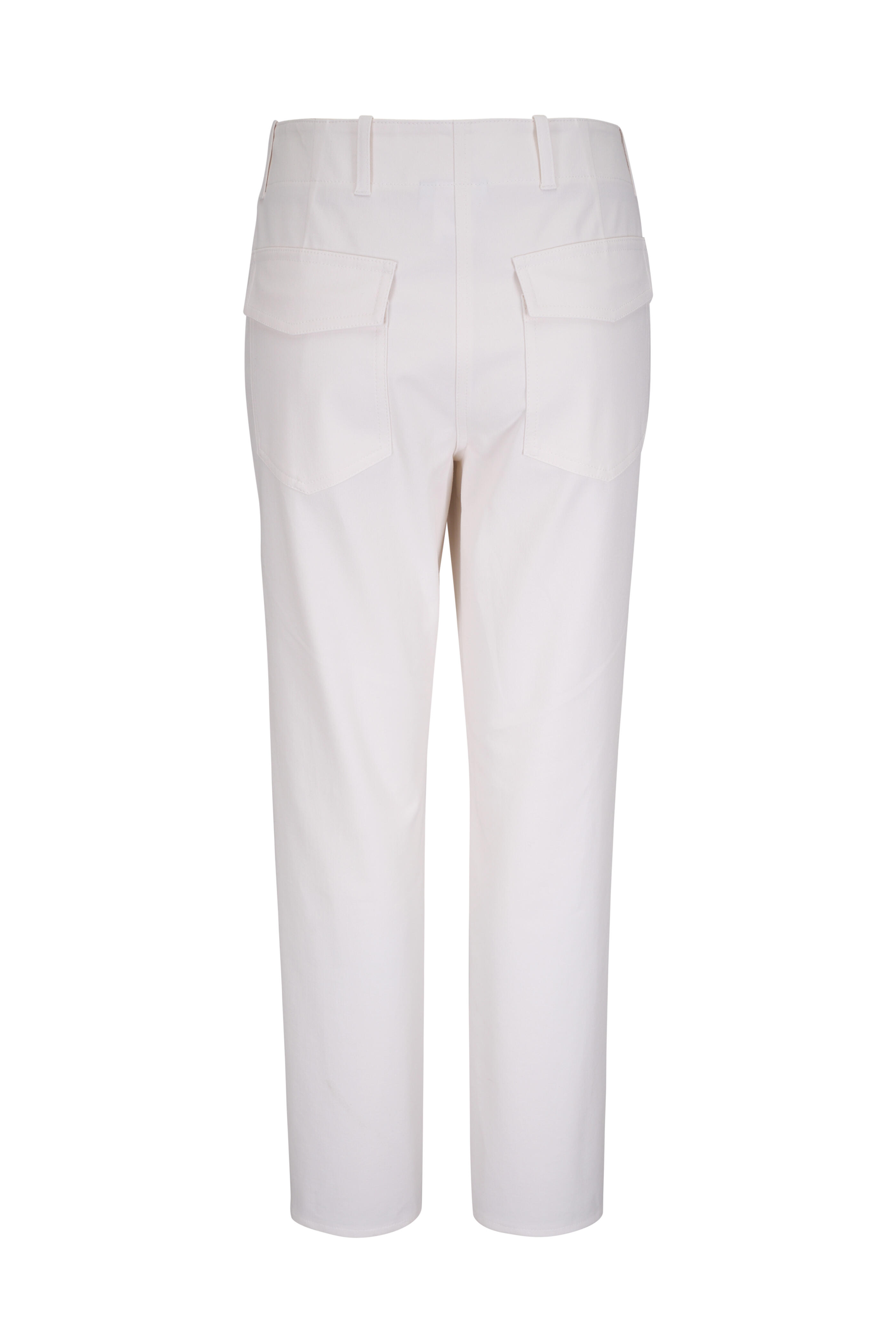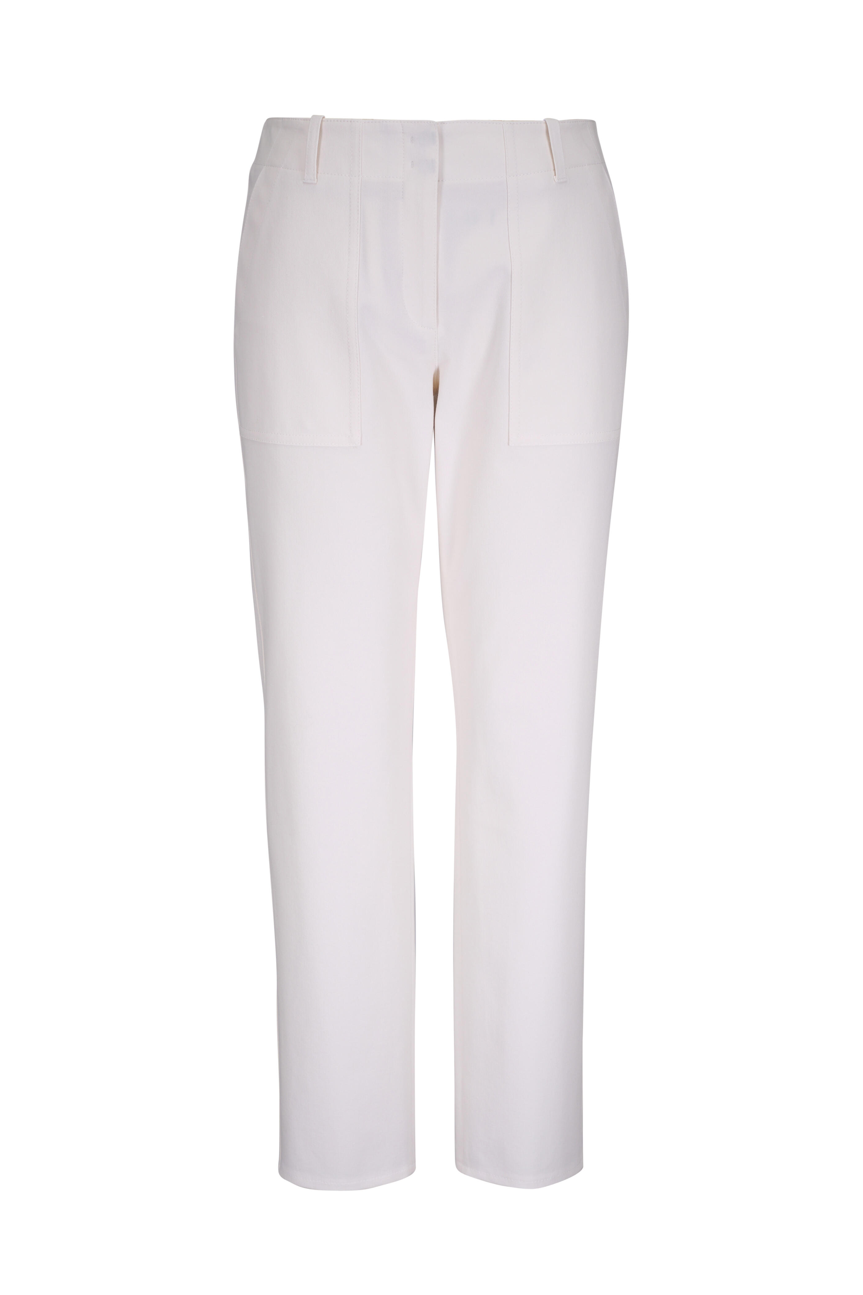 Zip fly; hook-and-bar closure. Banded waist; belt loops. Side slip pockets; back flap pockets. Straight hem. Imported. 27" Inseam (size 4). 95% linen, 5% elastane; unlined. Dry clean.