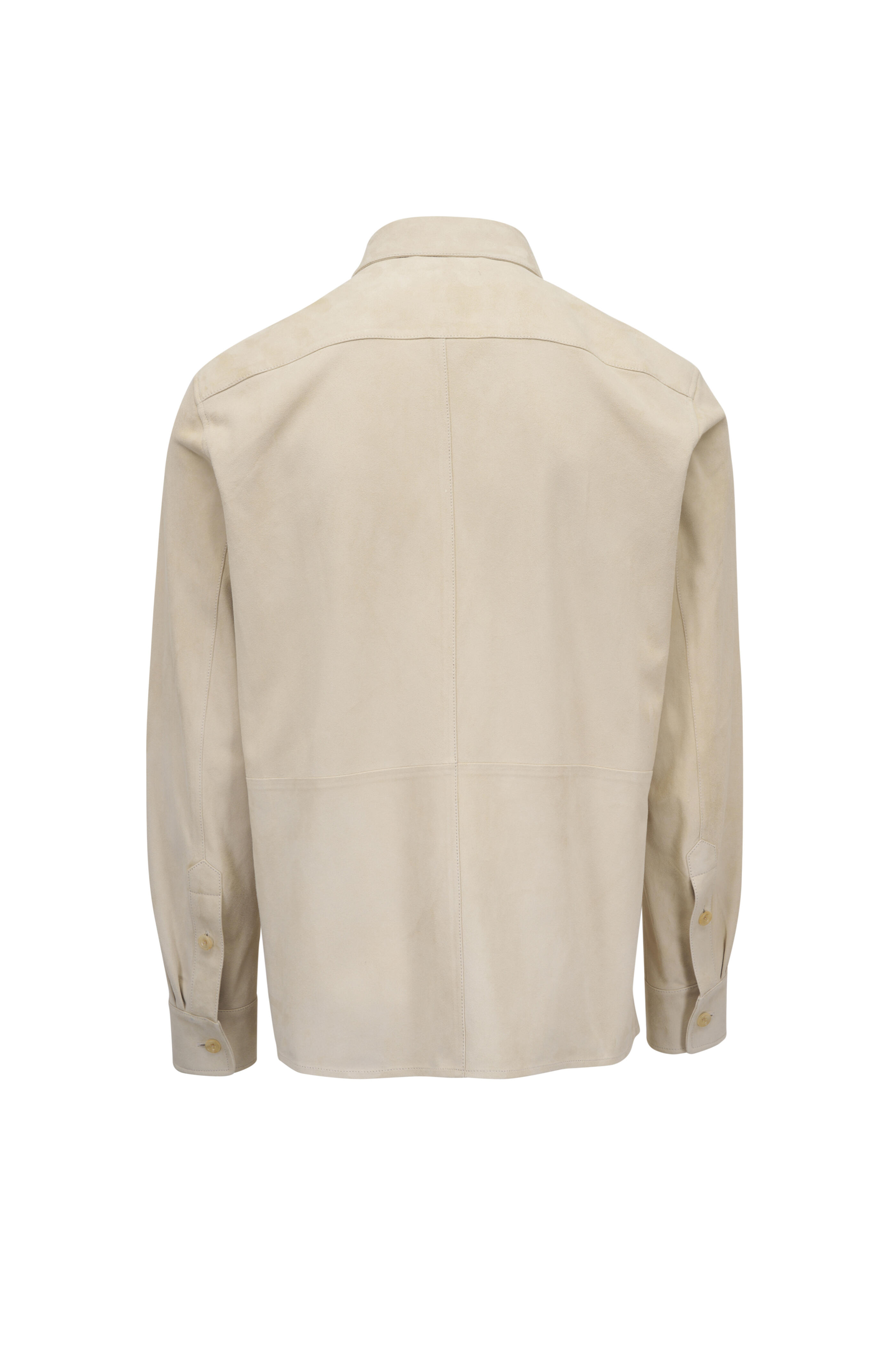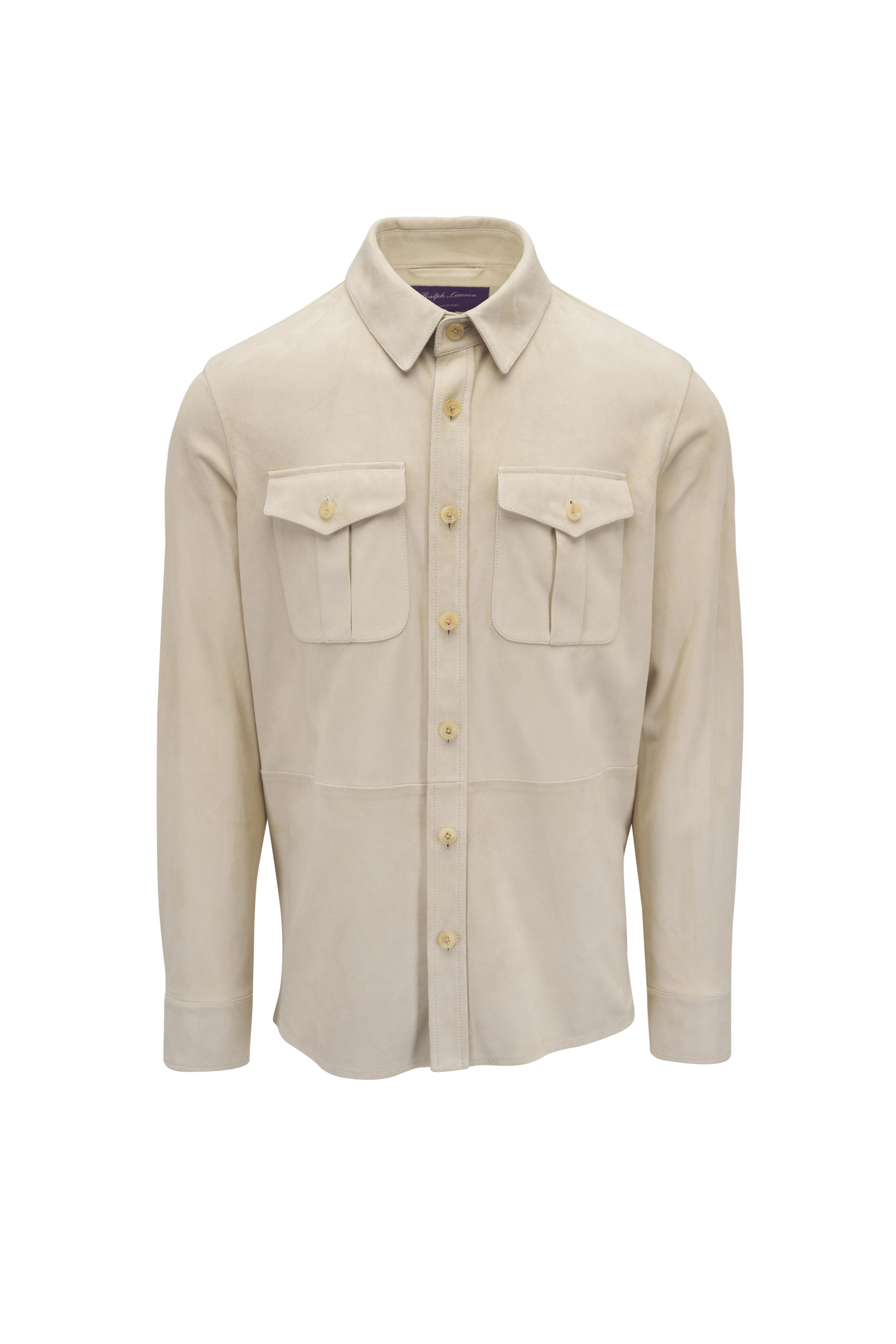 Specialist clean. Spread collar. Front button placket. Single button square cuff. Chest buttoned flap pockets. Straight hem. Made in Italy. Shoulder to hem 29" (size L). 100% lamb suede.