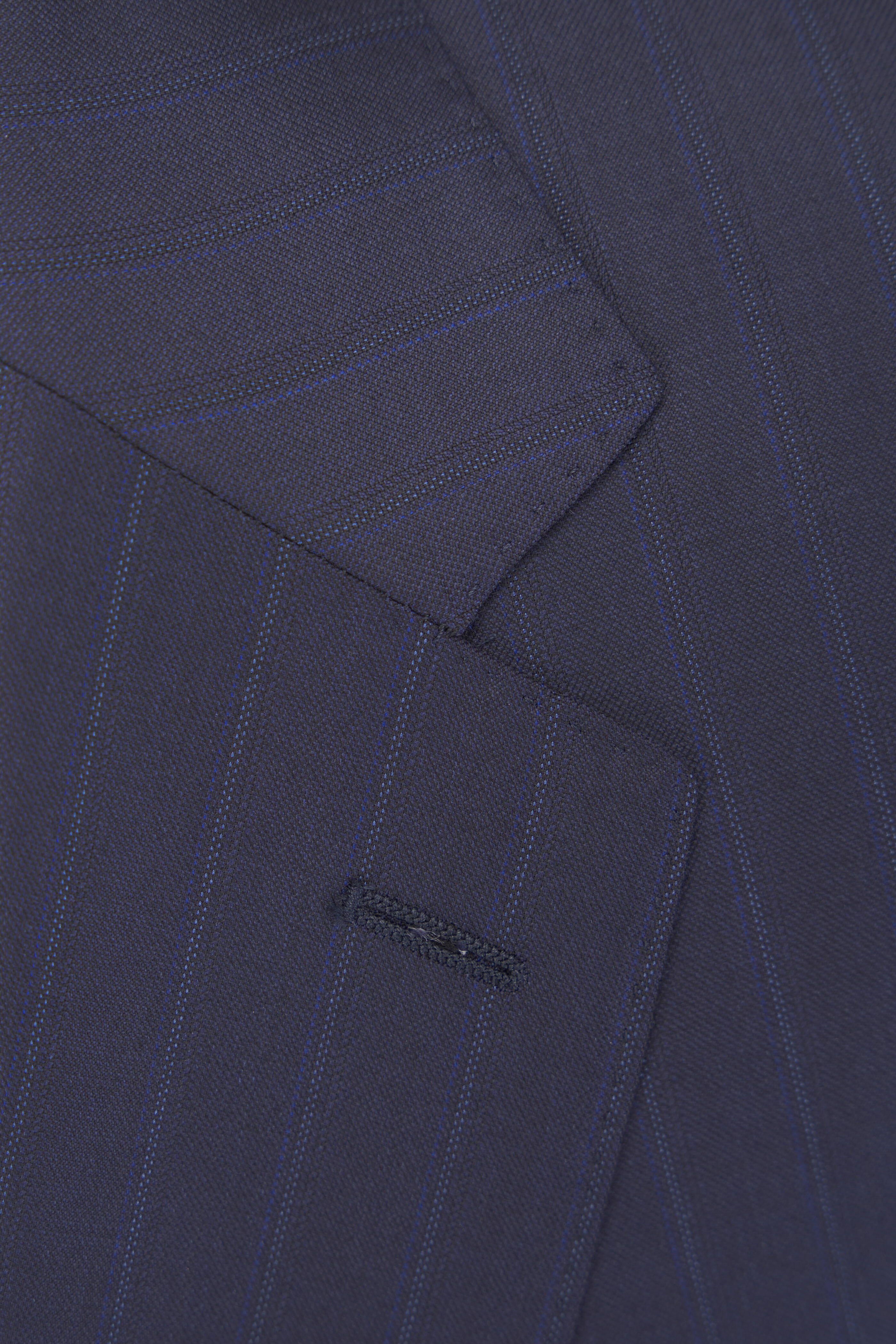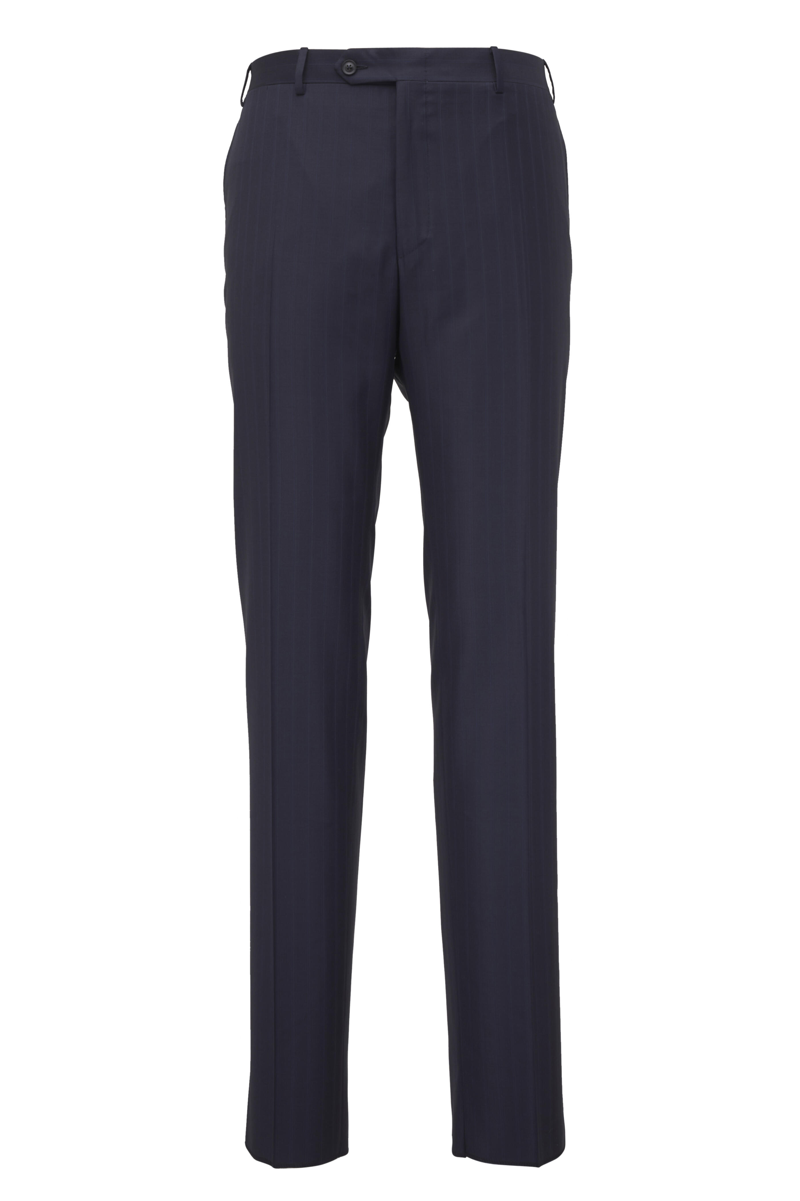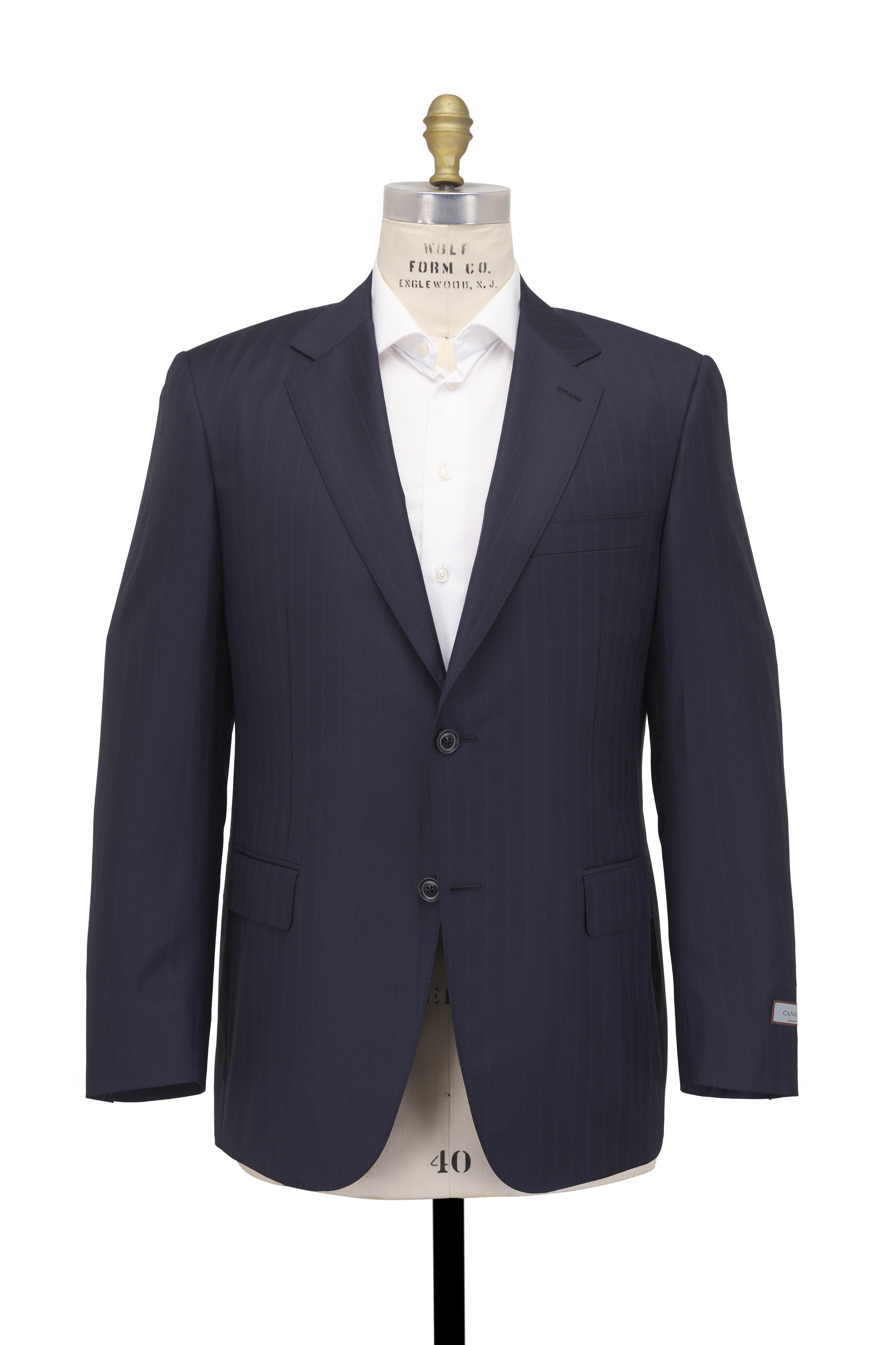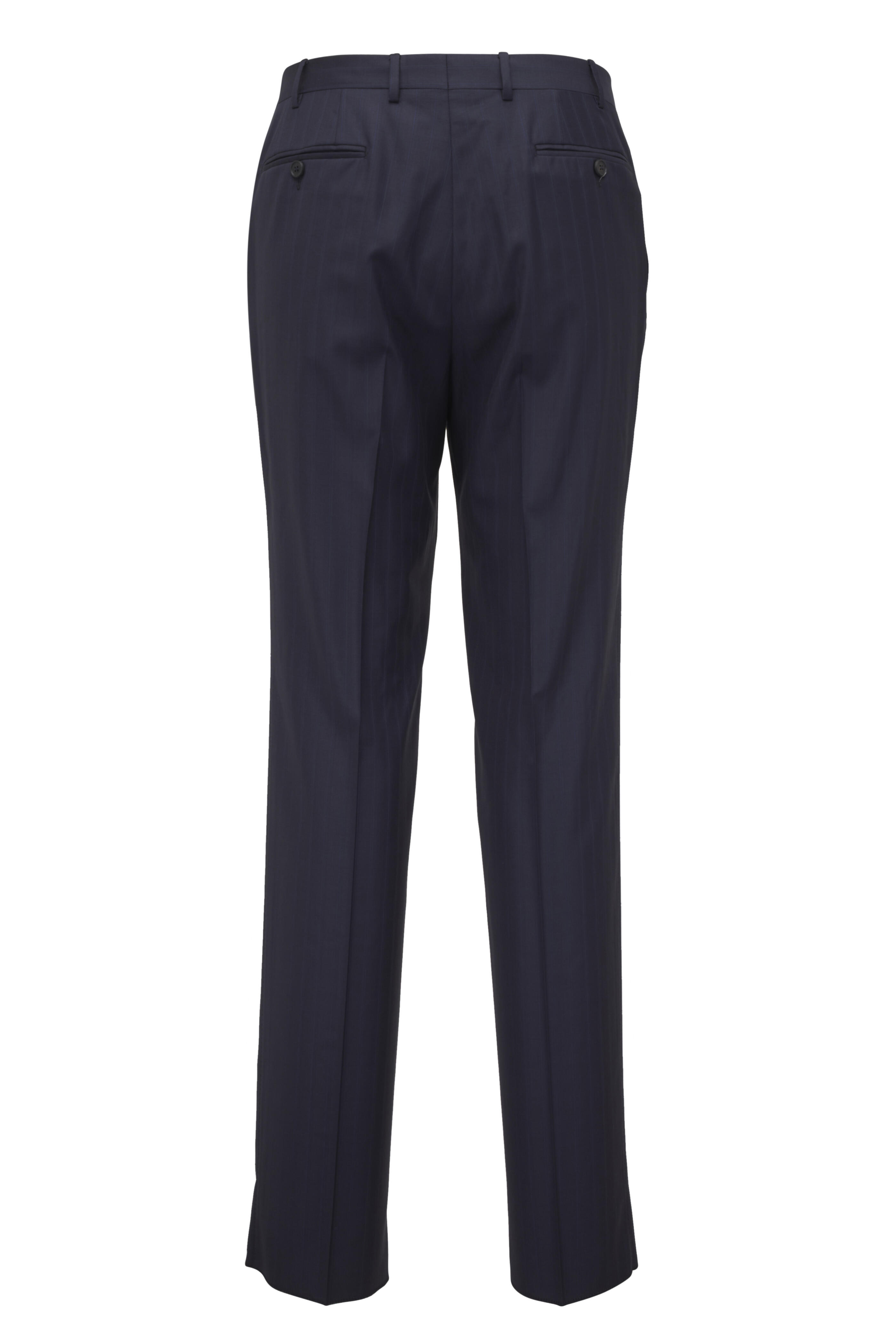 Made in Italy. Jacket: Fully lined. Notched lapels. Front two button closure. Chest welt pocket; lower flap pockets; interior slip pockets. No buttons attached. Double vent. Pant: Banded waist; belt loops. Front slip pockets; back besom pockets. Unfinished hem. 100% wool. Dry clean.