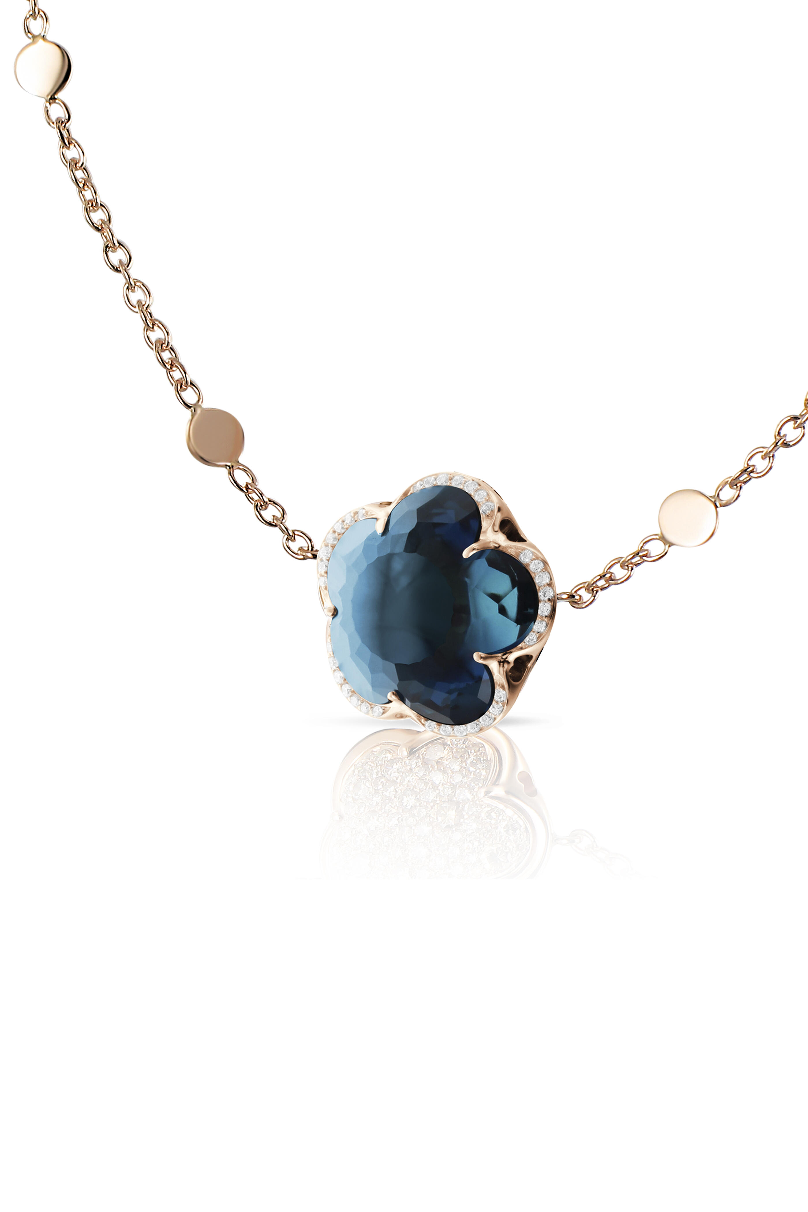 18k Rose Gold. London Blue Topaz. 0.09 ct White Diamond. 14 mm.