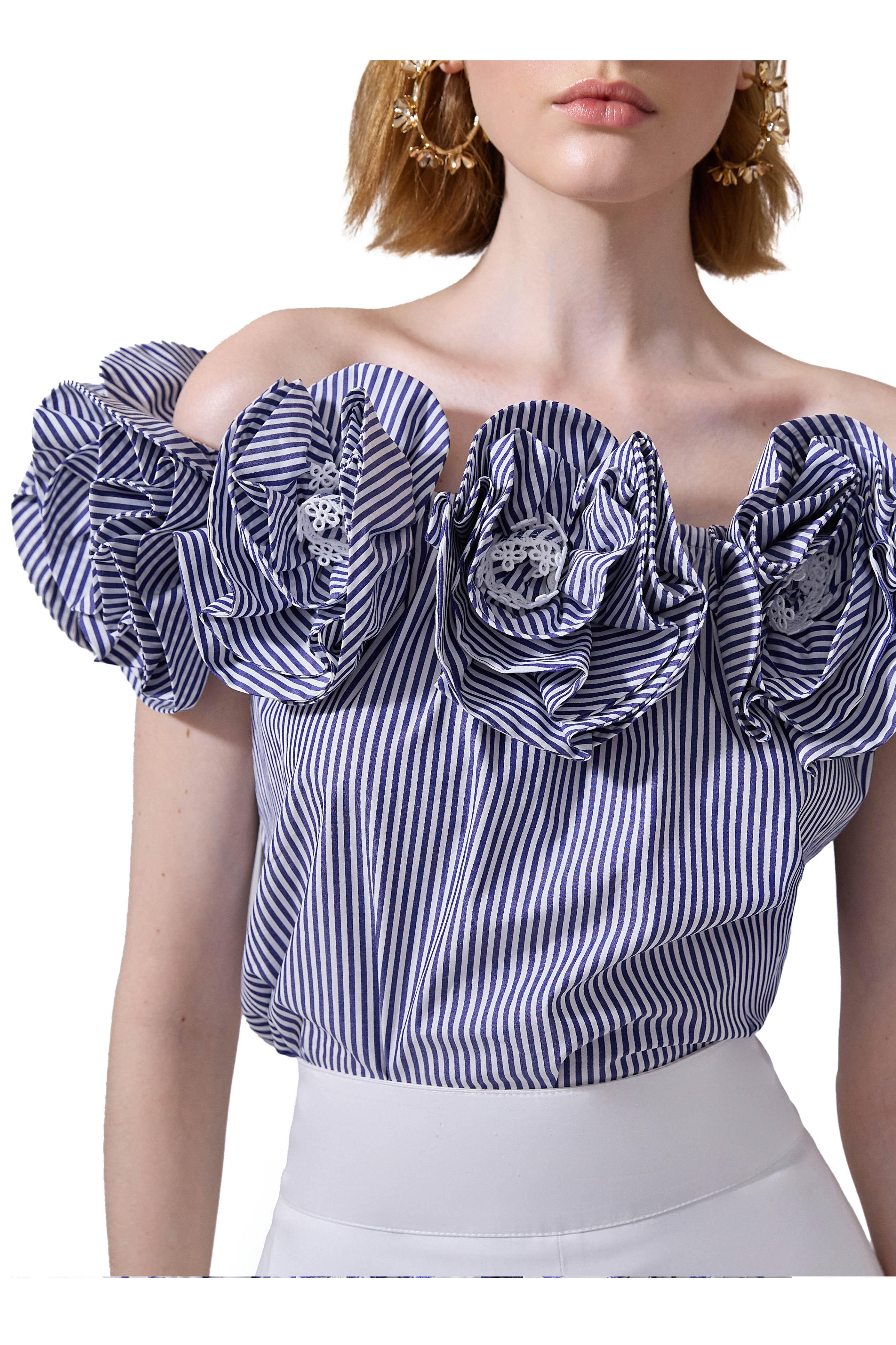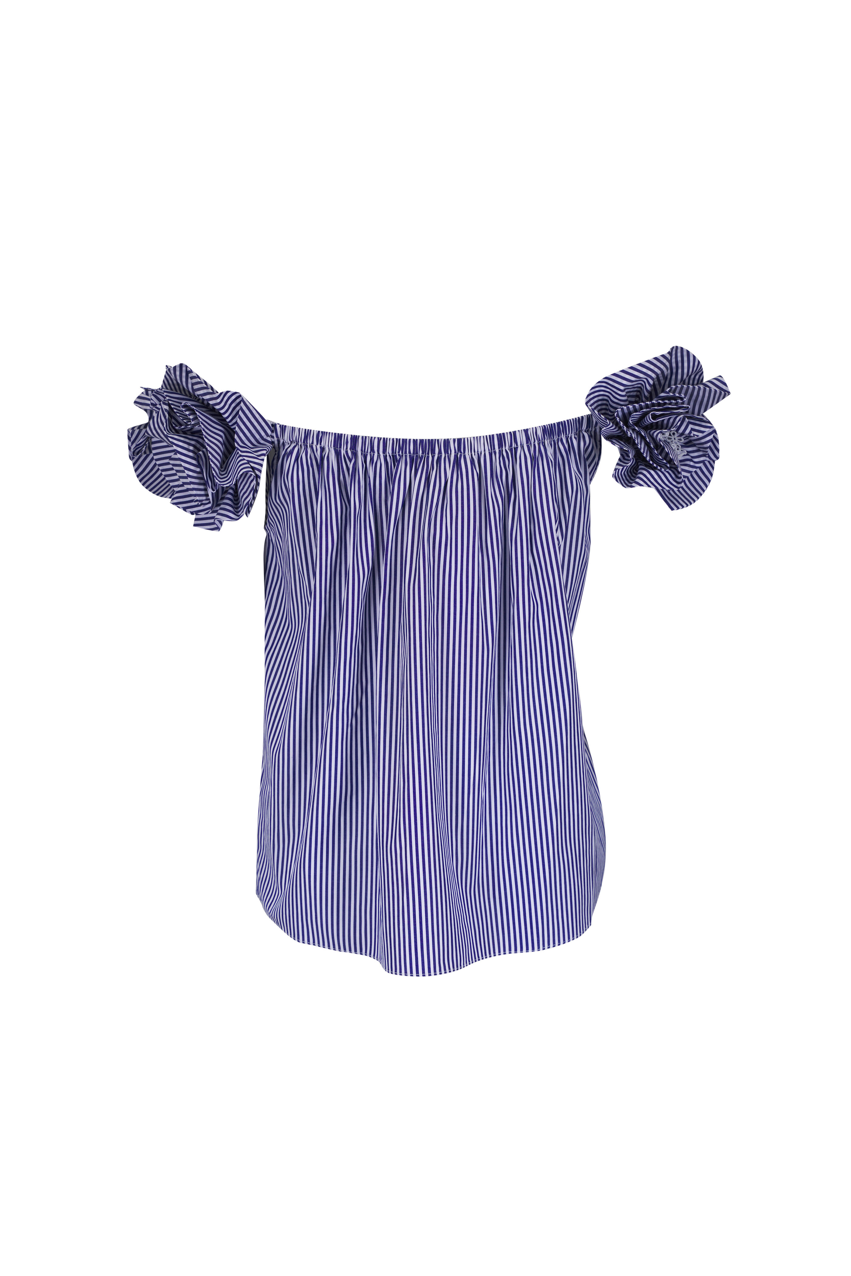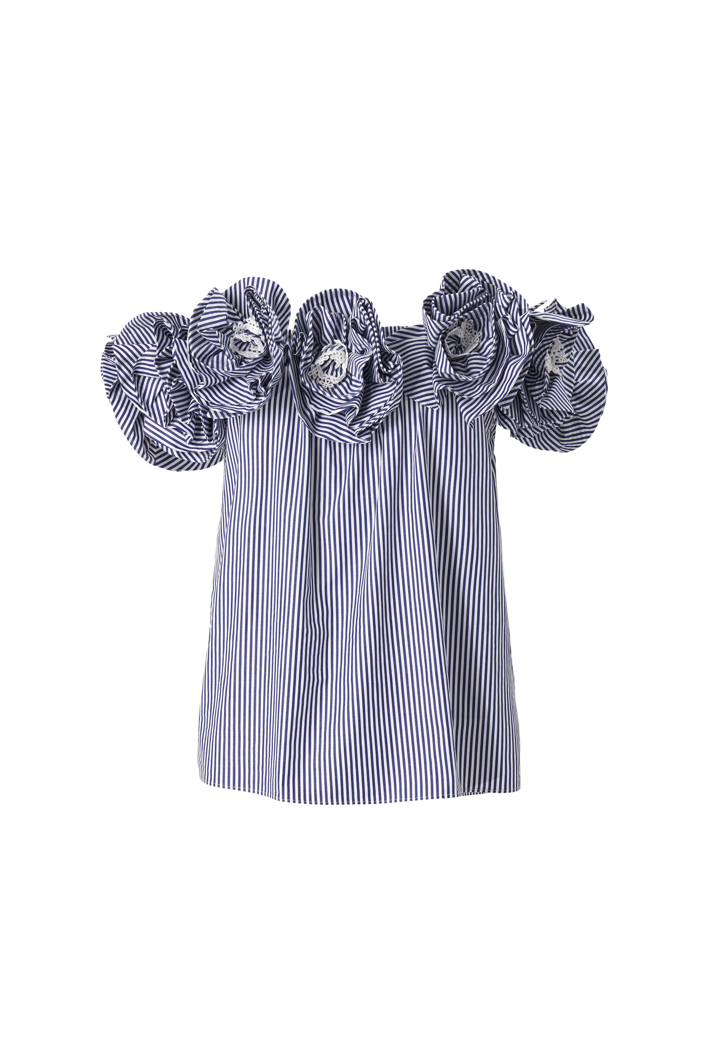 Elasticized off-the-shoulder neckline. Rosette ruffles. Imported. 100% cotton. Dry clean.