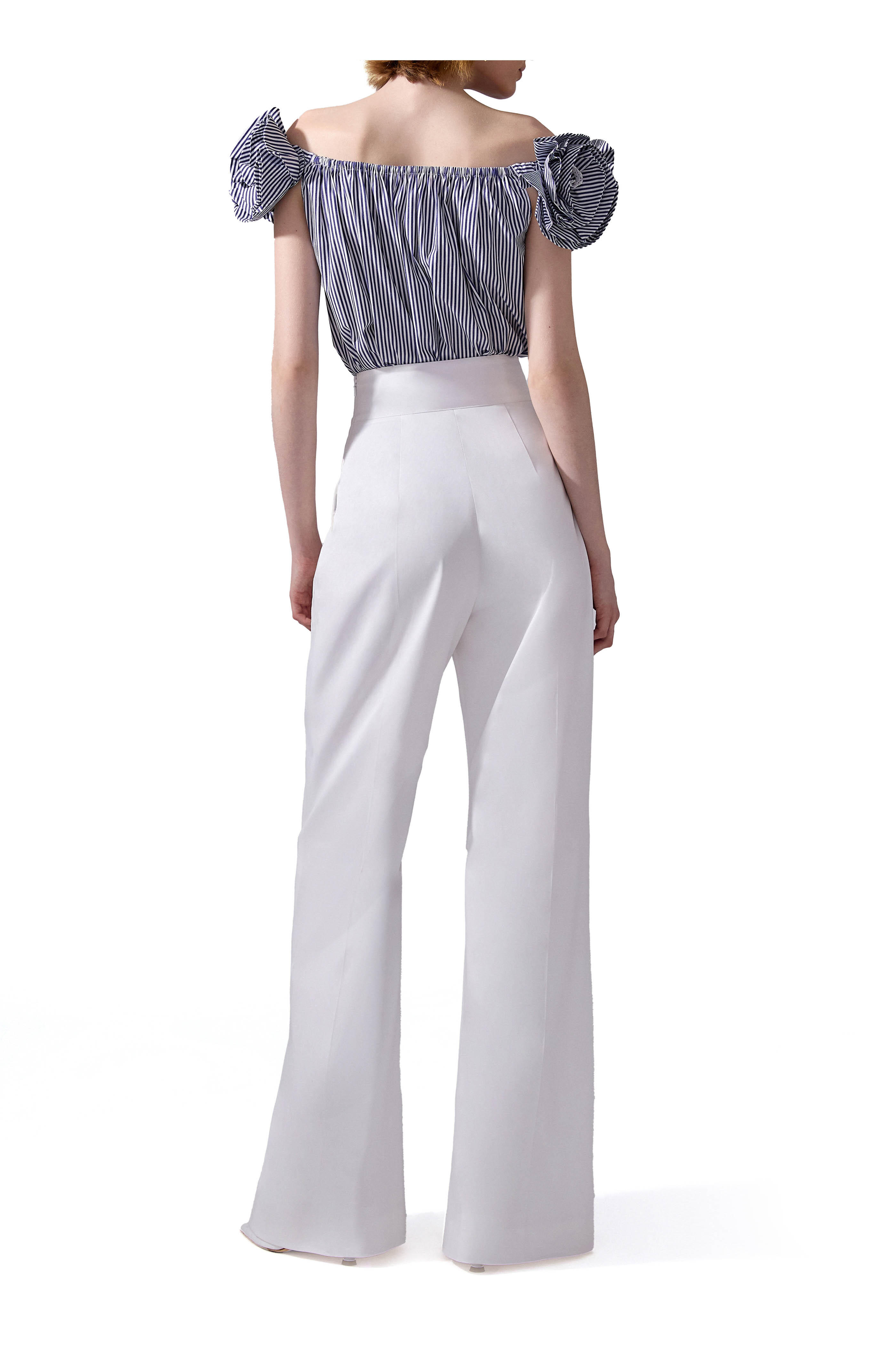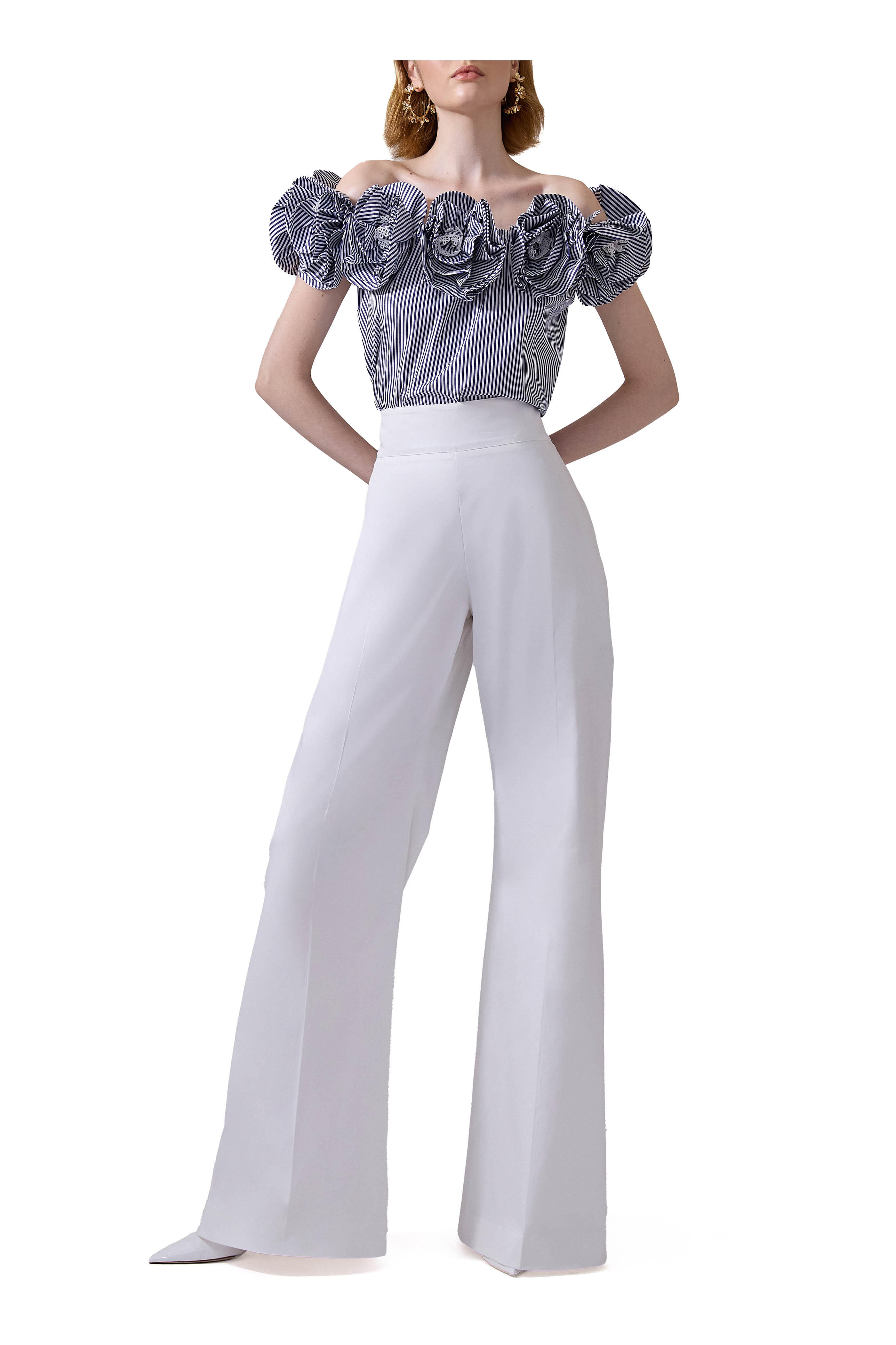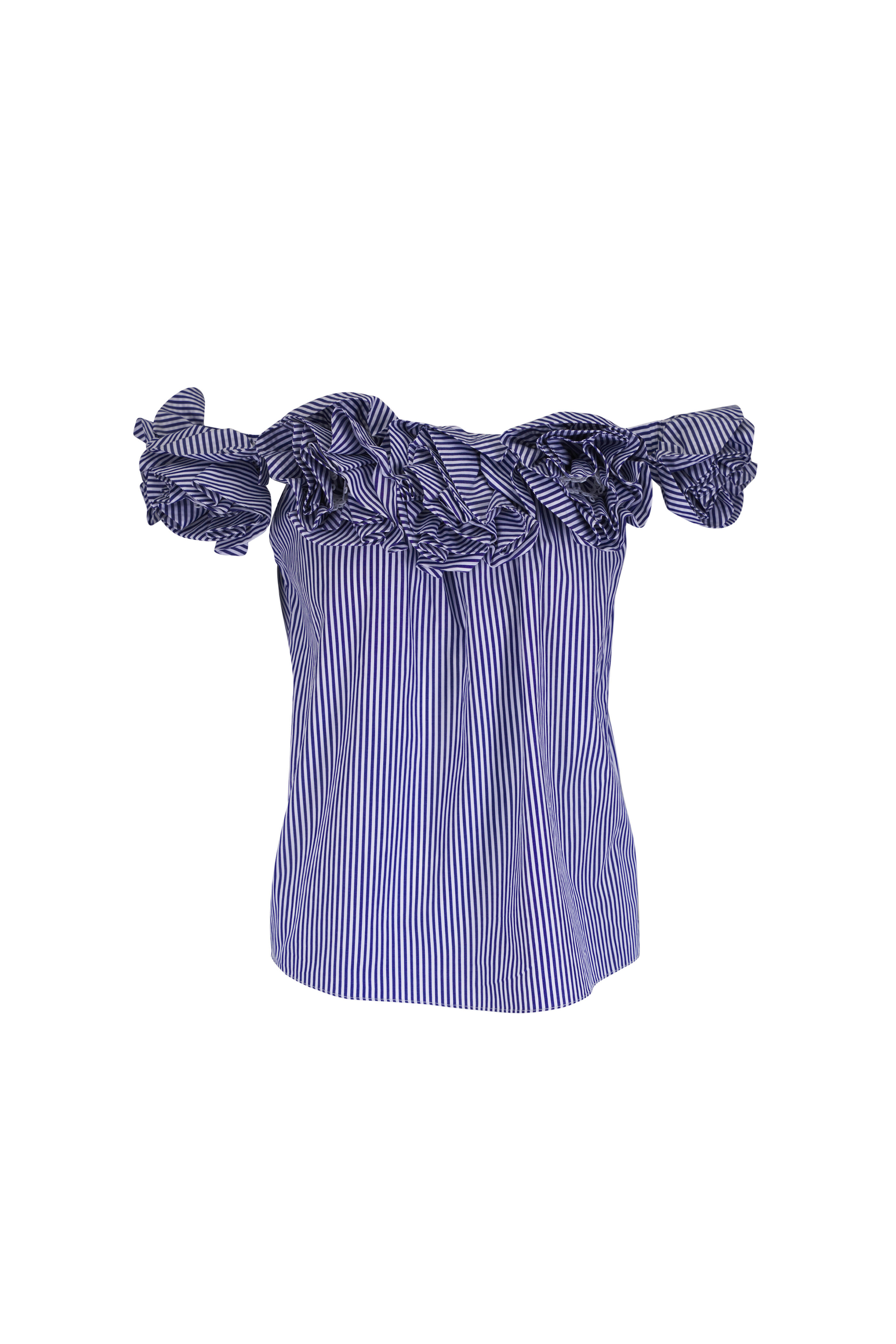 Elasticized off-the-shoulder neckline. Rosette ruffles. Imported. 100% cotton. Dry clean.