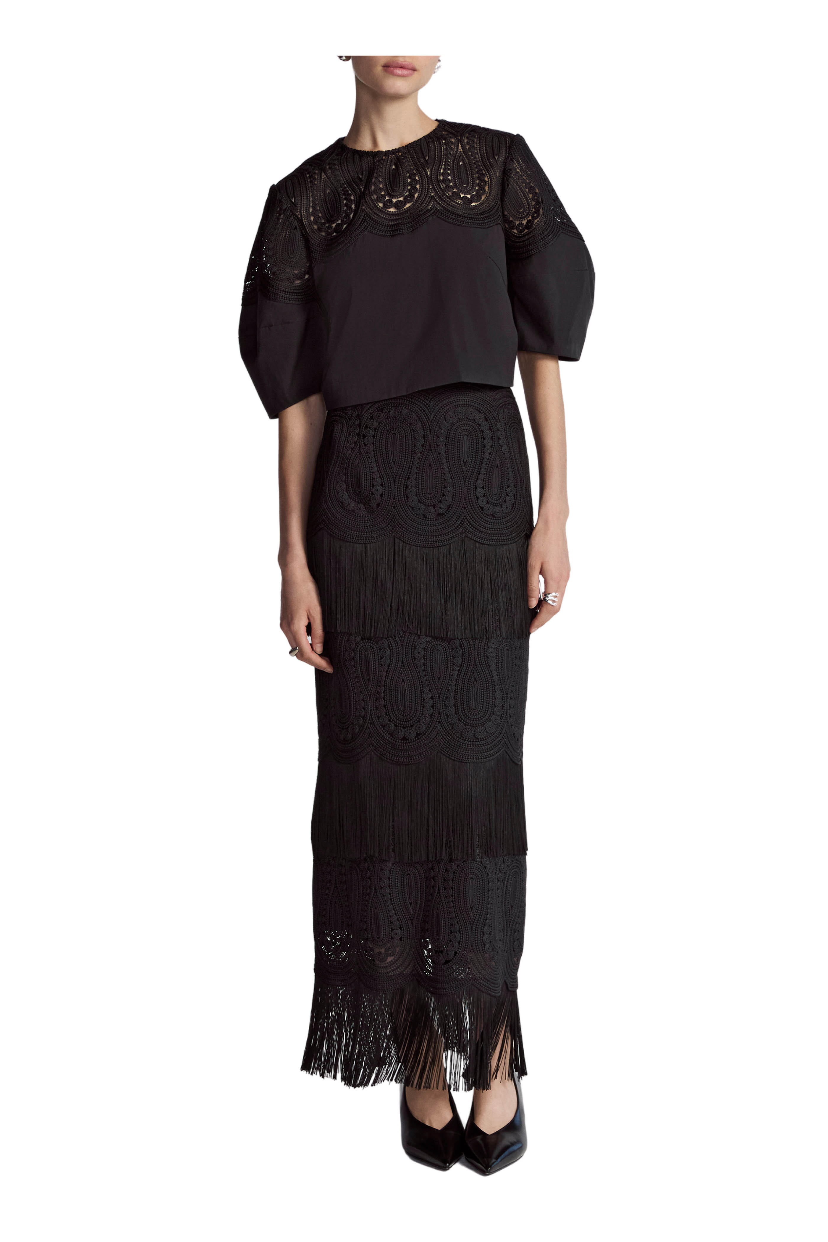 Round neckline. Keyhole back & concealed zip closure. Made in USA. About 16" long. 78% cotton, 18% polyester, 4% elastane. Dry clean.