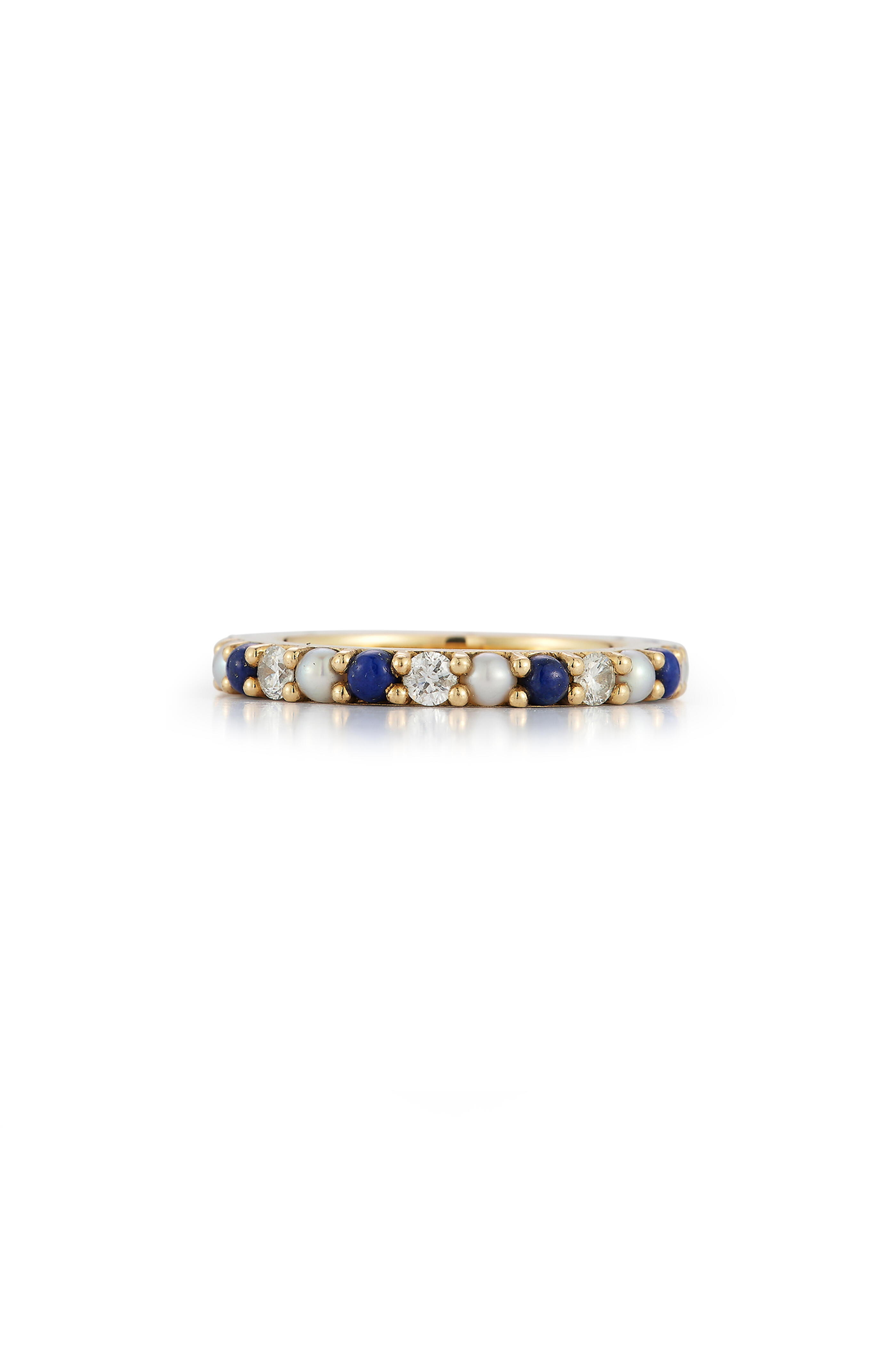14k gold. Diamond. Pearl. Lapis. Band style. Prong setting. Imported. Call for ring size.