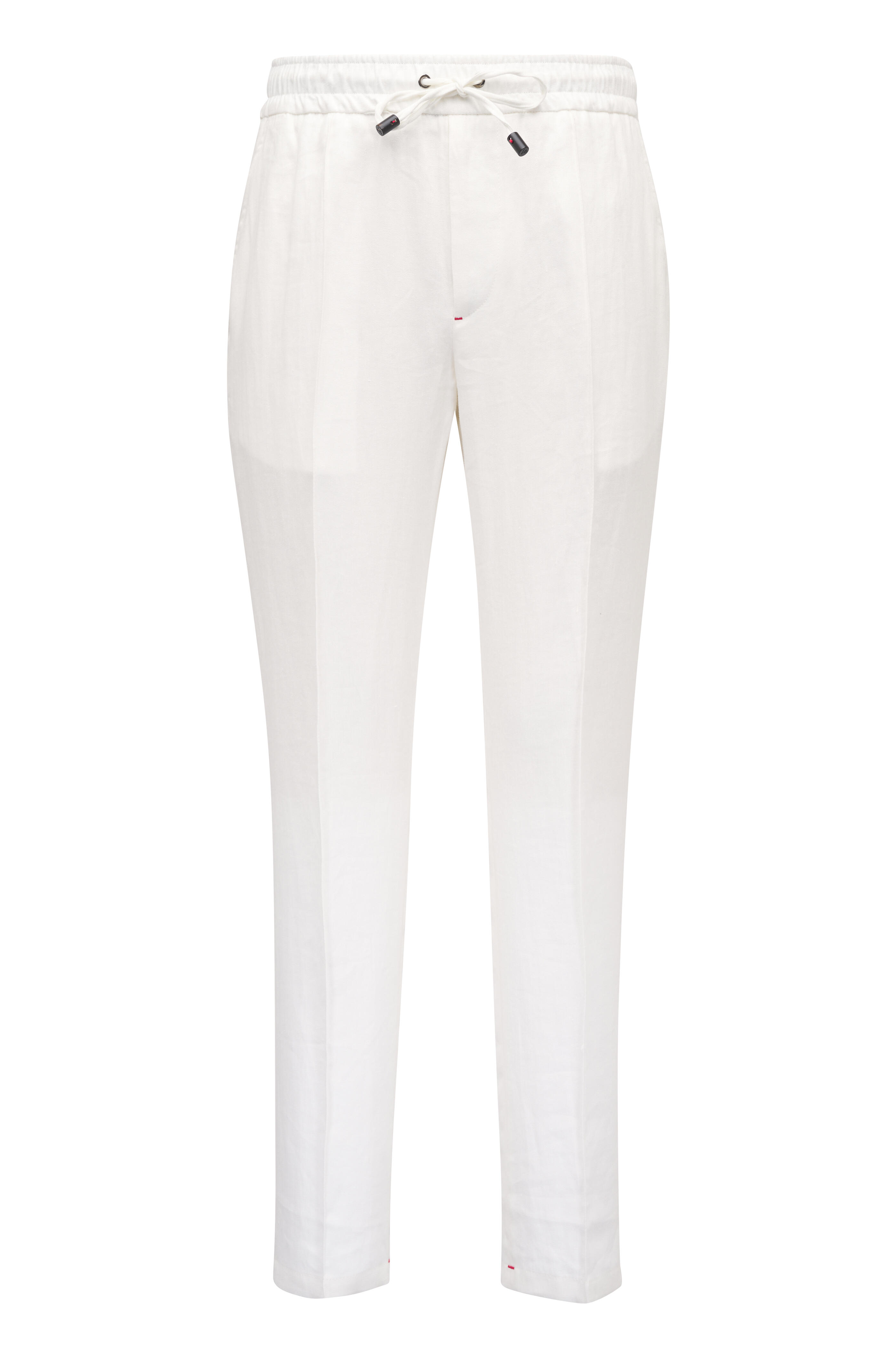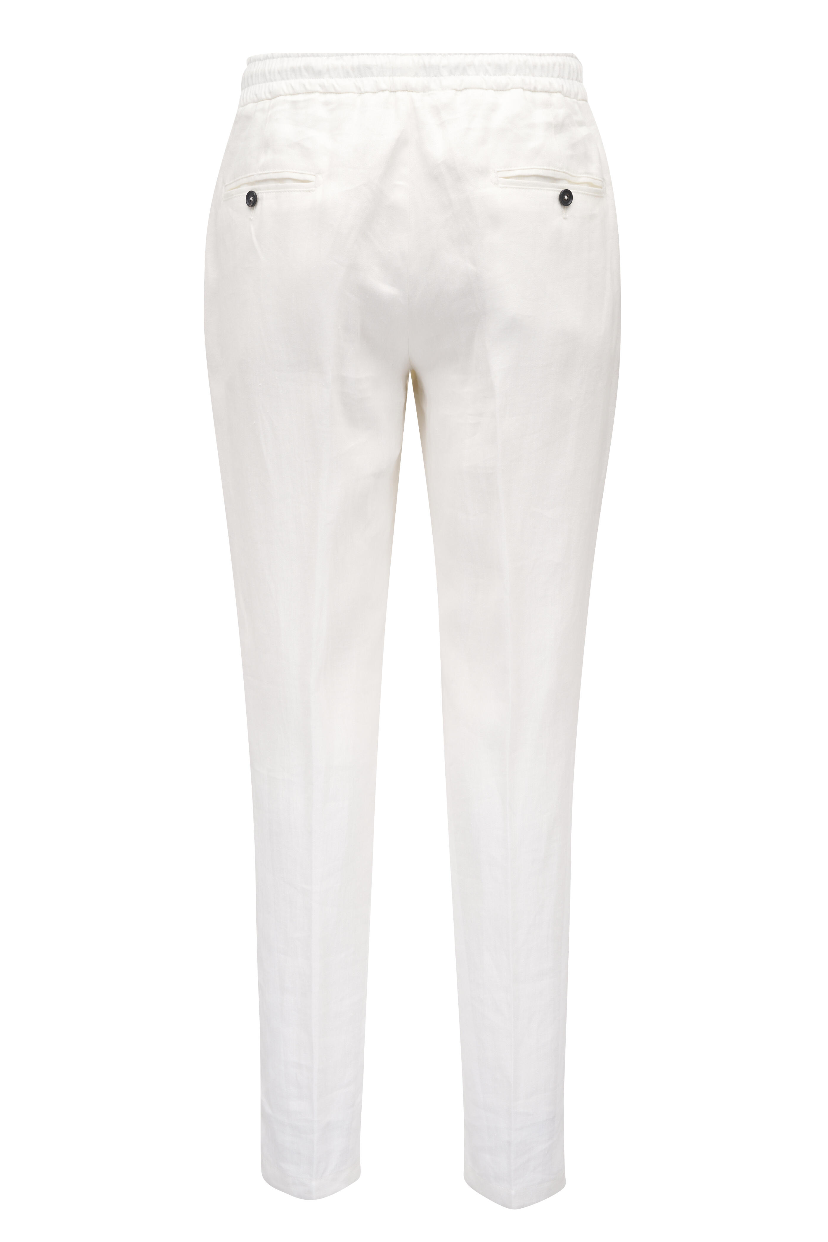 Pull-on style; elasticized drawstring waistband. Side slash pockets; welt back pockets. Made in Italy. 32" Inseam ( size 36). 100% linen. Machine wash.