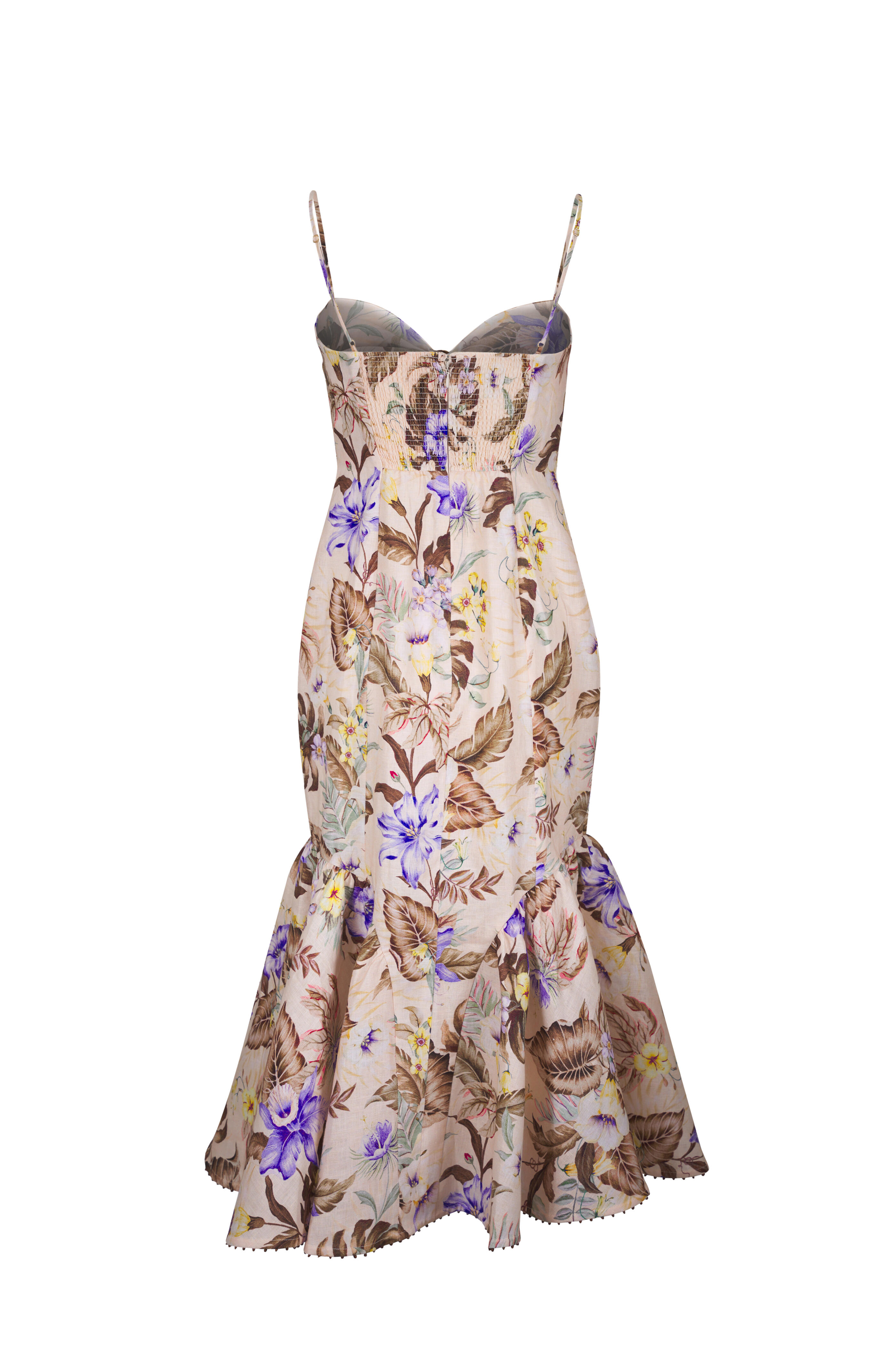 Sweetheart neckline. Concealed back zip; shirred elastic across back. Tie front bow with cut out; fitted bodice with hard boning. Adjustable straps. Wooden bead edge trim. Imported. 100% linen; bodice lining: 100% linen; lining: 100% cotton. Dry clean.