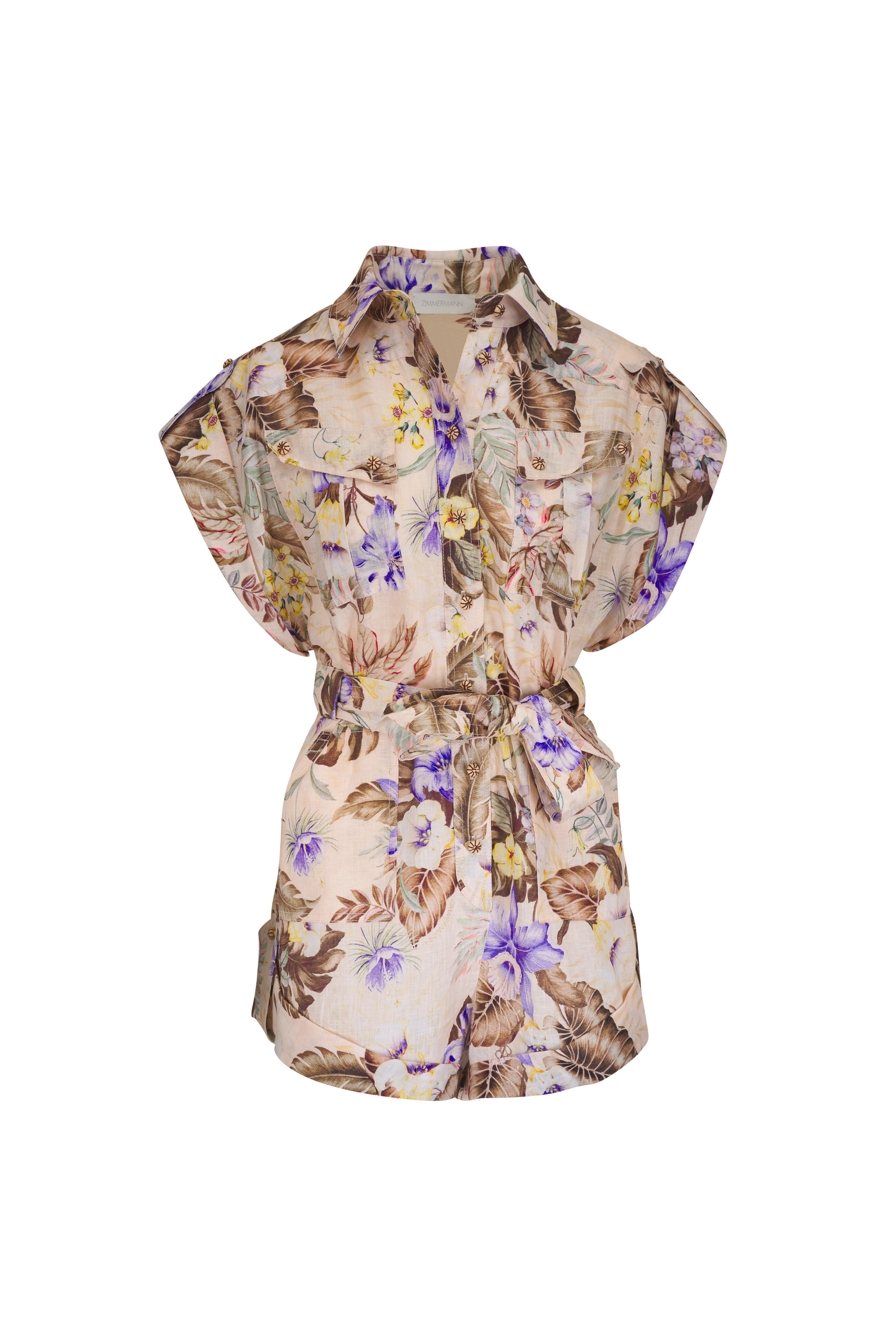 Spread collar. Front button placket. Removable self-tie belt. Folded cuffs and hem. Front slip pockets. Imported. 100% linen. Dry clean.