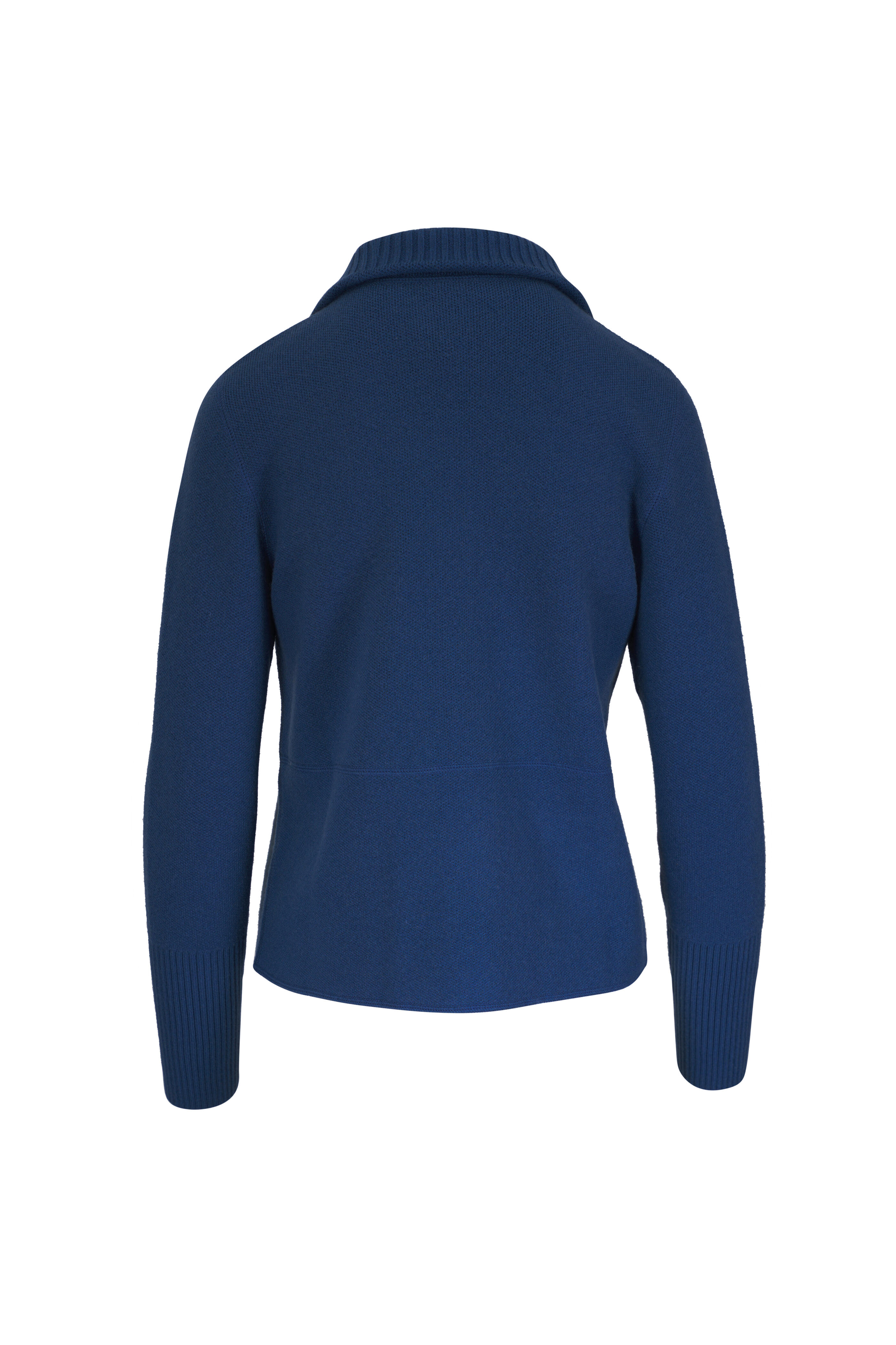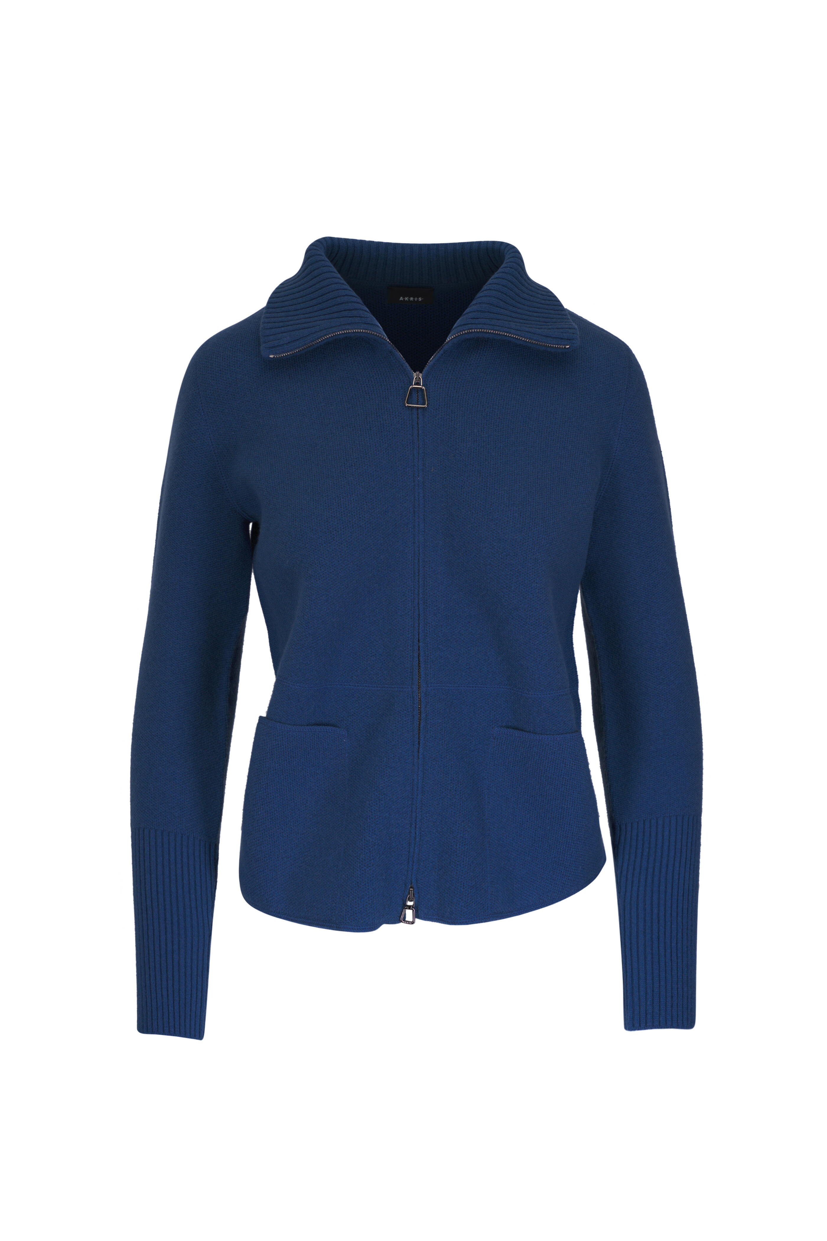 Stand collar. Two-way front zip. Lower patch pockets. Ribbed trims. Imported. 100% cashmere. Dry clean.