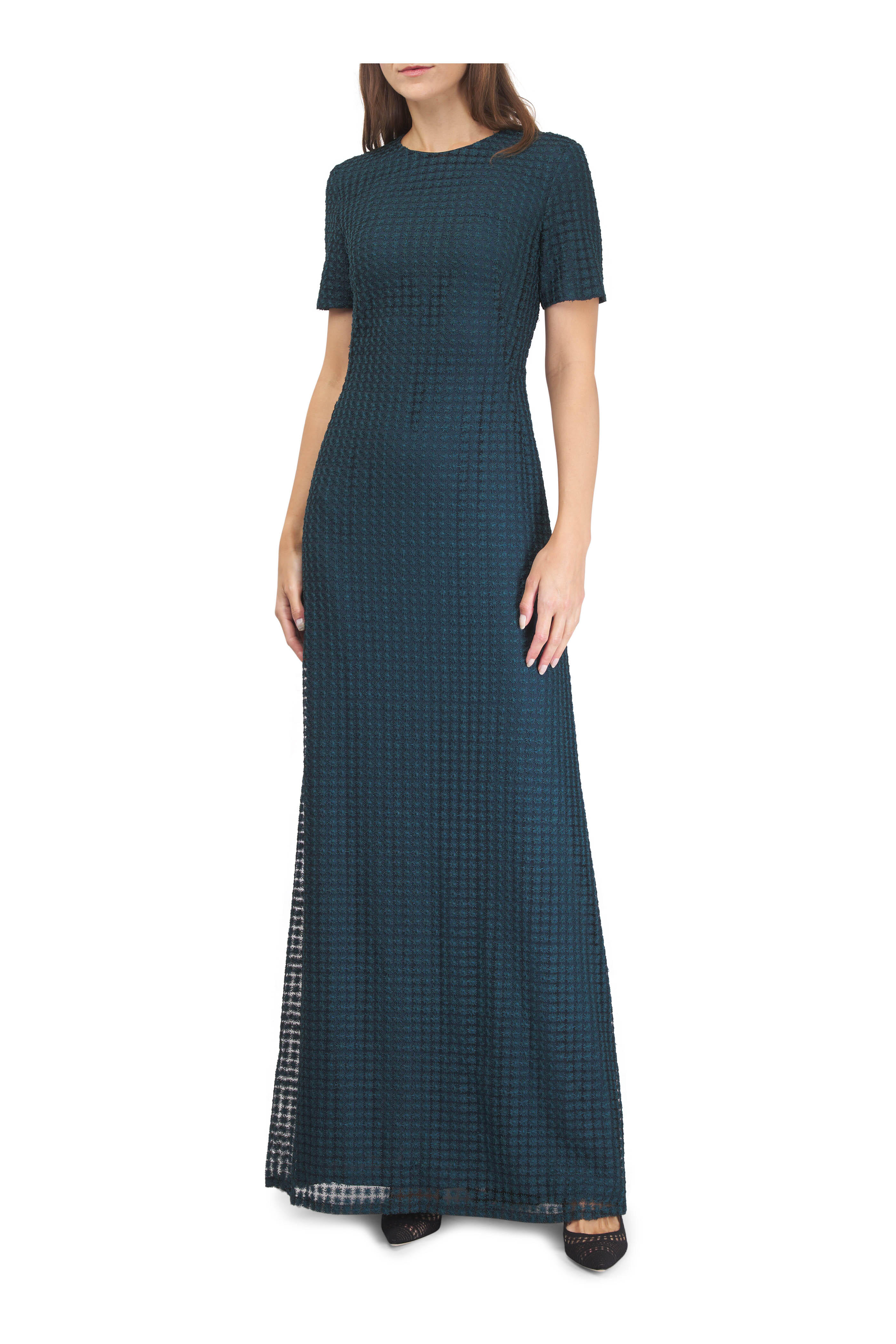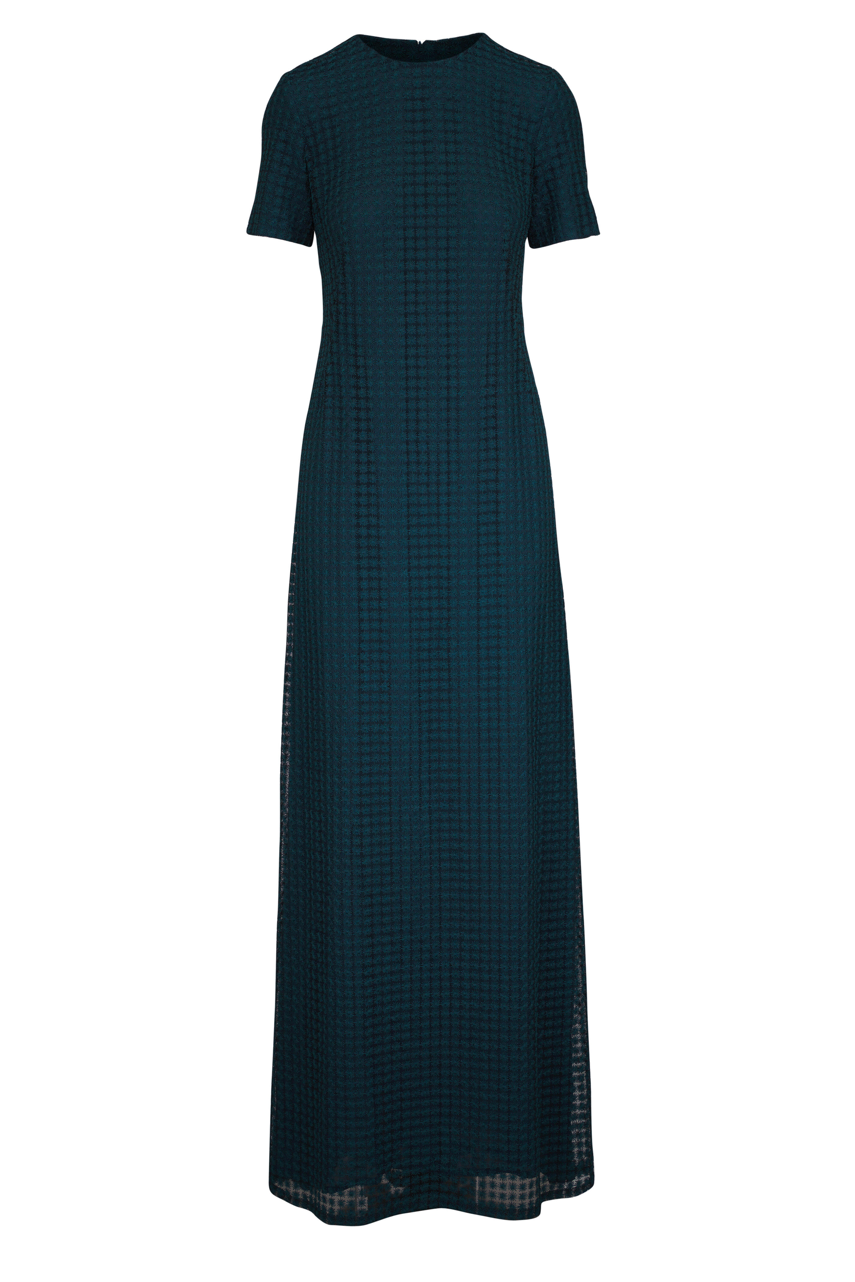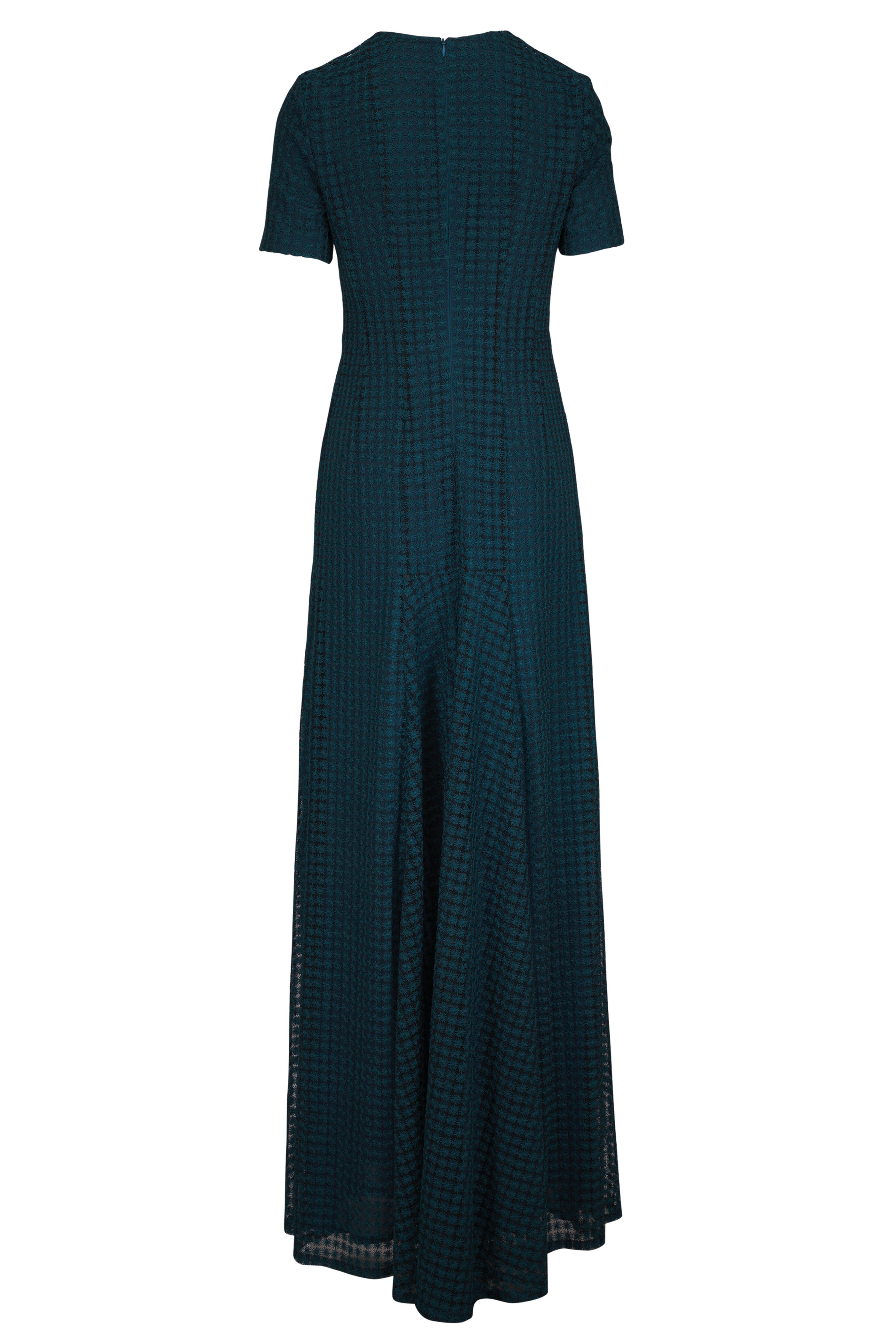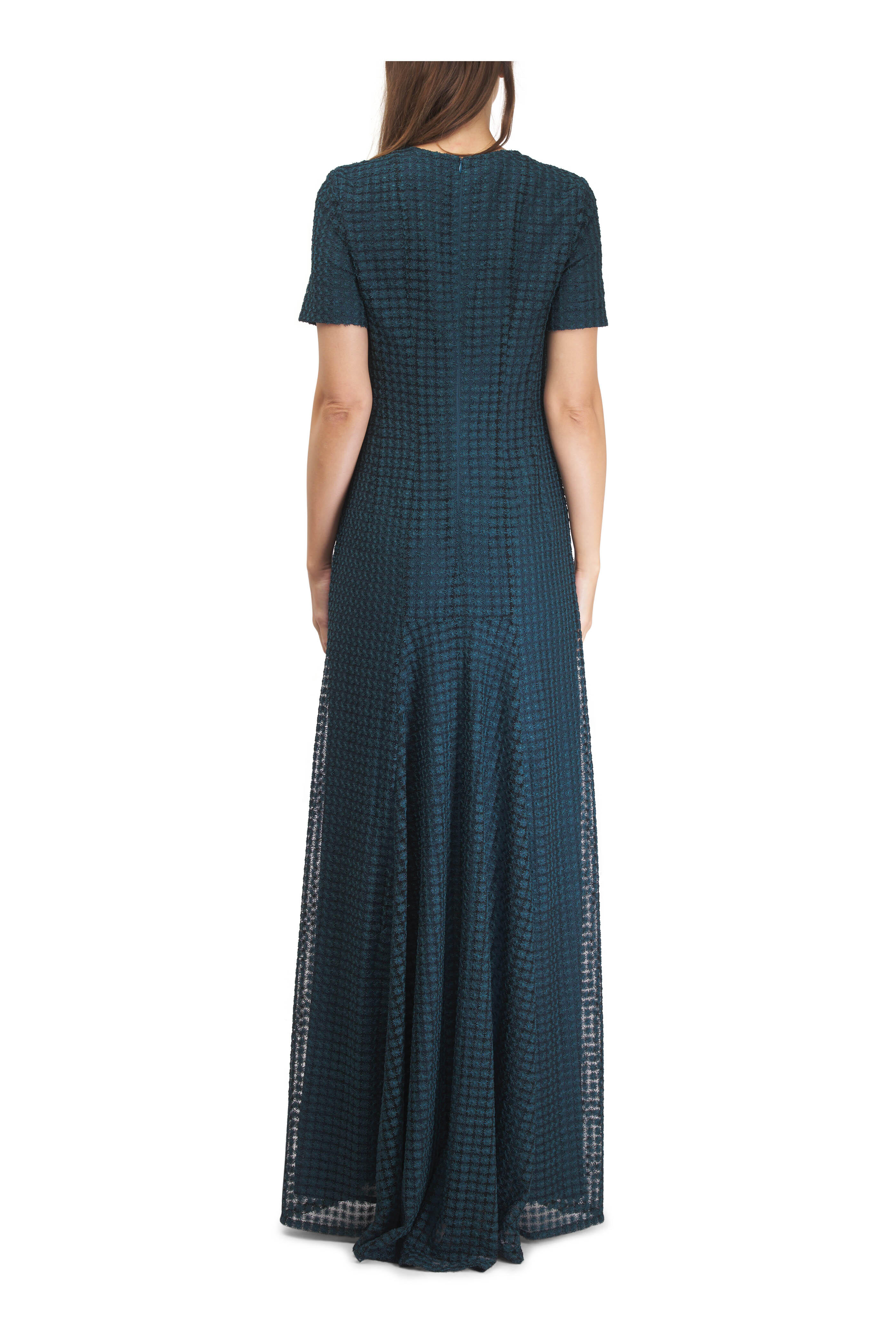 Crew neckline. Concealed back zip. Fabric from Switzerland. Approximately 61" shoulder to hem (measurements taken from size 6). 100% polyester; lined. Dry clean.