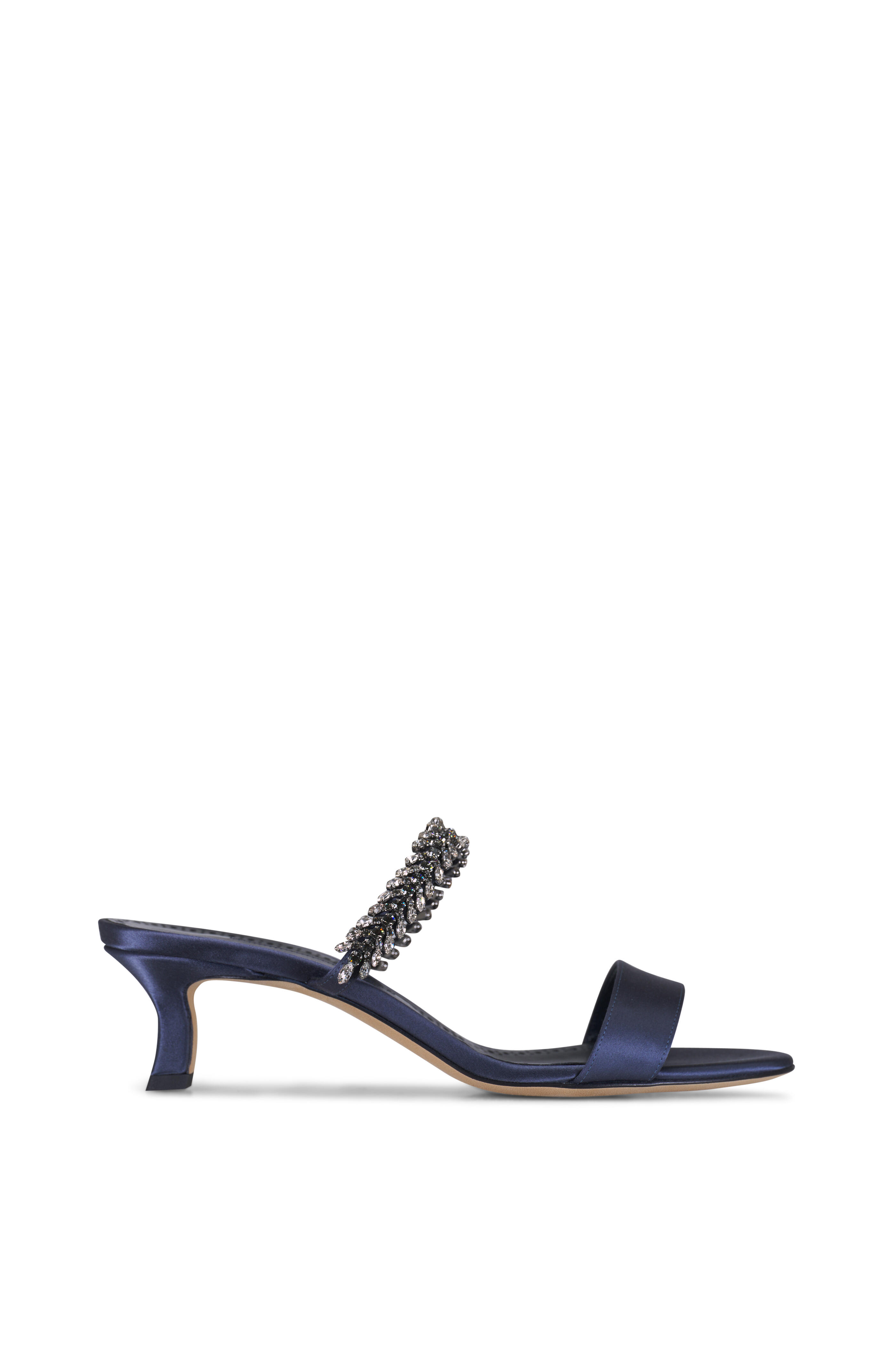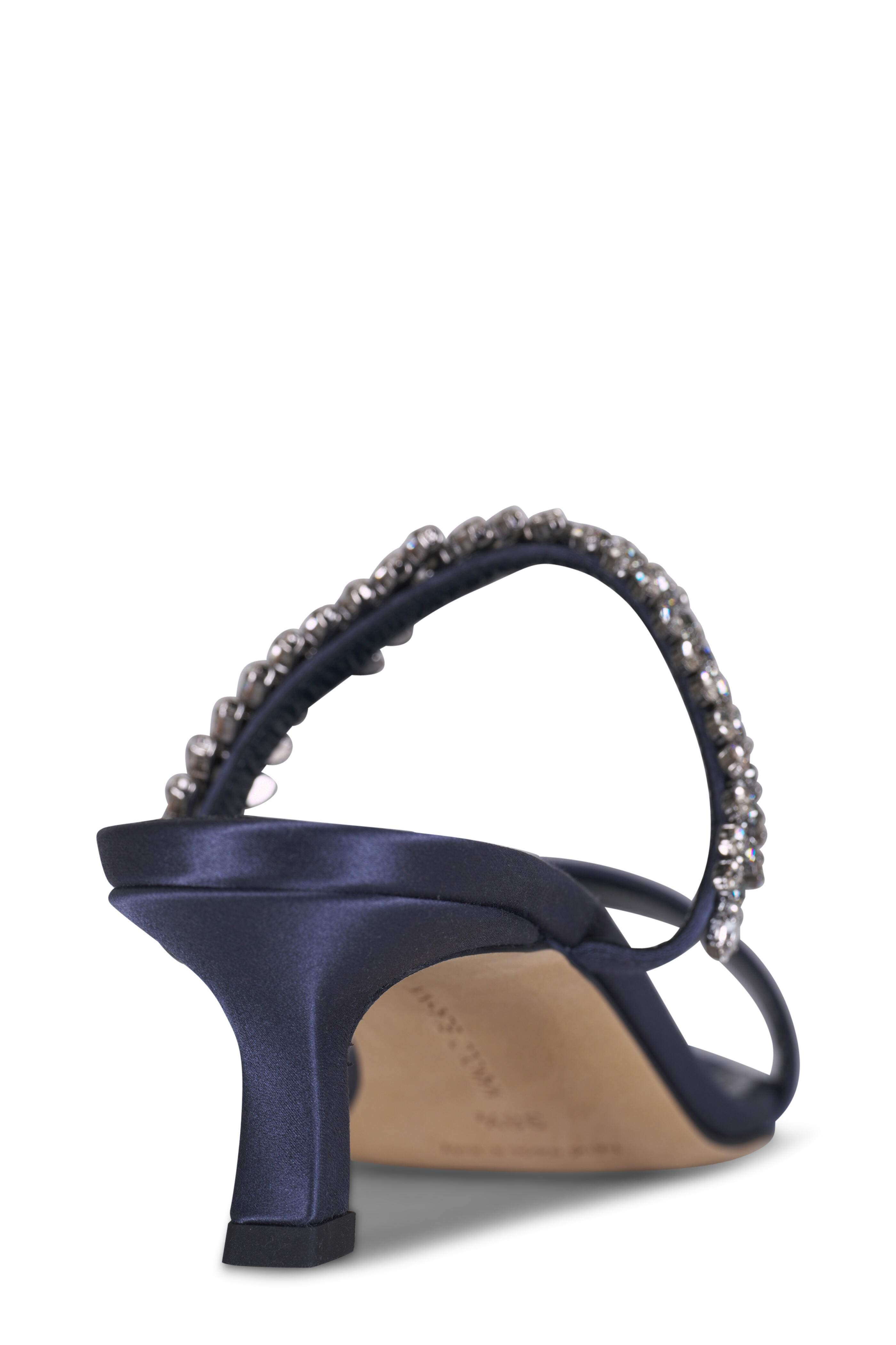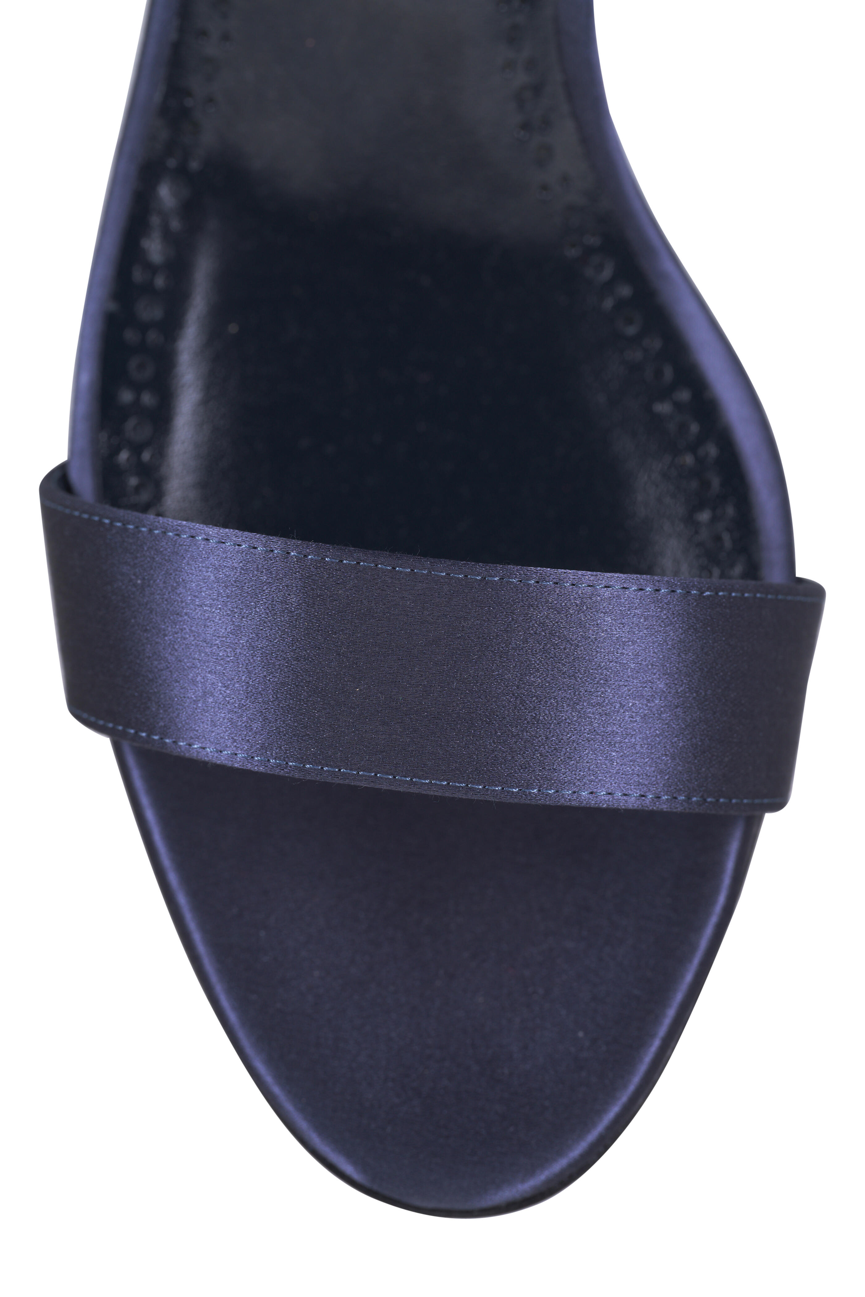 Satin upper. Open toe. Slip on style. Crystal embellishments on front strap. Leather lining and insole. Leather sole. Made in Italy. Heel measurements: 50mm.