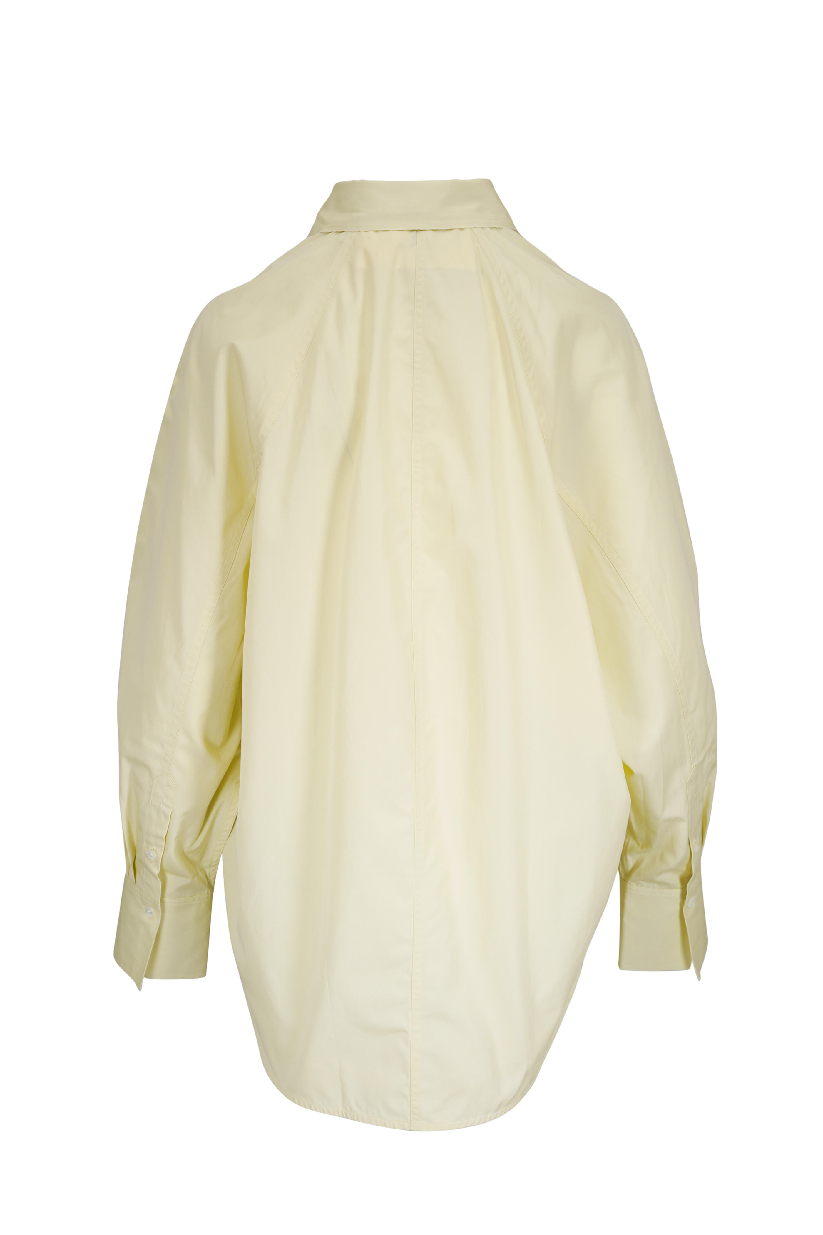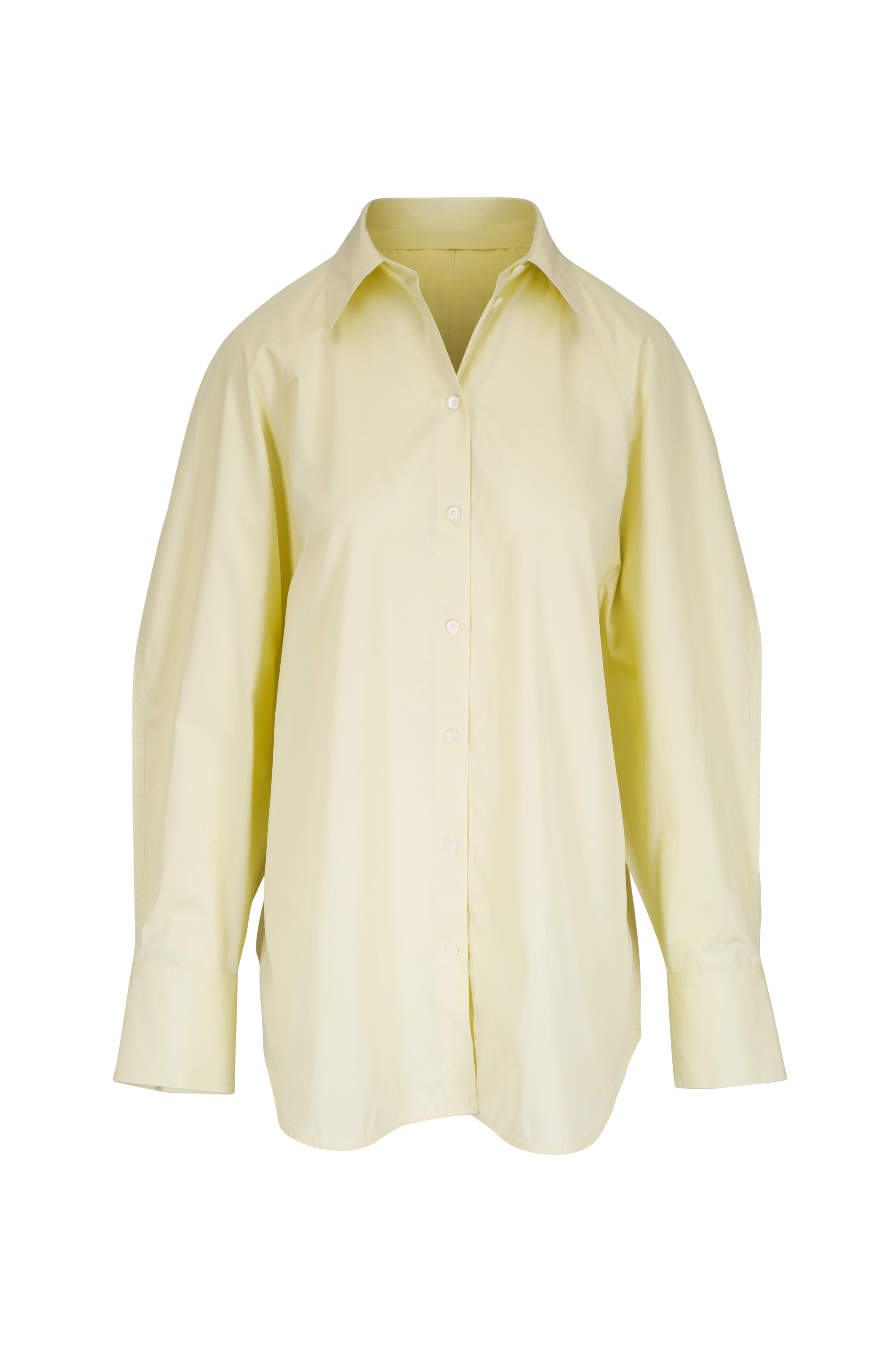 Spread collar. Front button placket. Single button cuffs. Raglan sleeves. Rounded hem. Raw edges at collar. Imported. Approximately 31" shoulder to hem (measurements taken from size 4). 100% organic cotton. Machine wash.