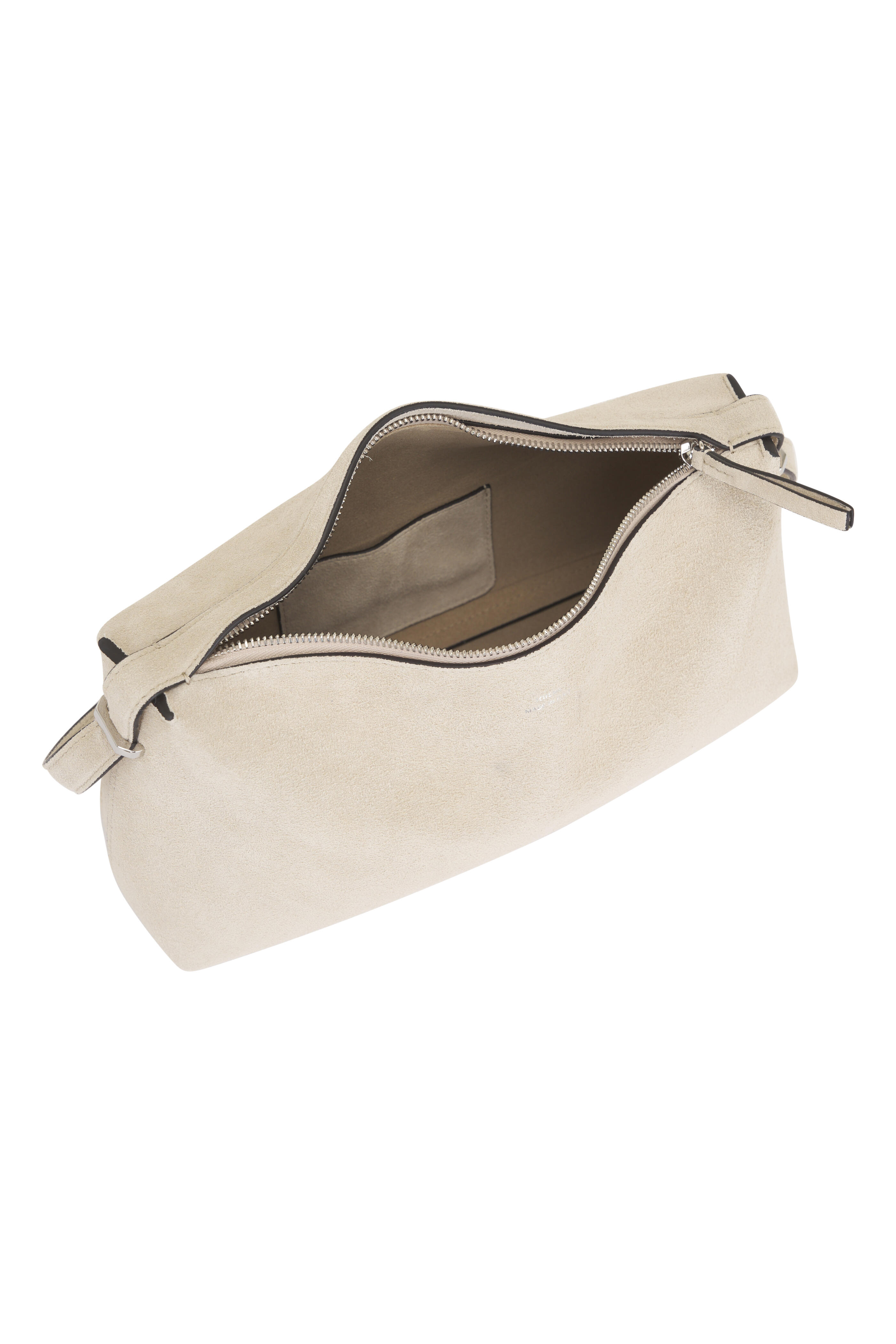 Leather. Top zip closure. Underside belt; gold-tone metal slide clasp. Single compartment; interior wall pocket. Microfiber lining. Made in Italy. Height: 6". Width: 11.4".
