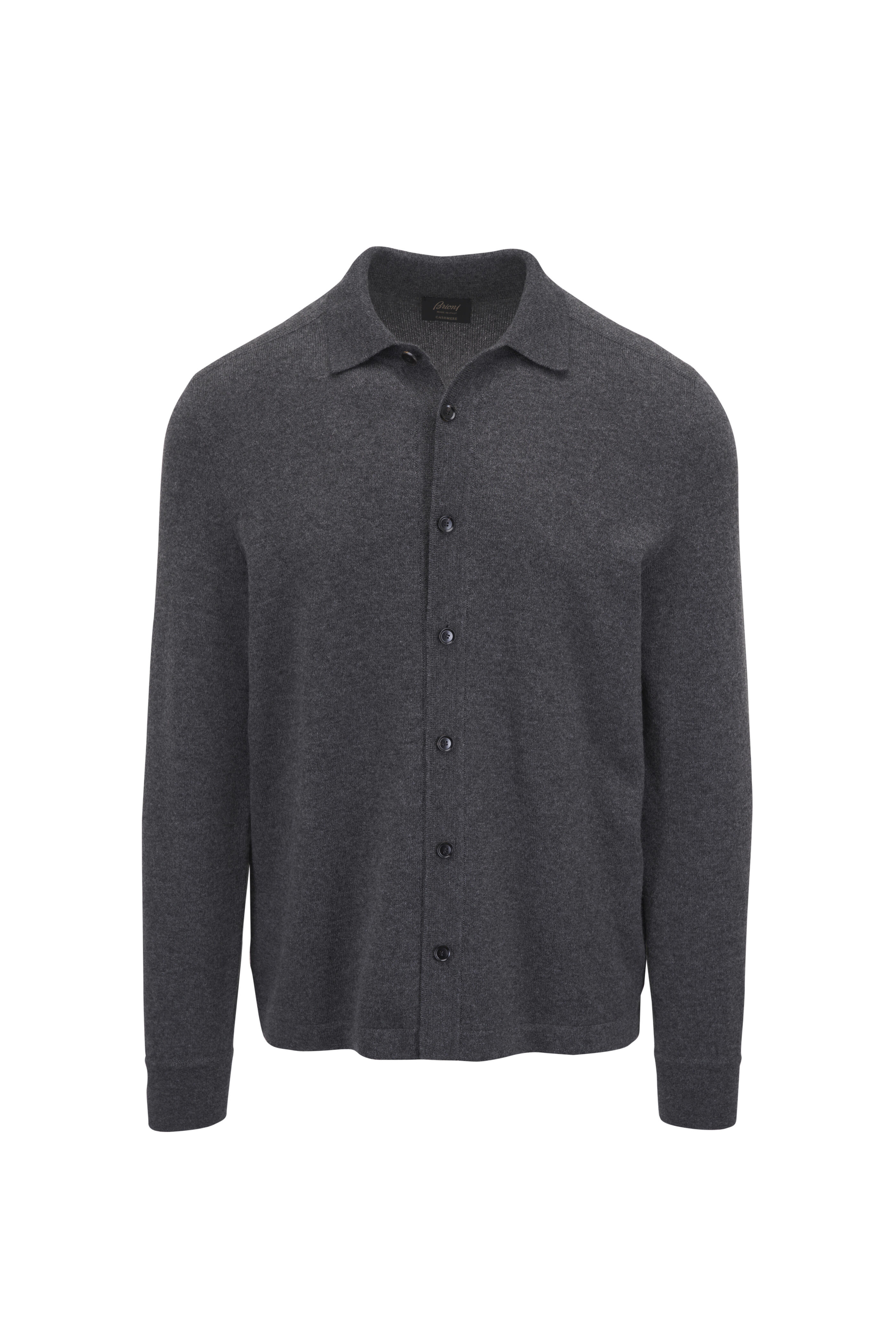Spread collar. Front button placket. Single button cuffs. Made in Italy. 100% cashmere. Machine wash.