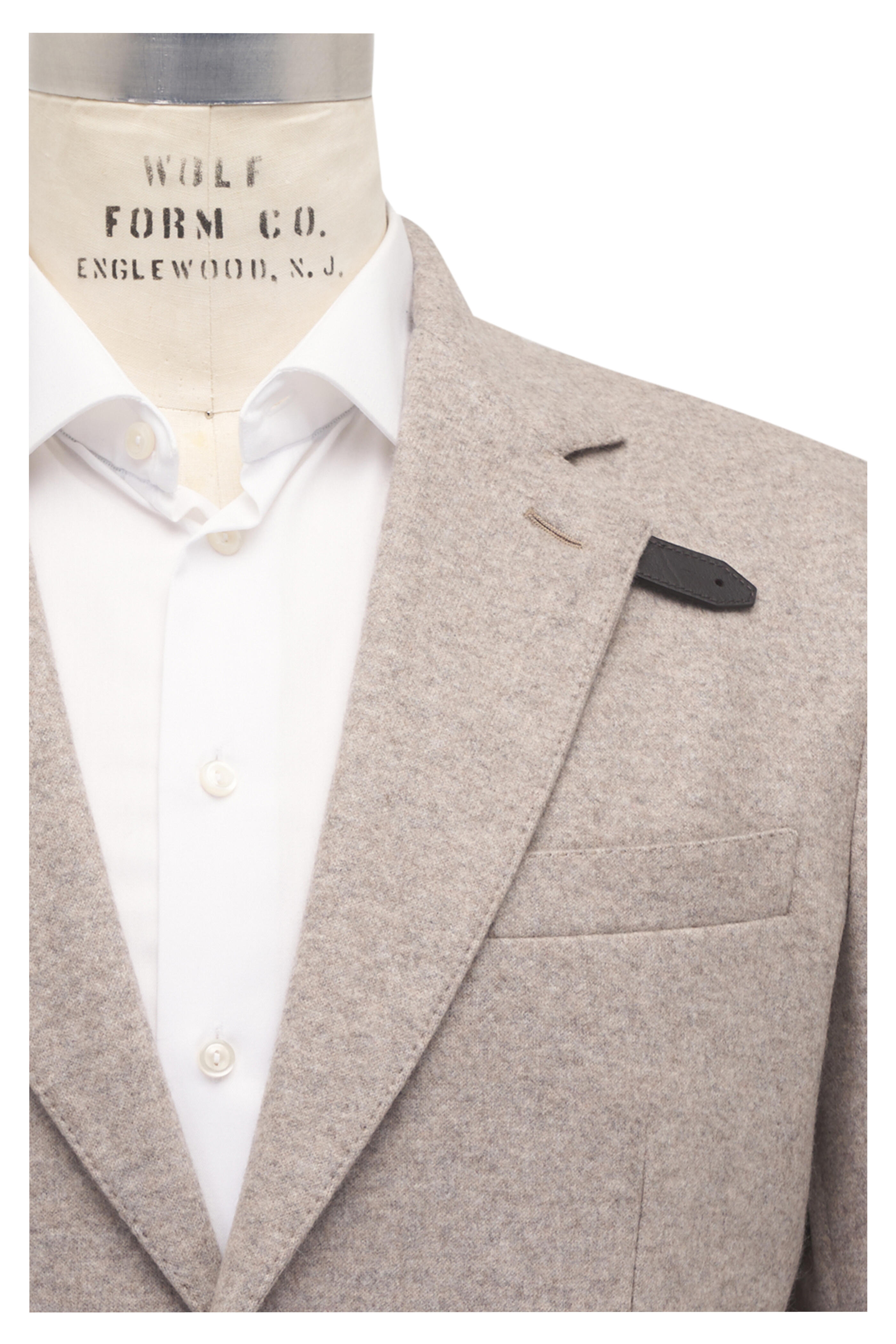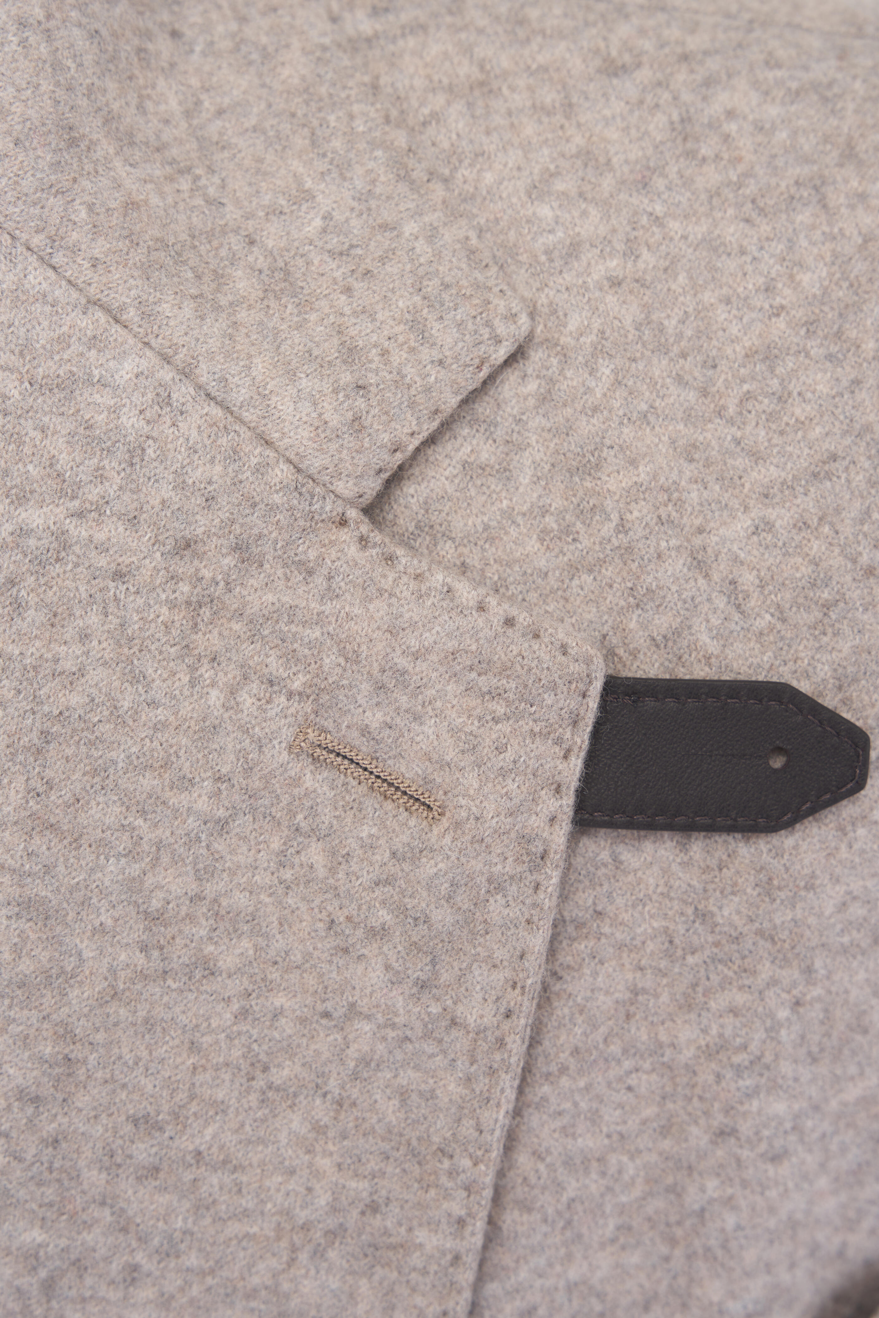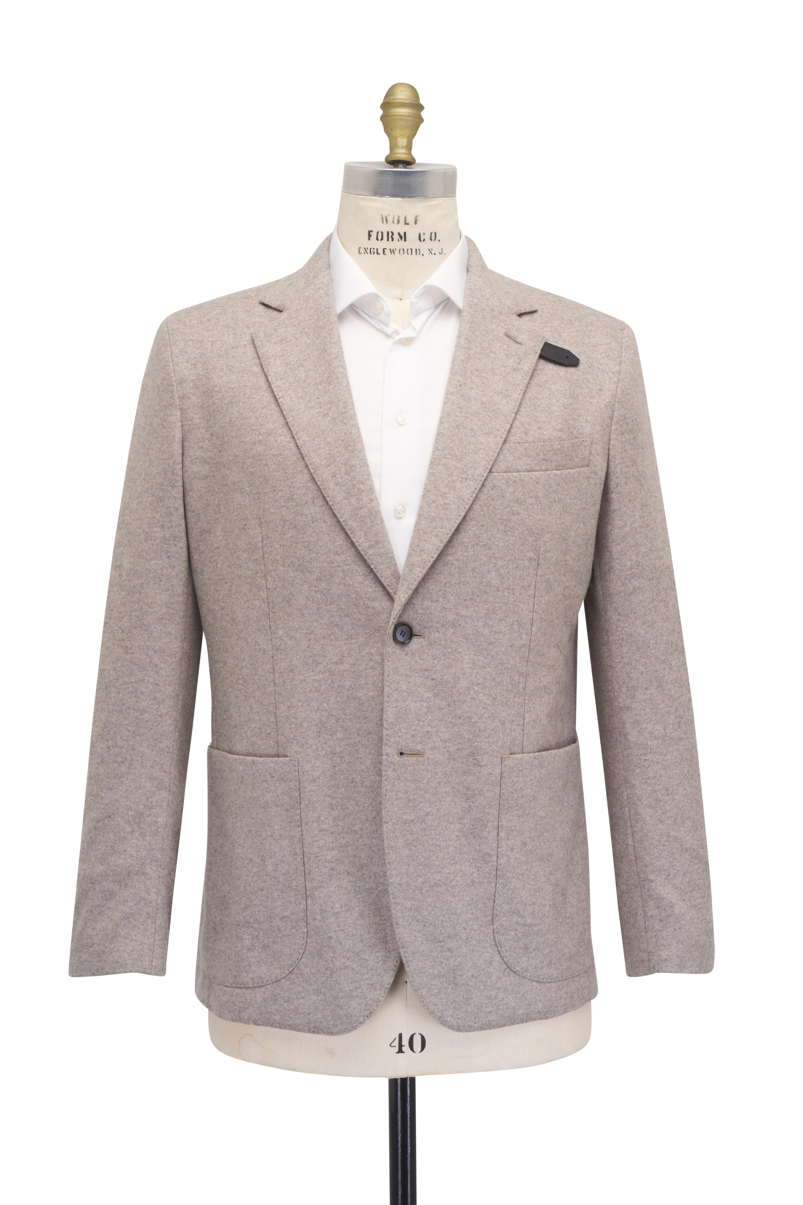 Notched lapels. Two button closure. Chest welt pocket; lower waist patch pockets; interior button pocket. Buttons attached. Double vent. Made in Italy. 100% cashmere; partially lined. Dry clean.