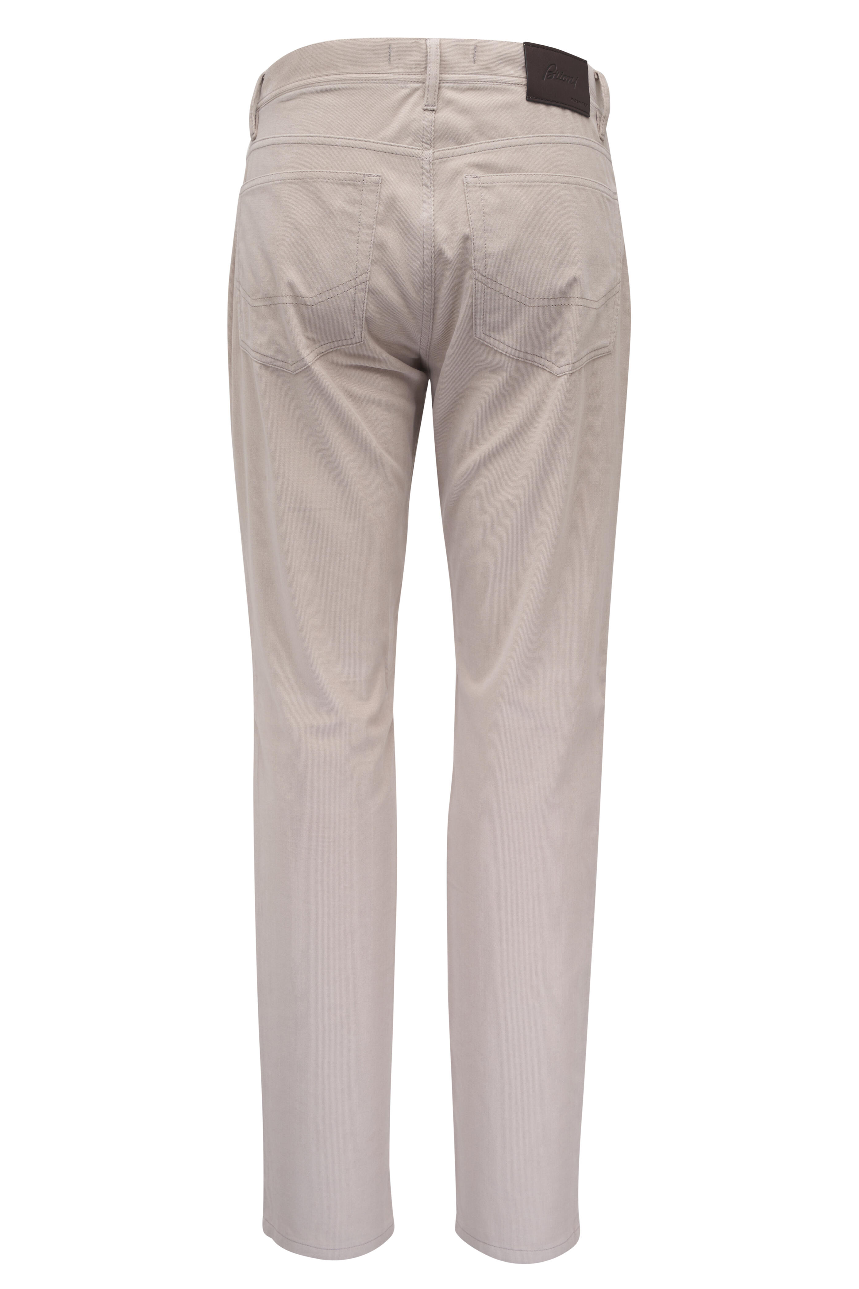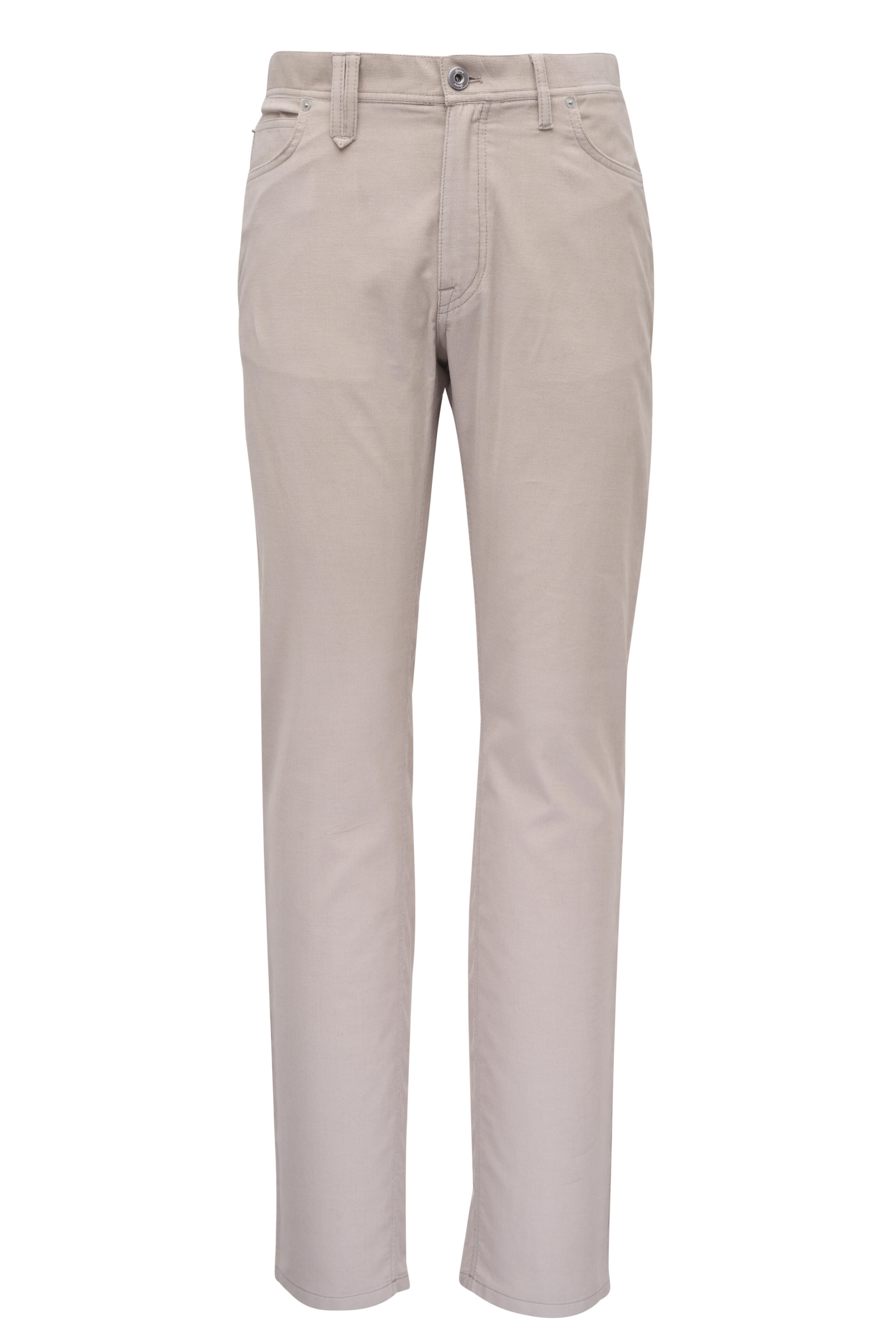 Zip fly; button closure. Banded waist; belt loops. Five pocket styling. Made in Italy. Inseam 34". 90% cotton, 10% cashmere. Machine wash.