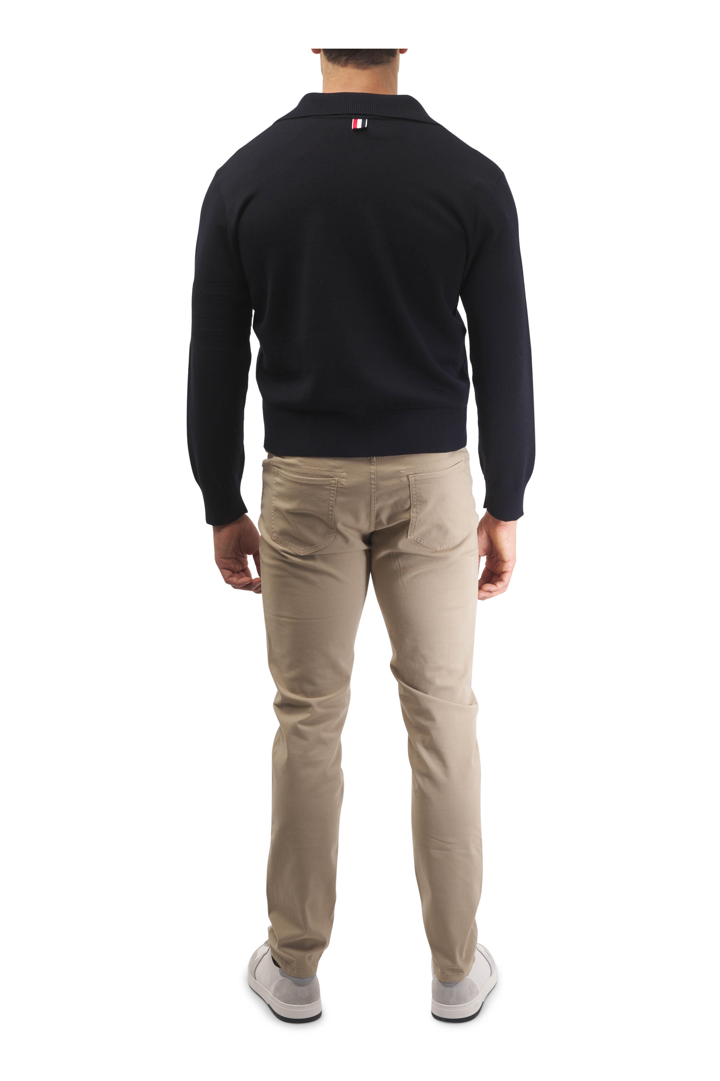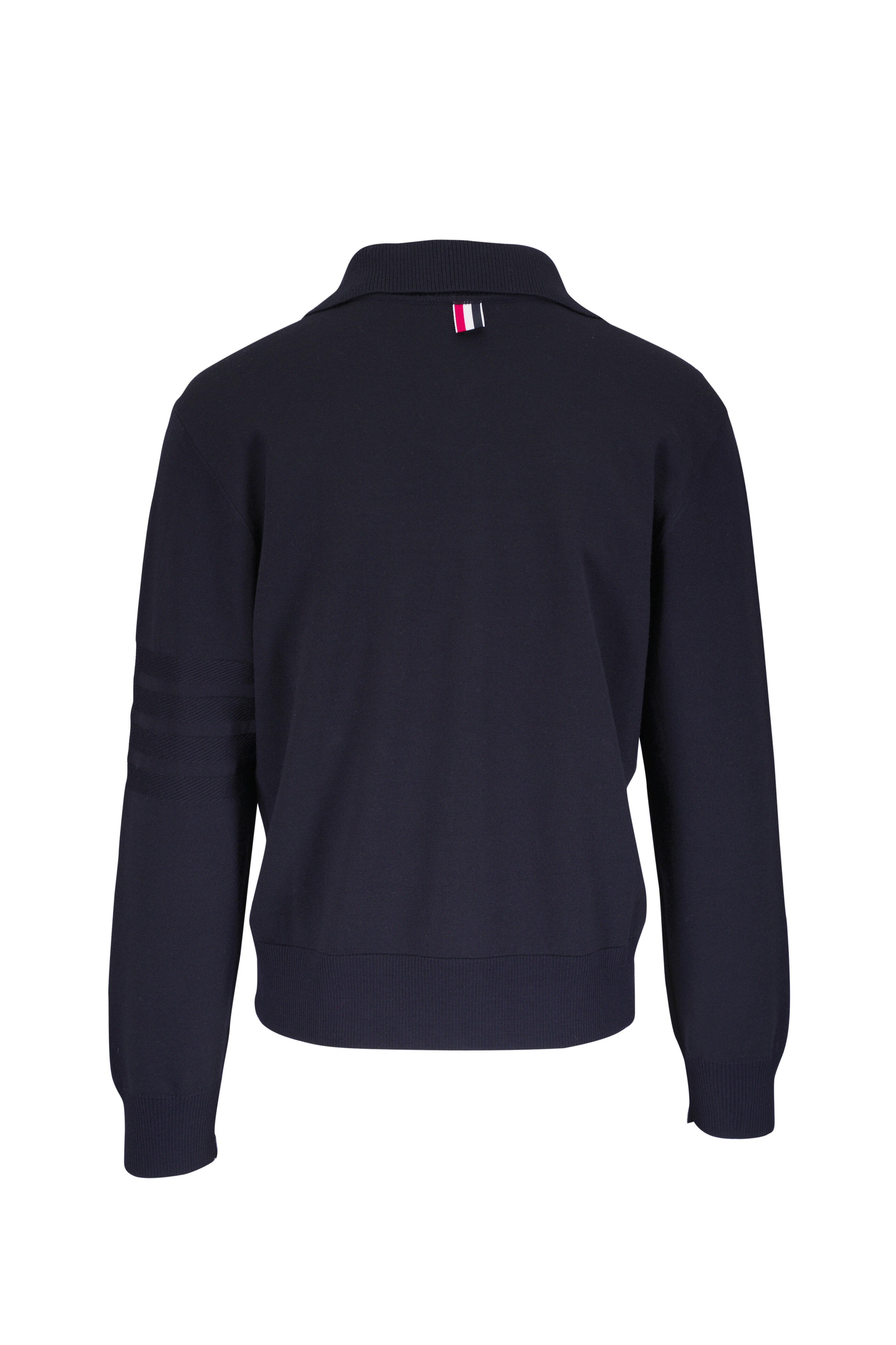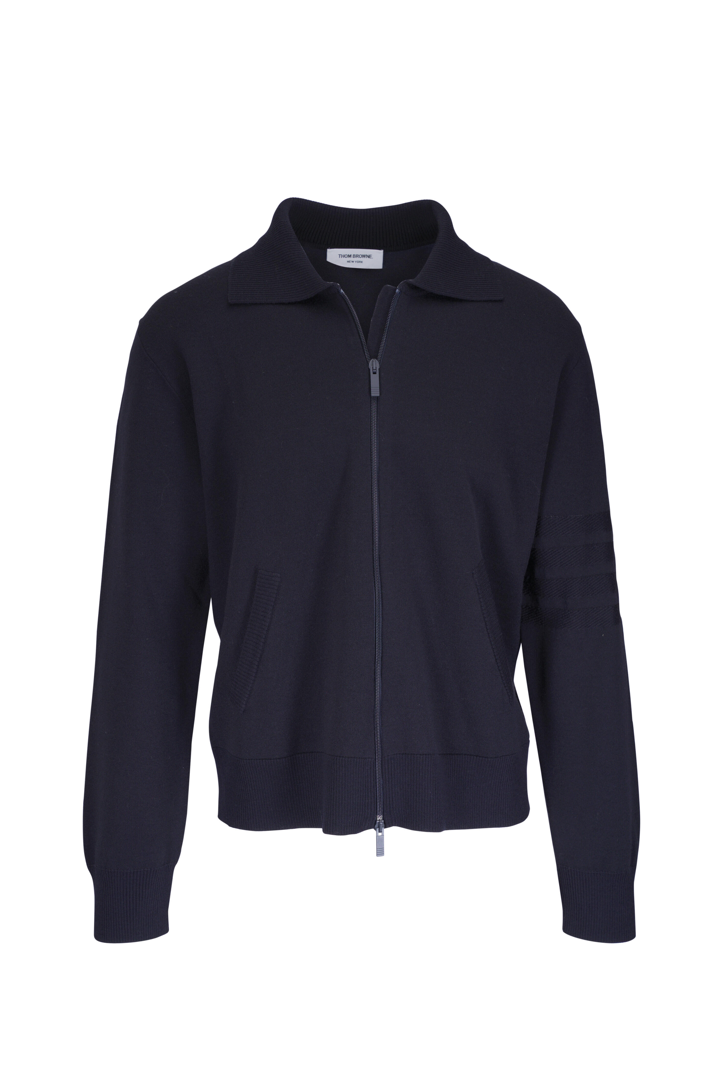Spread collar. Two way zip. Ribbed trims. Lower slip pockets. Tonal 4-bar stripe on the left sleeve. Straight hem. Made in Italy. Shoulder to hem 25" (size l). 68% Virgin wool, 20% linen, 9% cotton, 3% polyamide. Hand wash.