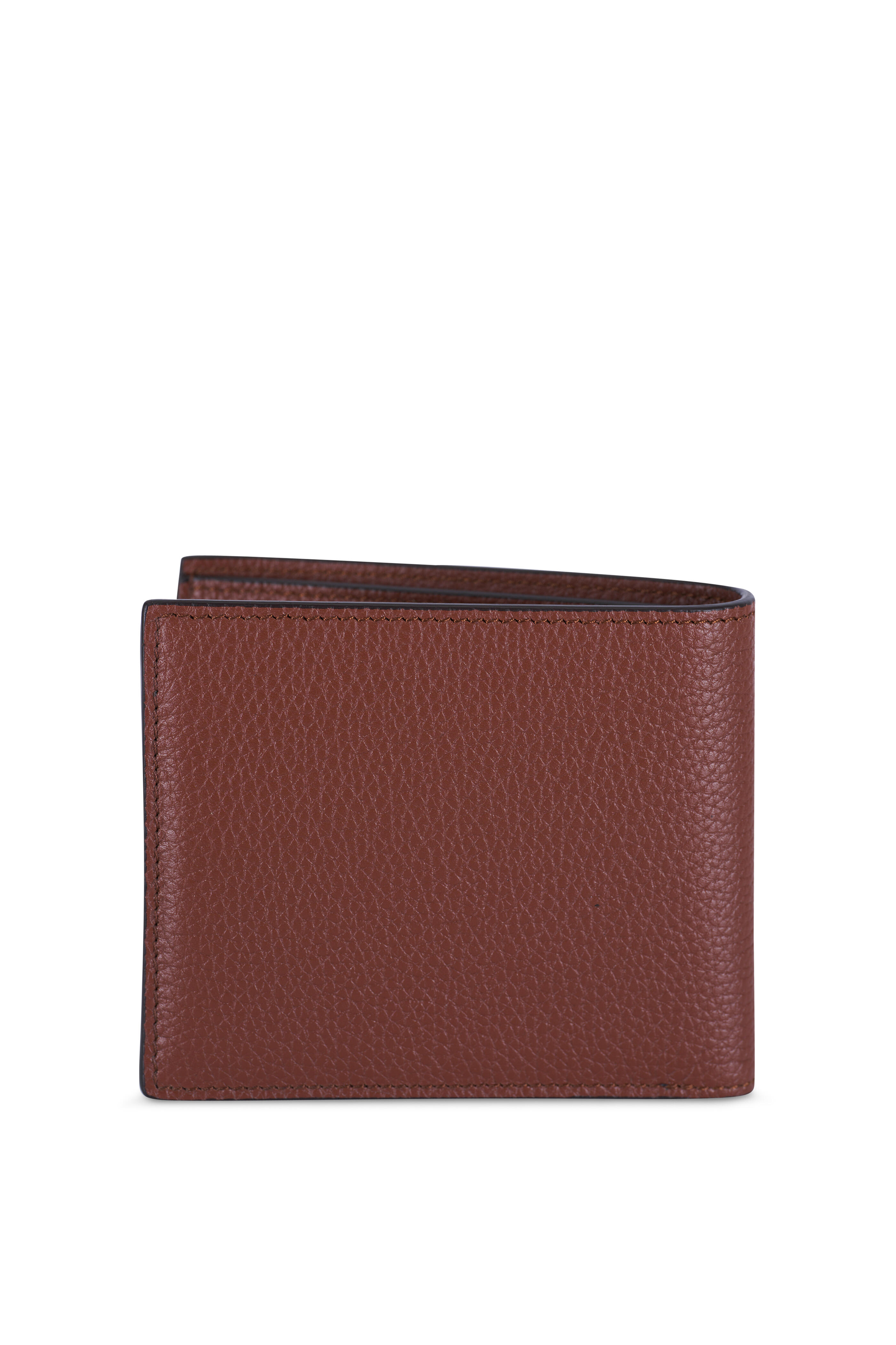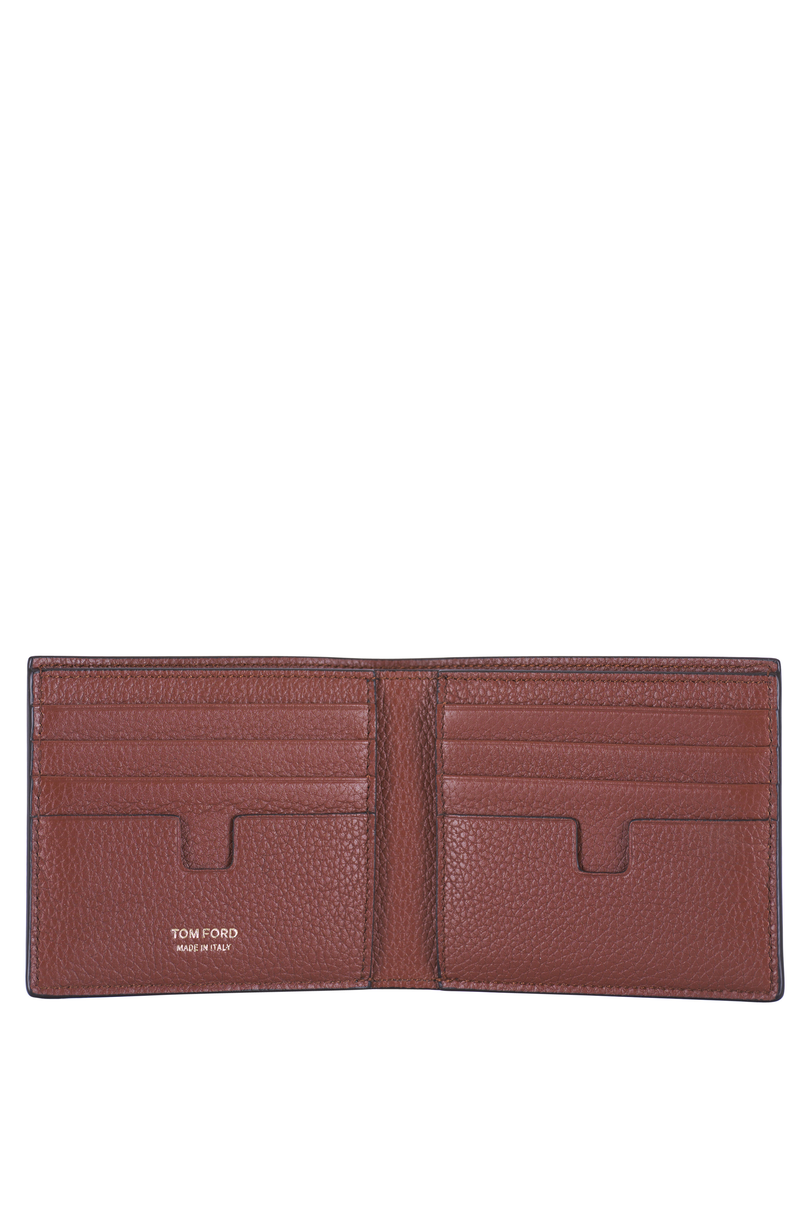 Grained calfskin leather. Eight card slots. Single full-length bill compartment. Interior two wall pockets. Gold embossed logo details on exterior and interior. Made in Italy. Width: 4 ½". Height: 3 ¾".