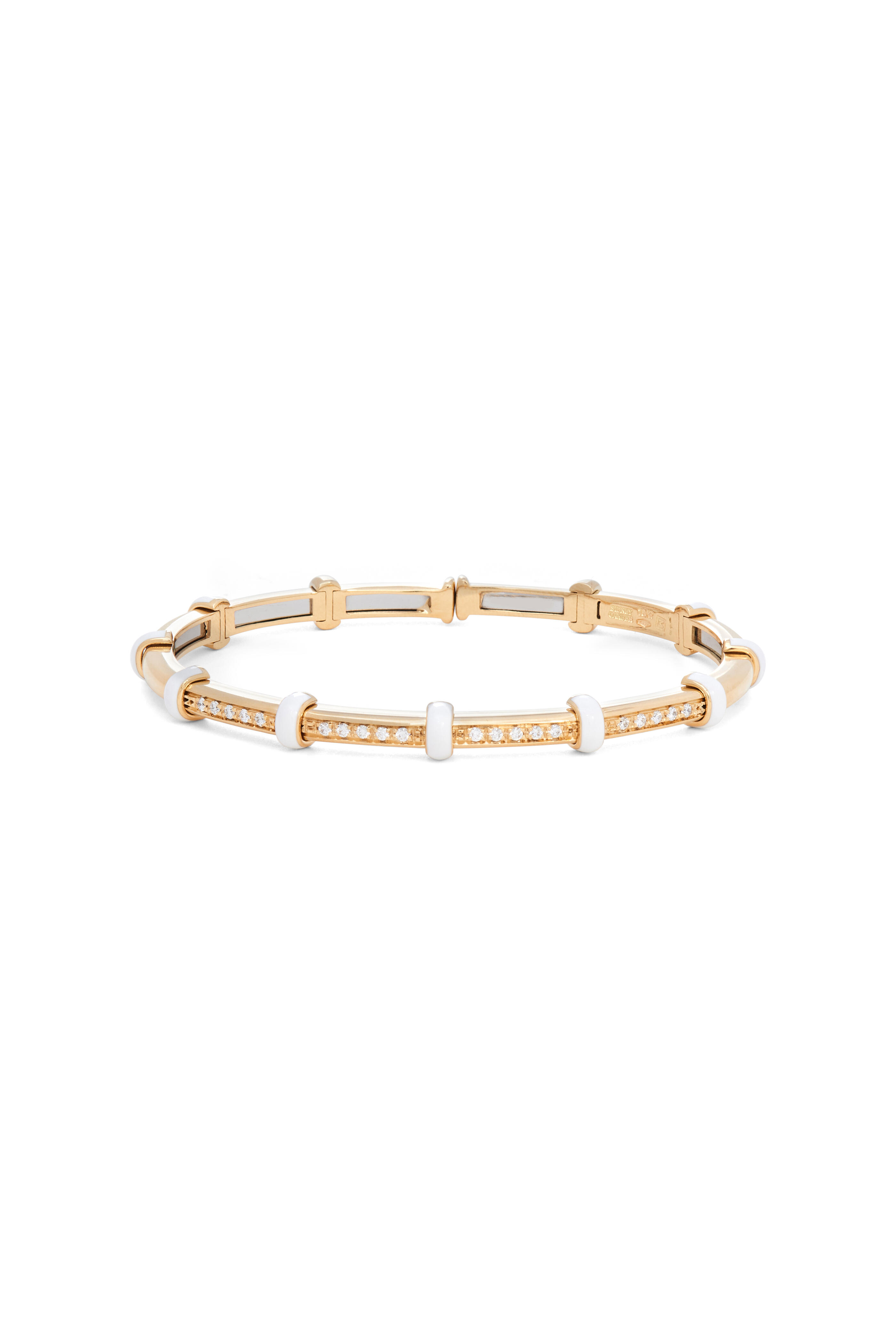 18k yellow gold. .21 carat diamonds. White enamel. 55x45mm.